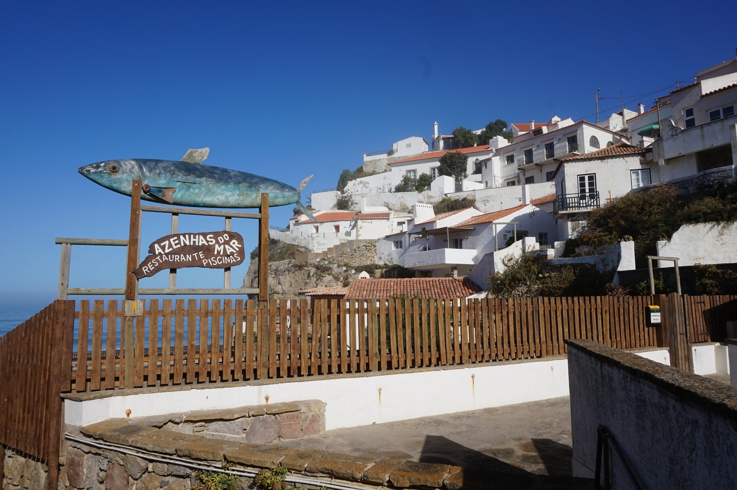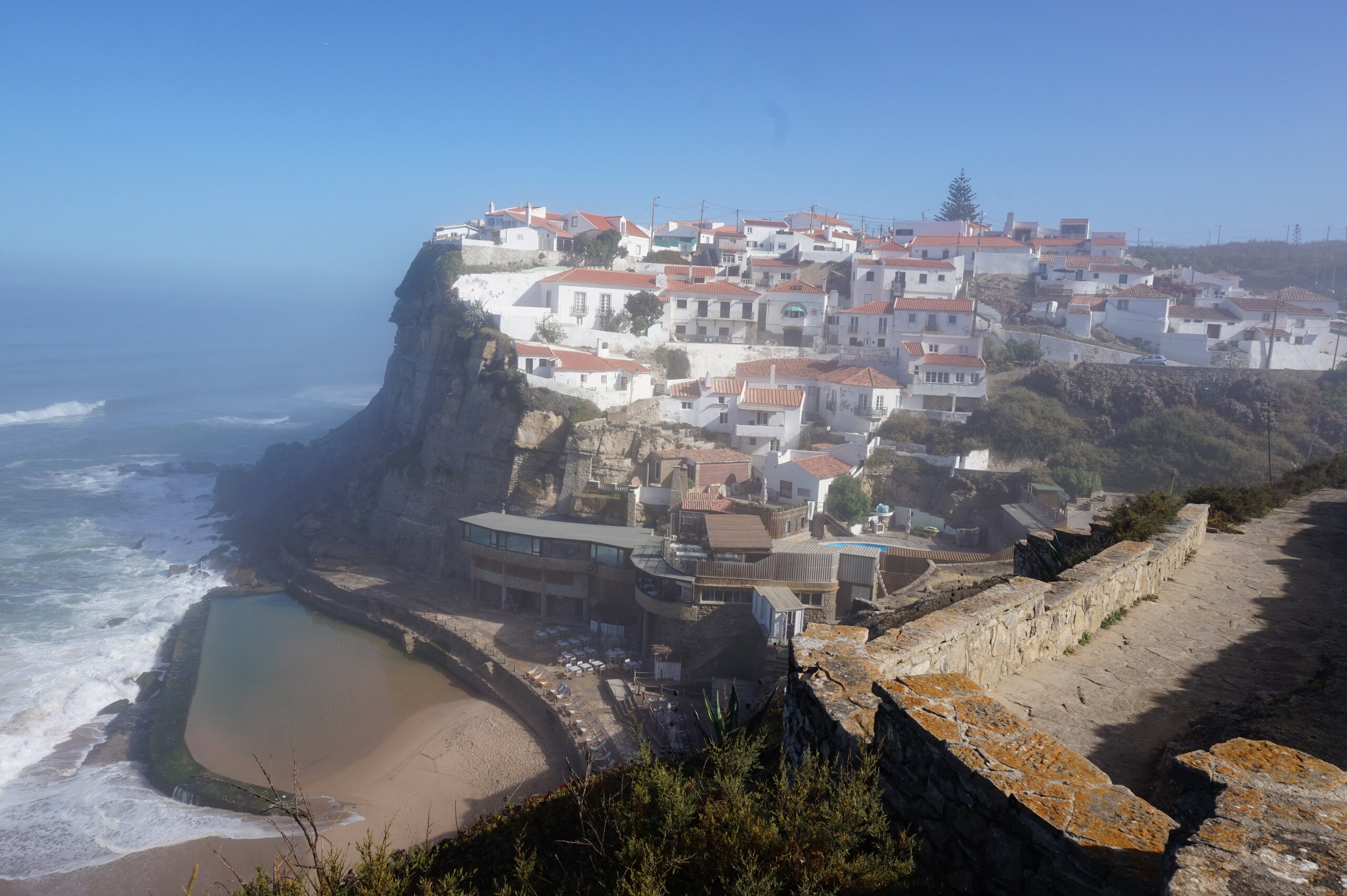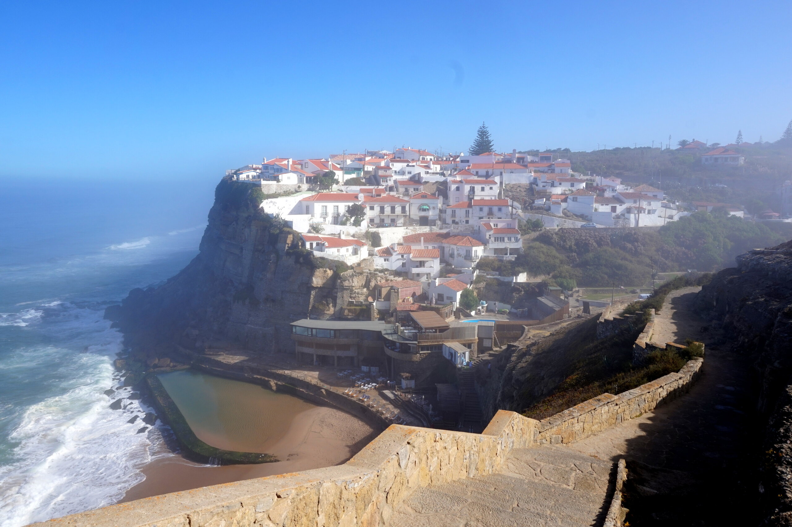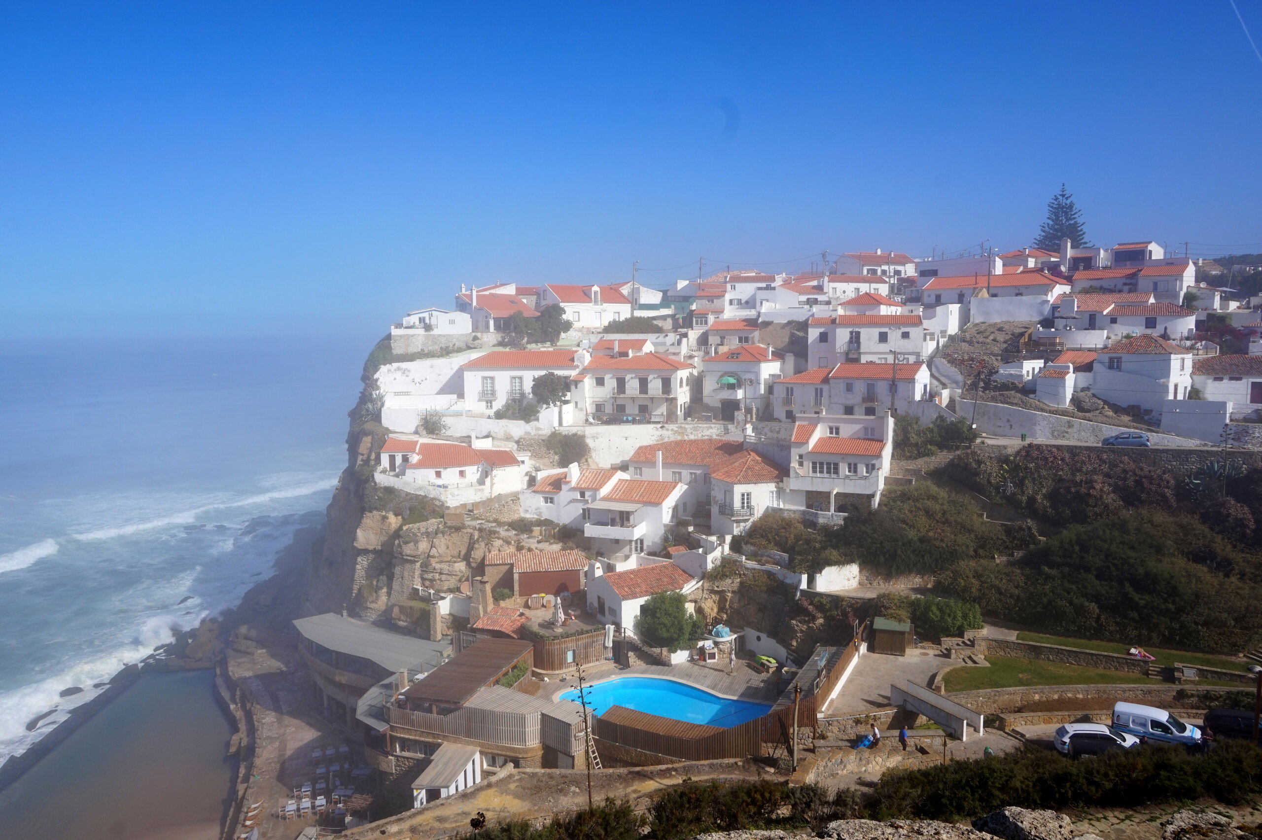 Каламбака- Азенхас-ду-Мар. Всего лишь одна фотография этого городка в путеводителе заставила нас включить его в наш план. Из Лиссабона на электричке, потом на автобусе, и вот мы в Азенхас-ду-Мар. Остановка автобуса. Название города переводится как «морская мельница». Постоянное население составляет всего 800 человек. Место славится своими виноградниками, здесь растет сорт винограда Ramisco. Жители этого небольшого города так же занимаются ловлей рыбы и моллюсков. Город расположен на скале, внизу раскинулся океан, и со стороны кажется, что город как бы влит в скалу, а некоторые дома как бы балансируют на краю пропасти. Спускаемся к океану, и мы почти одни, наедине с ним. Только пара рыбаков недалеко. Запах рыбы, солёные брызги воды, пена волн- эта картинка до сих пор передо мной. Счастливые мгновения, часто вспоминаю. Планировала искупаться в этом бассейне, но что-то не решилась. И очень хотелось выпить кофе в этом ресторане, но до открытия было ещё несколько часов, не судьба. Поднимаемся, и вот перед нами та картинка из путеводителя, которая привела нас сюда.