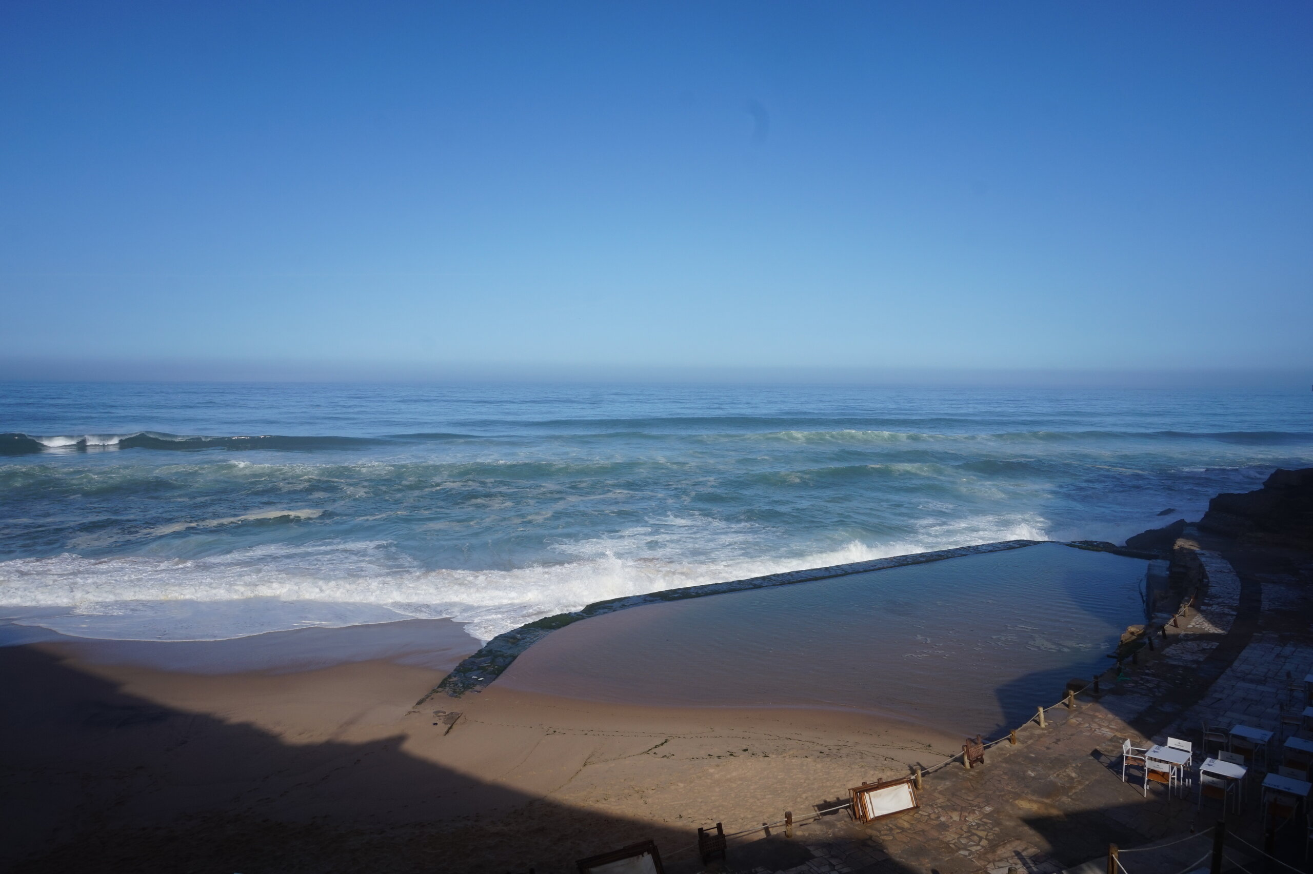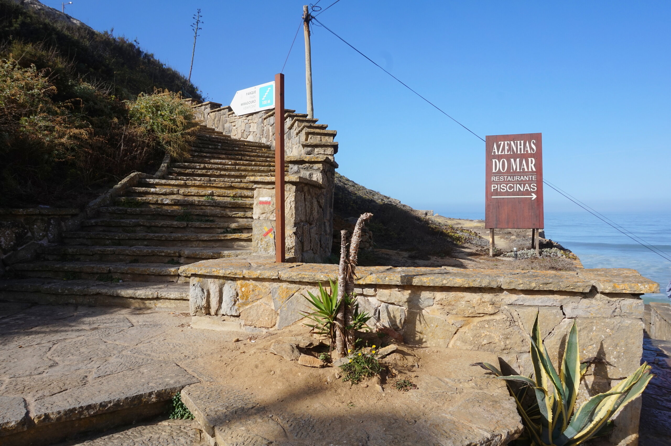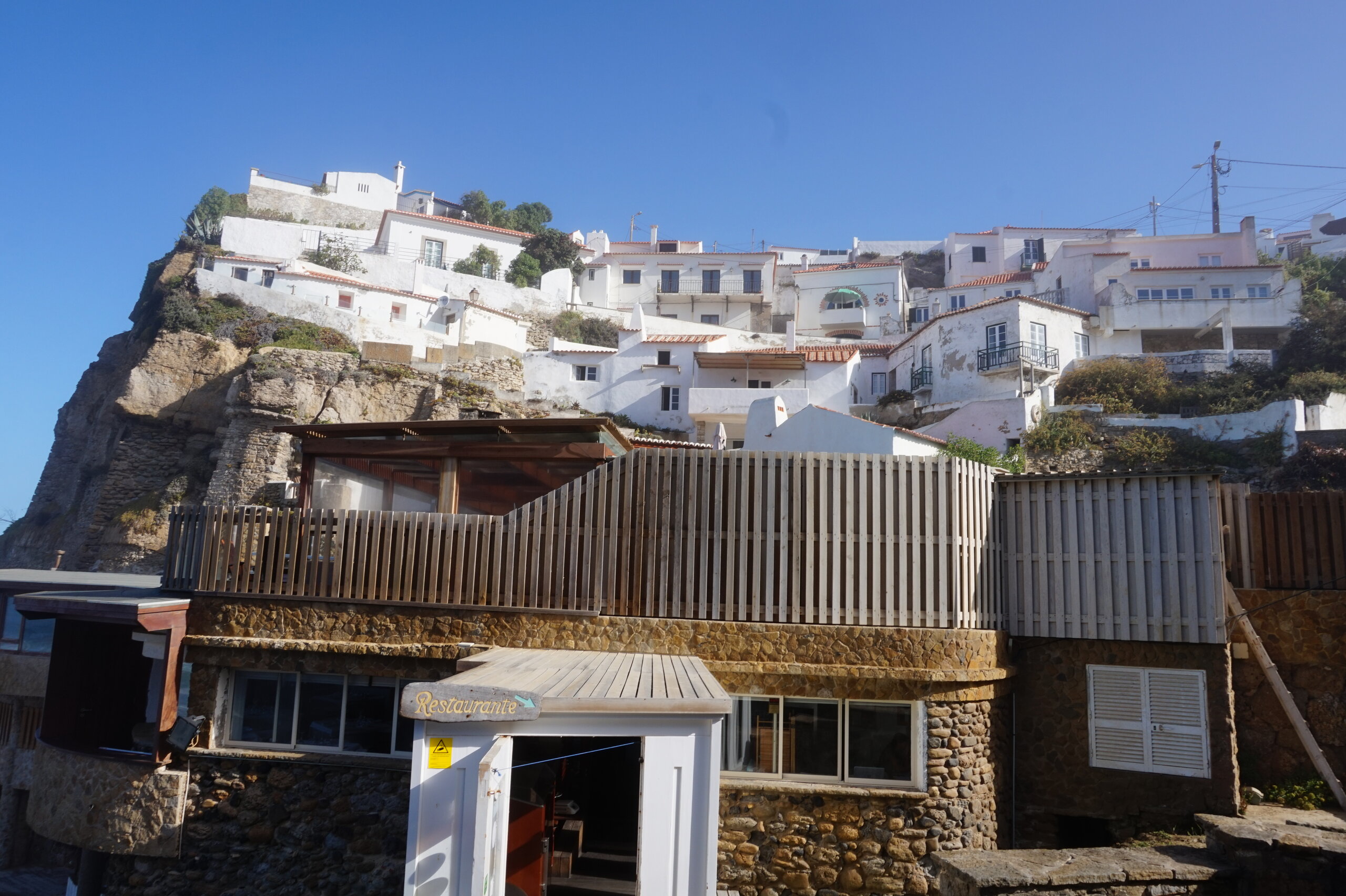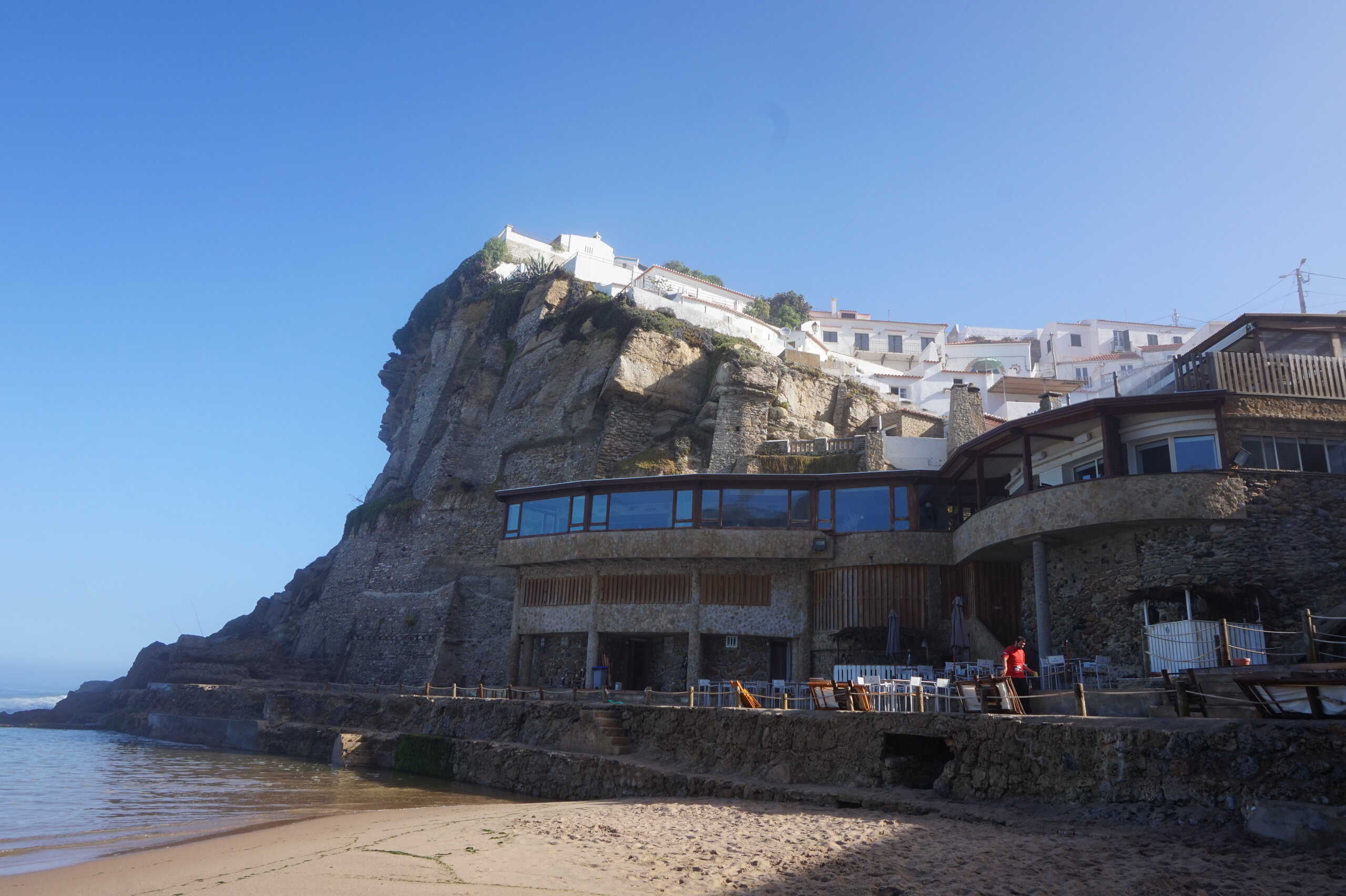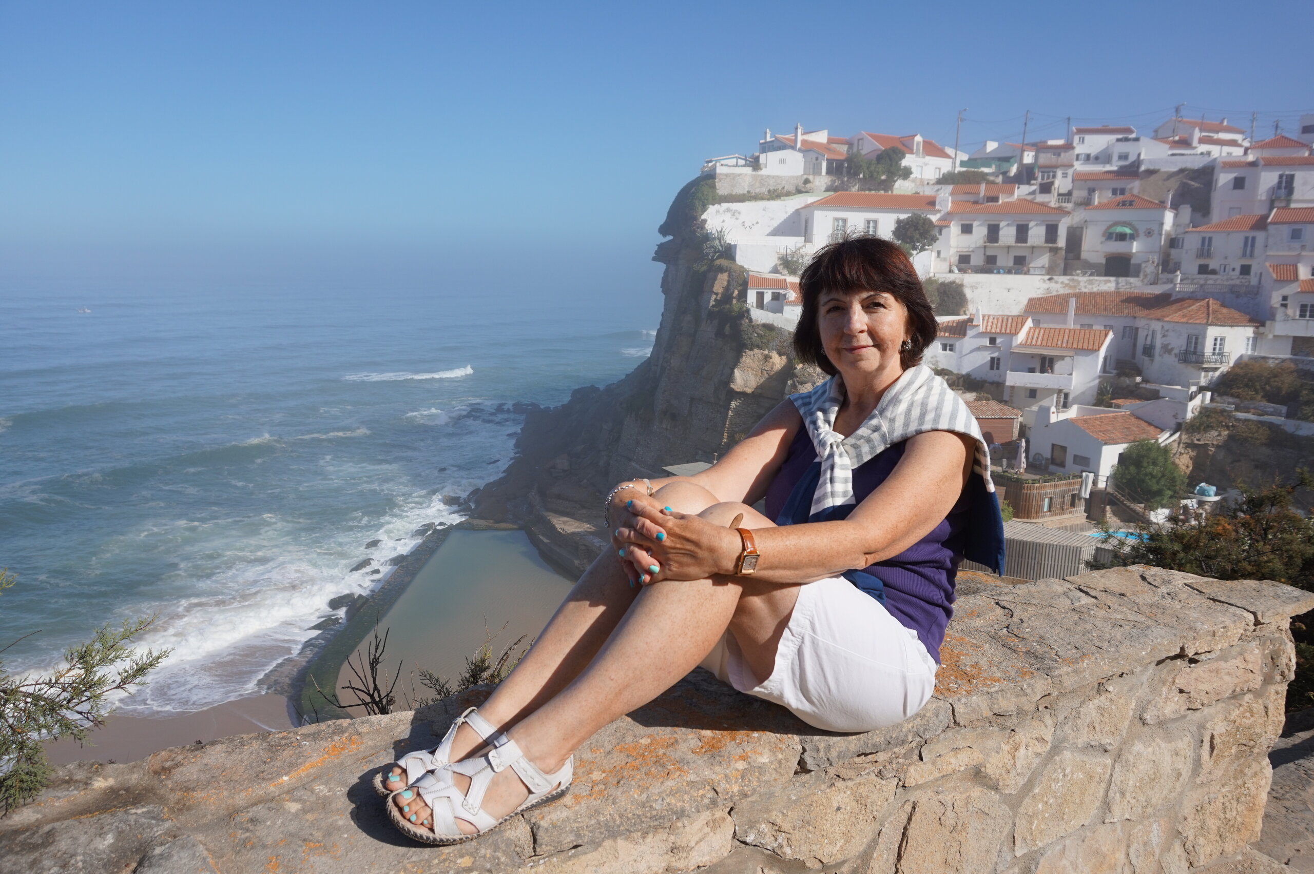 Каламбака- Азенхас-ду-Мар. Всего лишь одна фотография этого городка в путеводителе заставила нас включить его в наш план. Из Лиссабона на электричке, потом на автобусе, и вот мы в Азенхас-ду-Мар. Остановка автобуса. Название города переводится как «морская мельница». Постоянное население составляет всего 800 человек. Место славится своими виноградниками, здесь растет сорт винограда Ramisco. Жители этого небольшого города так же занимаются ловлей рыбы и моллюсков. Город расположен на скале, внизу раскинулся океан, и со стороны кажется, что город как бы влит в скалу, а некоторые дома как бы балансируют на краю пропасти. Спускаемся к океану, и мы почти одни, наедине с ним. Только пара рыбаков недалеко. Запах рыбы, солёные брызги воды, пена волн- эта картинка до сих пор передо мной. Счастливые мгновения, часто вспоминаю. Планировала искупаться в этом бассейне, но что-то не решилась. И очень хотелось выпить кофе в этом ресторане, но до открытия было ещё несколько часов, не судьба. Поднимаемся, и вот перед нами та картинка из путеводителя, которая привела нас сюда.