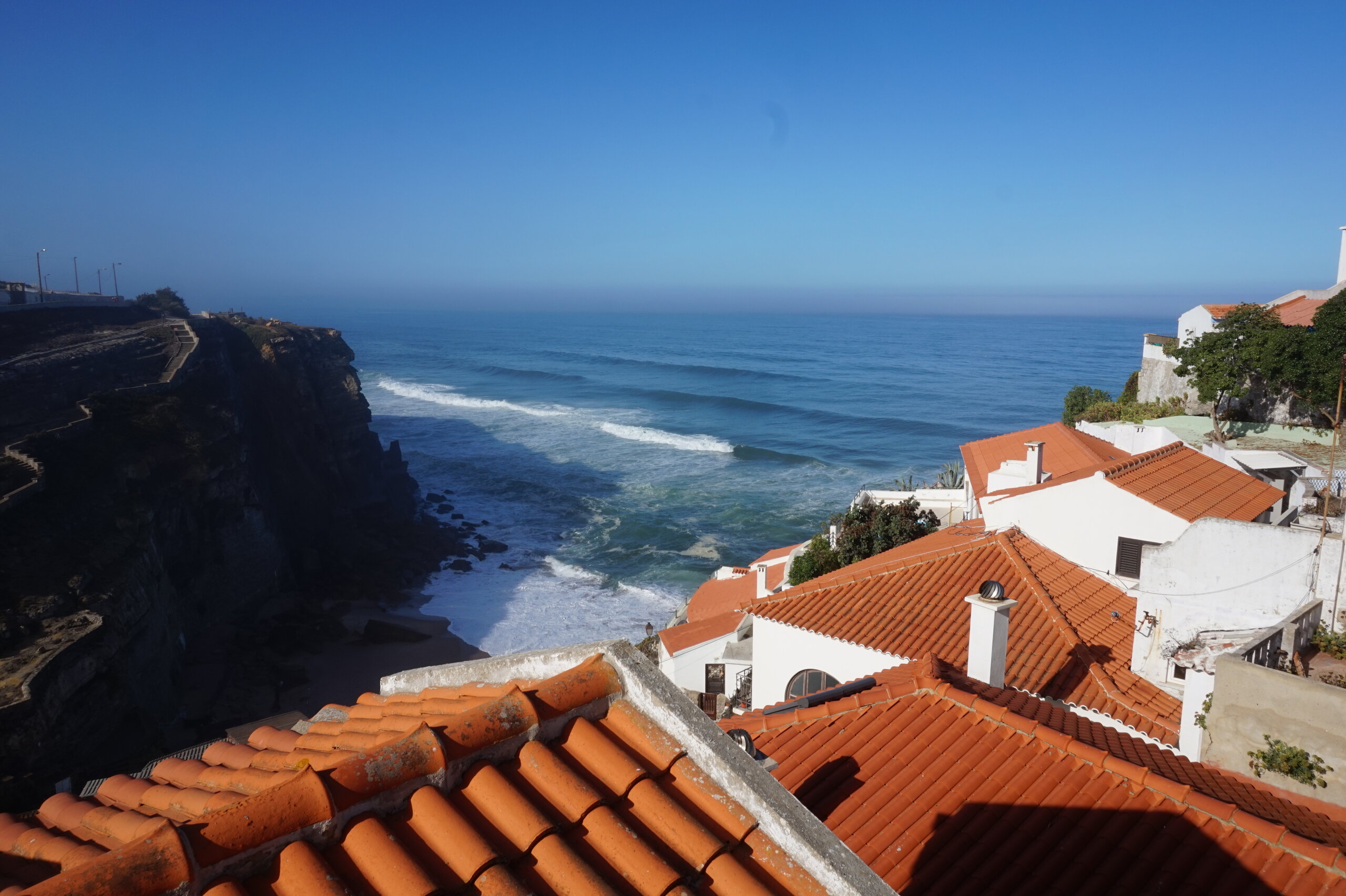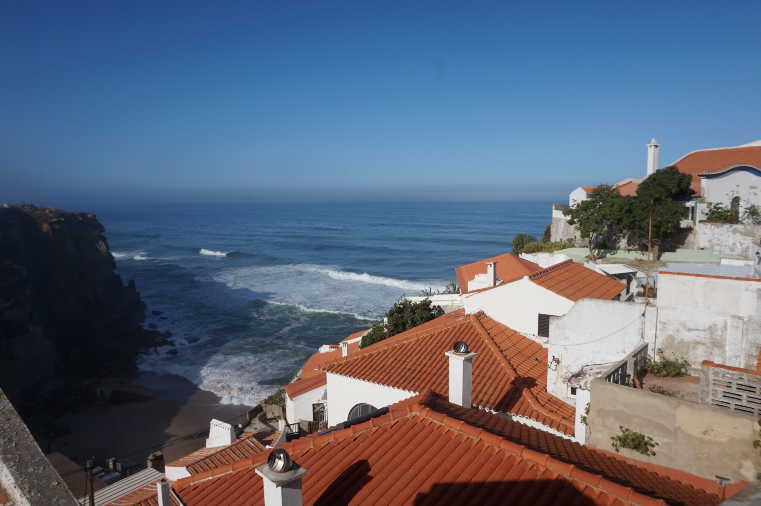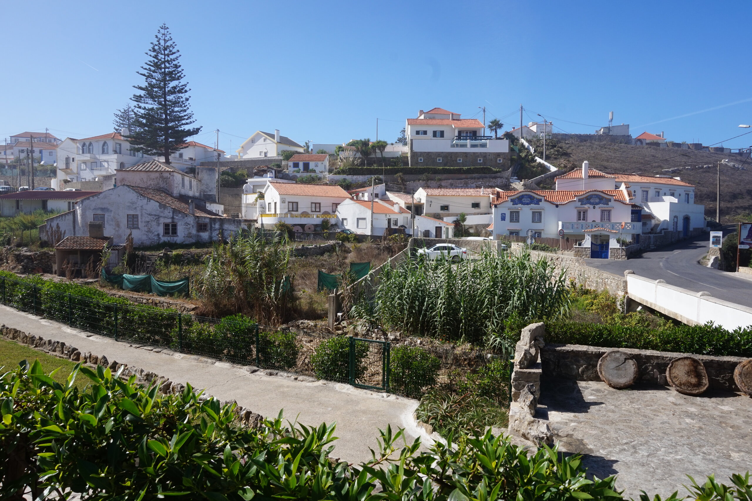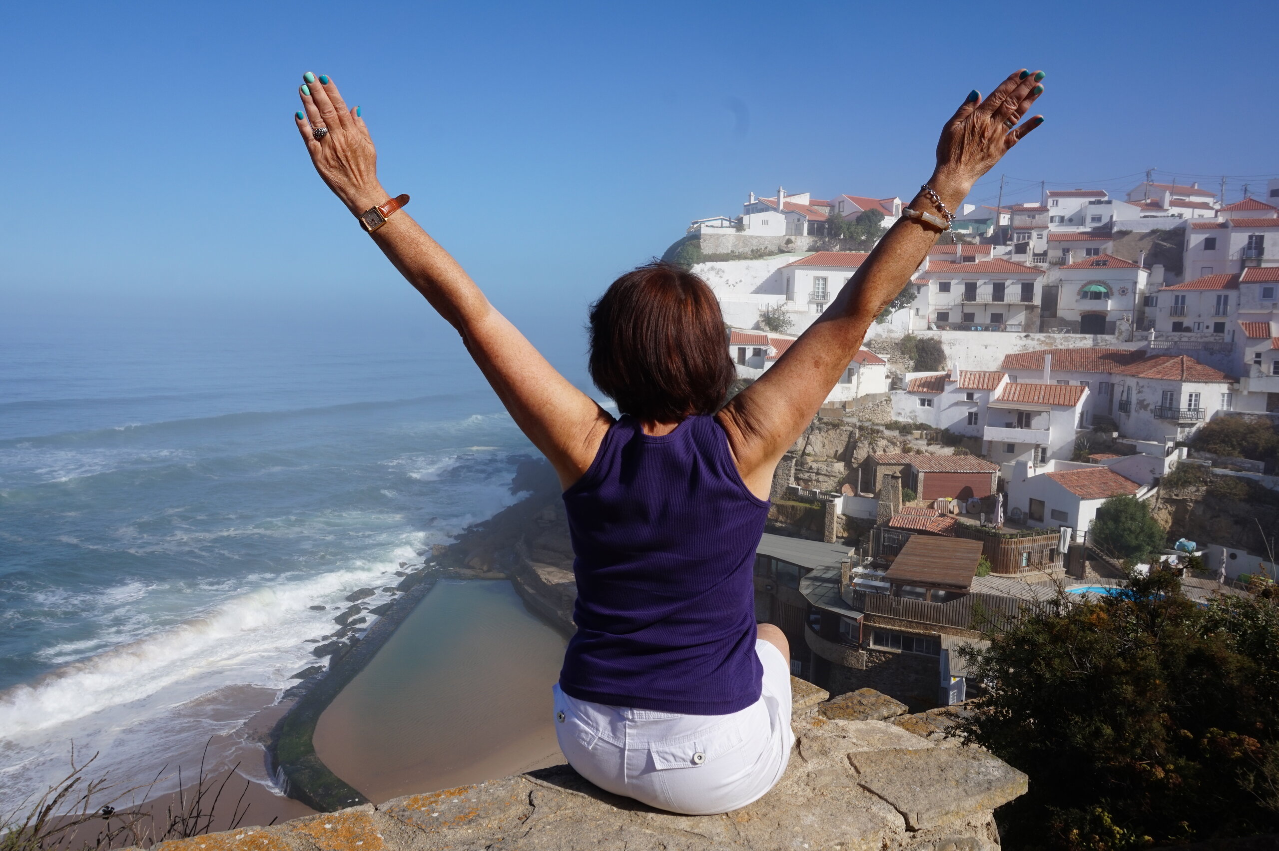 Каламбака- Азенхас-ду-Мар. Всего лишь одна фотография этого городка в путеводителе заставила нас включить его в наш план. Из Лиссабона на электричке, потом на автобусе, и вот мы в Азенхас-ду-Мар. Остановка автобуса. Название города переводится как «морская мельница». Постоянное население составляет всего 800 человек. Место славится своими виноградниками, здесь растет сорт винограда Ramisco. Жители этого небольшого города так же занимаются ловлей рыбы и моллюсков. Город расположен на скале, внизу раскинулся океан, и со стороны кажется, что город как бы влит в скалу, а некоторые дома как бы балансируют на краю пропасти. Спускаемся к океану, и мы почти одни, наедине с ним. Только пара рыбаков недалеко. Запах рыбы, солёные брызги воды, пена волн- эта картинка до сих пор передо мной. Счастливые мгновения, часто вспоминаю. Планировала искупаться в этом бассейне, но что-то не решилась. И очень хотелось выпить кофе в этом ресторане, но до открытия было ещё несколько часов, не судьба. Поднимаемся, и вот перед нами та картинка из путеводителя, которая привела нас сюда.