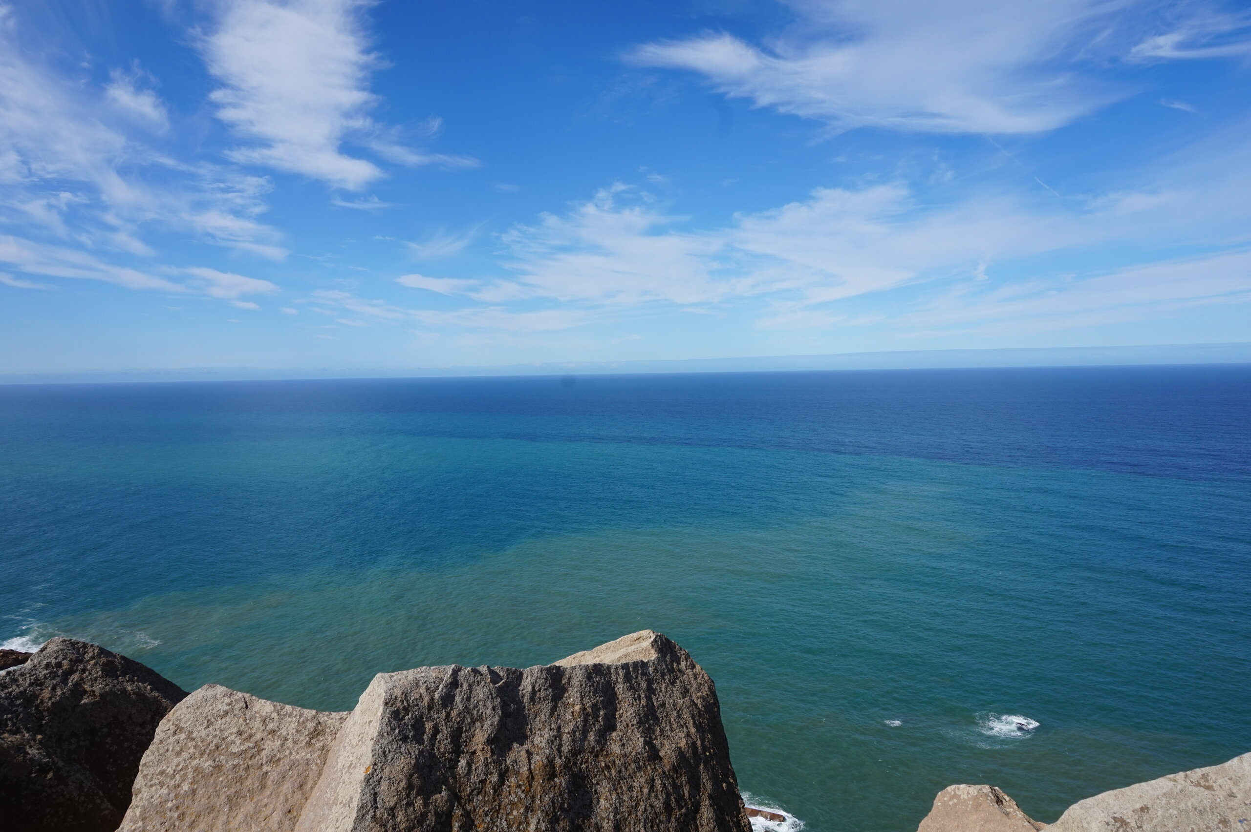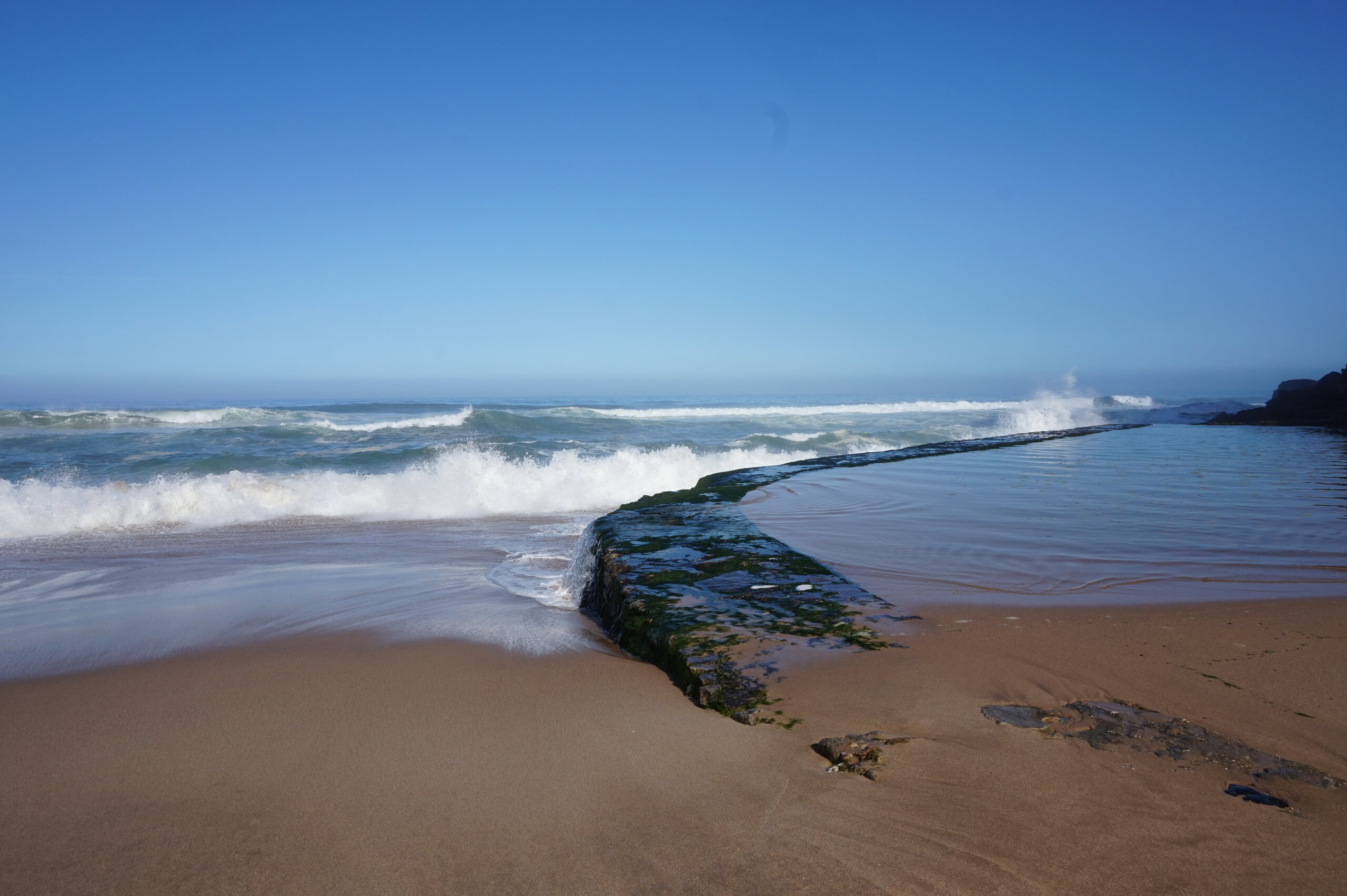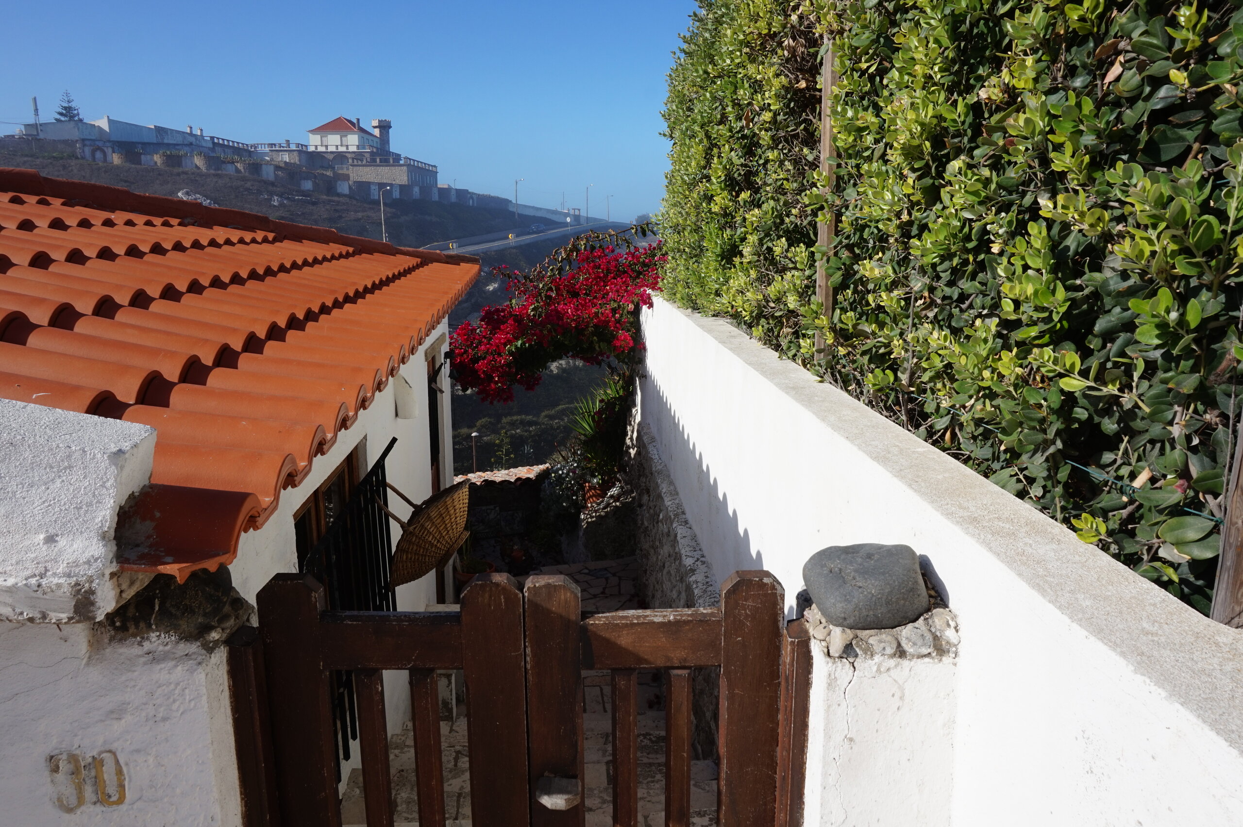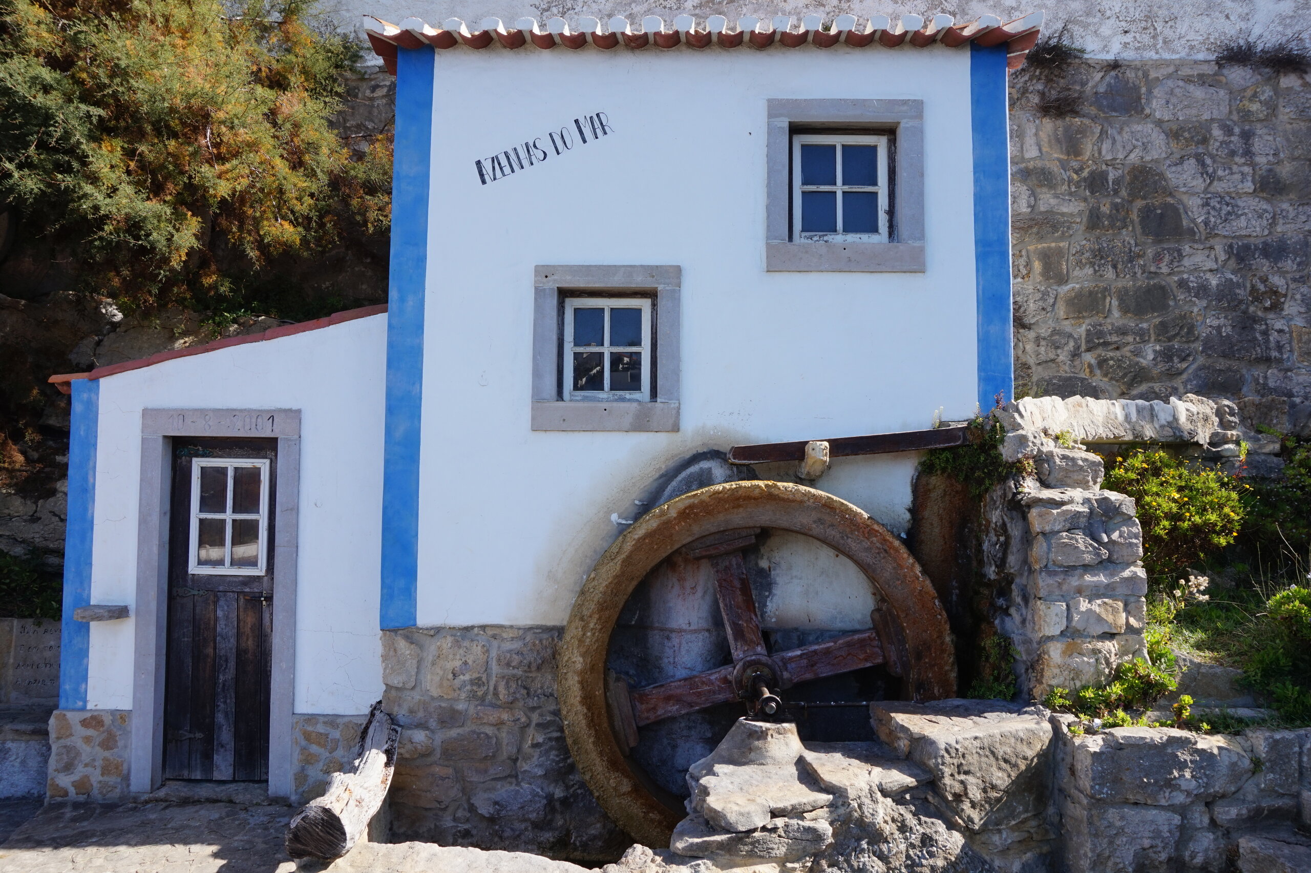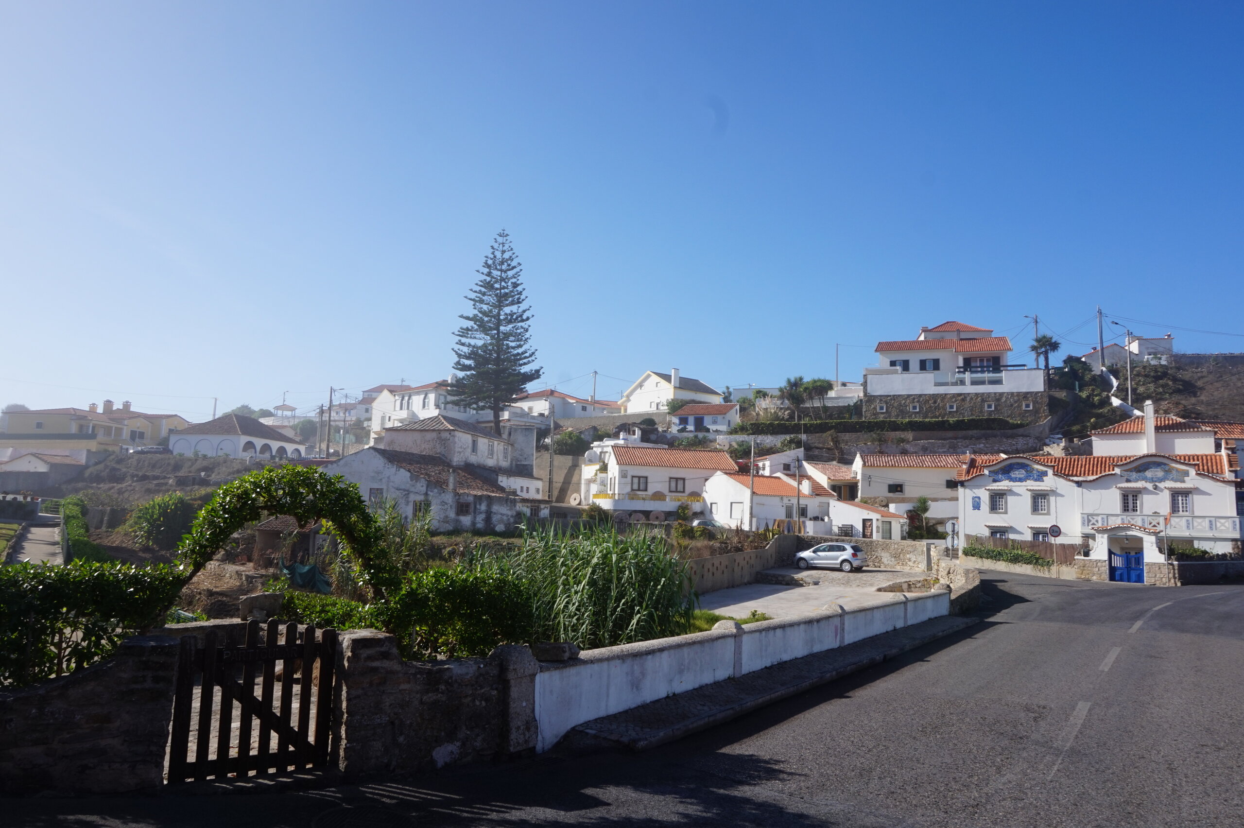 Каламбака- Азенхас-ду-Мар. Всего лишь одна фотография этого городка в путеводителе заставила нас включить его в наш план. Из Лиссабона на электричке, потом на автобусе, и вот мы в Азенхас-ду-Мар. Остановка автобуса. Название города переводится как «морская мельница». Постоянное население составляет всего 800 человек. Место славится своими виноградниками, здесь растет сорт винограда Ramisco. Жители этого небольшого города так же занимаются ловлей рыбы и моллюсков. Город расположен на скале, внизу раскинулся океан, и со стороны кажется, что город как бы влит в скалу, а некоторые дома как бы балансируют на краю пропасти. Спускаемся к океану, и мы почти одни, наедине с ним. Только пара рыбаков недалеко. Запах рыбы, солёные брызги воды, пена волн- эта картинка до сих пор передо мной. Счастливые мгновения, часто вспоминаю. Планировала искупаться в этом бассейне, но что-то не решилась. И очень хотелось выпить кофе в этом ресторане, но до открытия было ещё несколько часов, не судьба. Поднимаемся, и вот перед нами та картинка из путеводителя, которая привела нас сюда.
