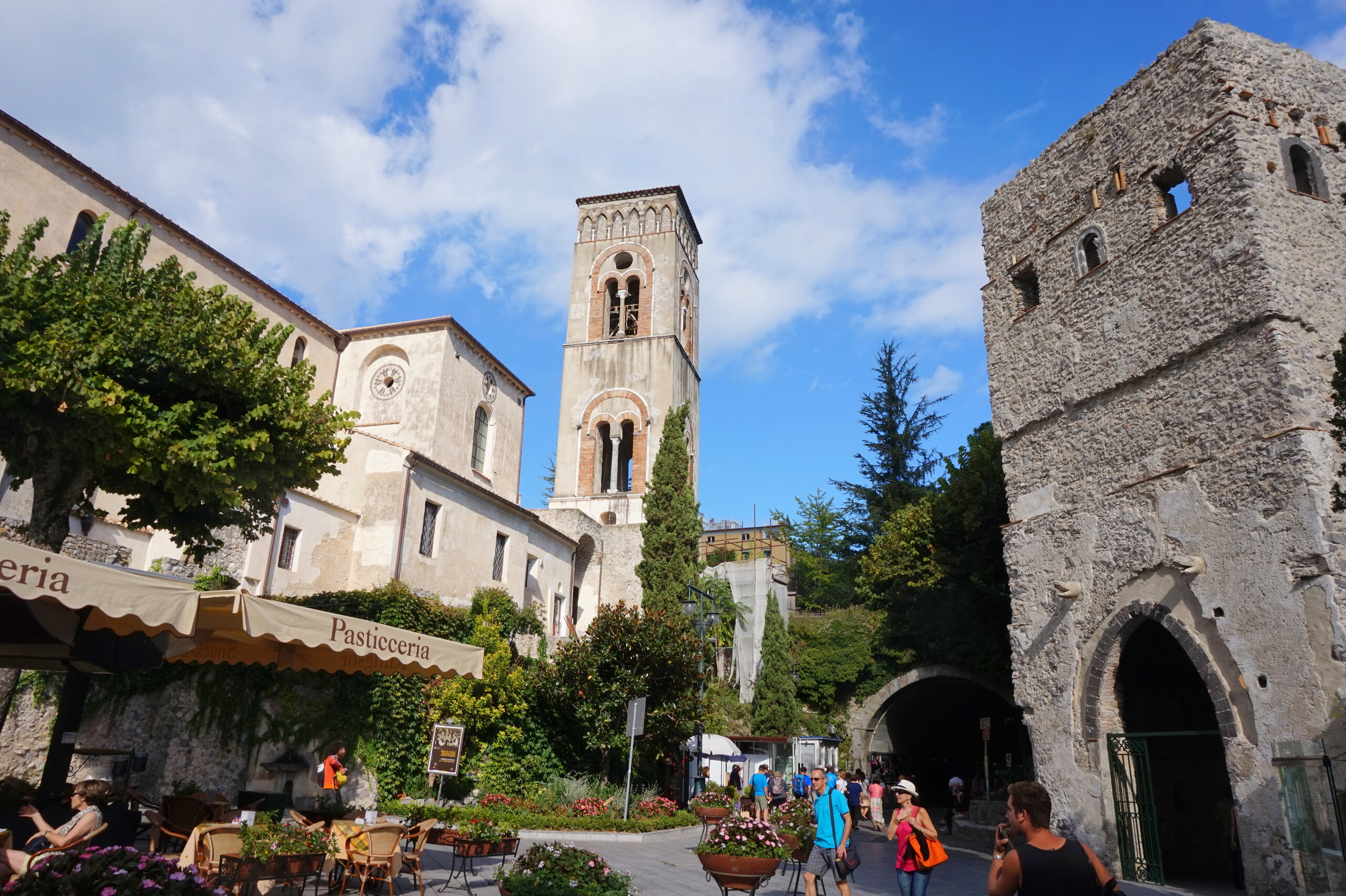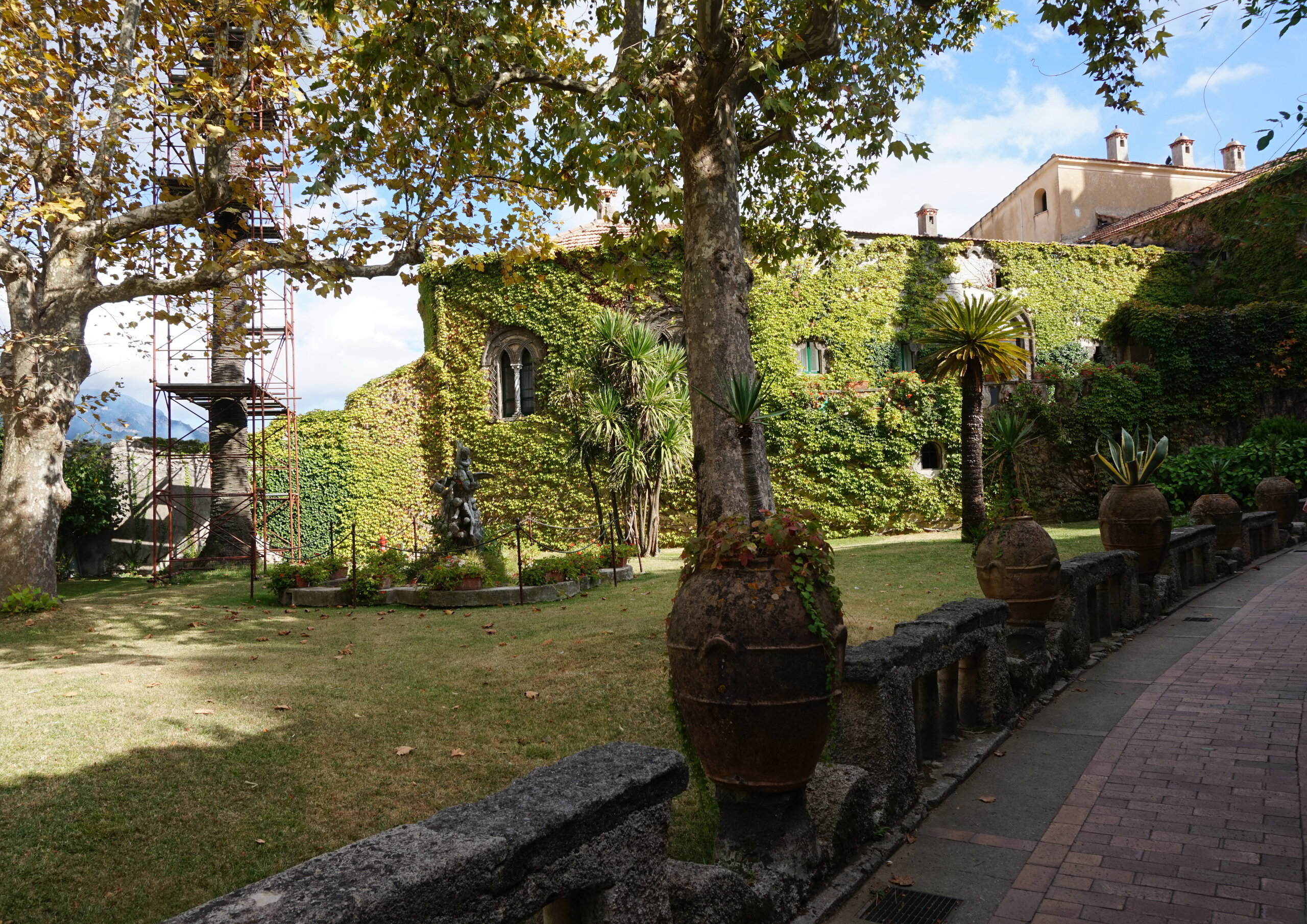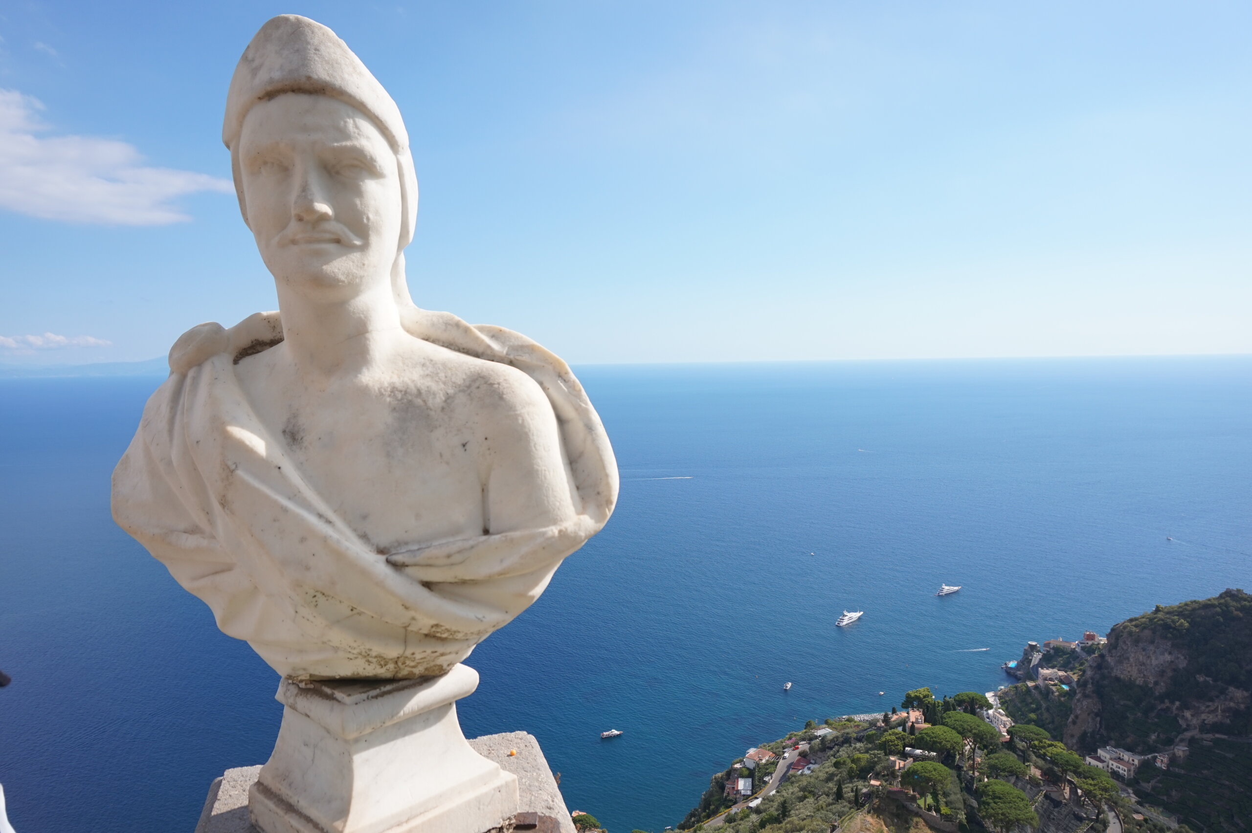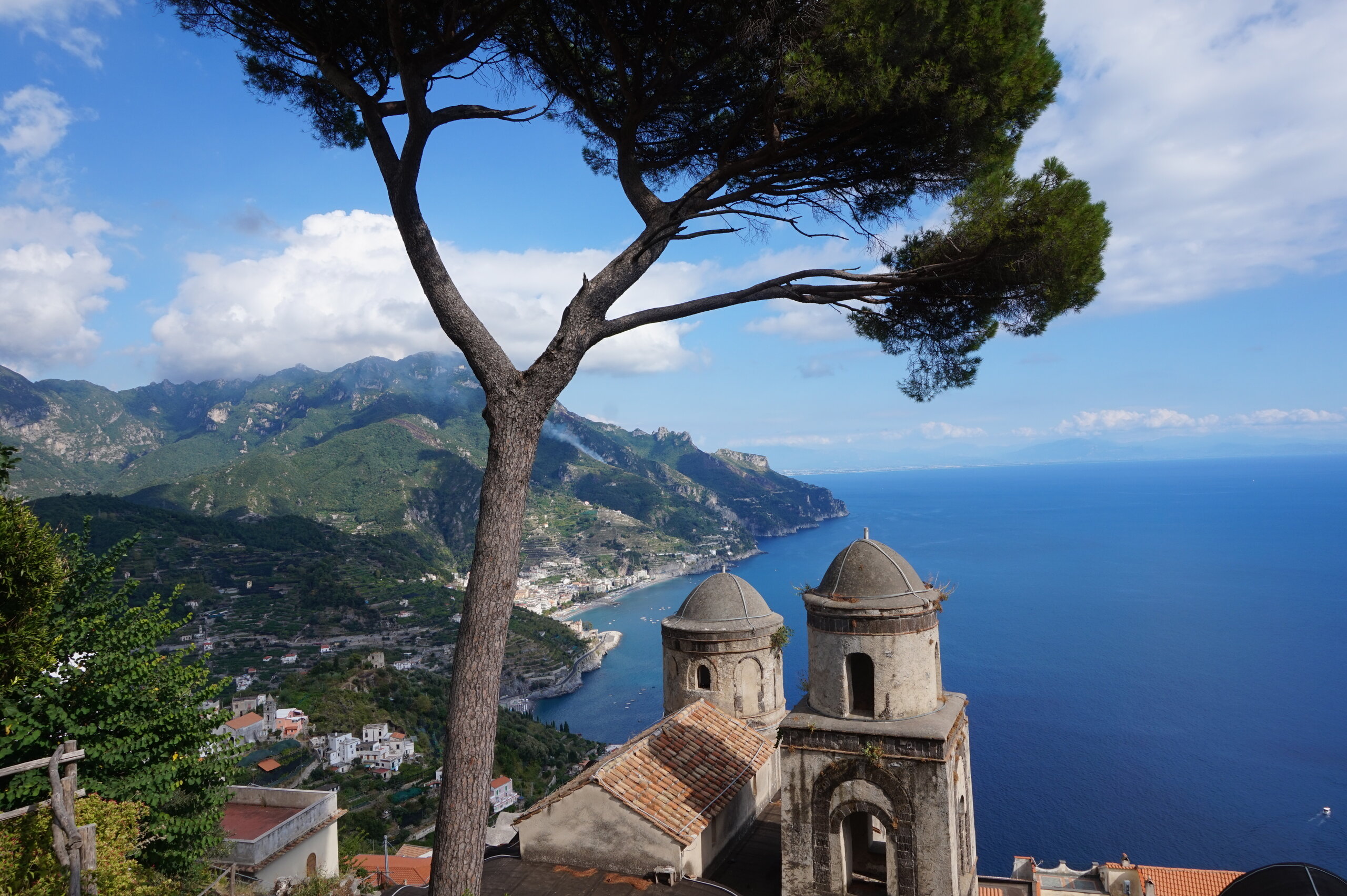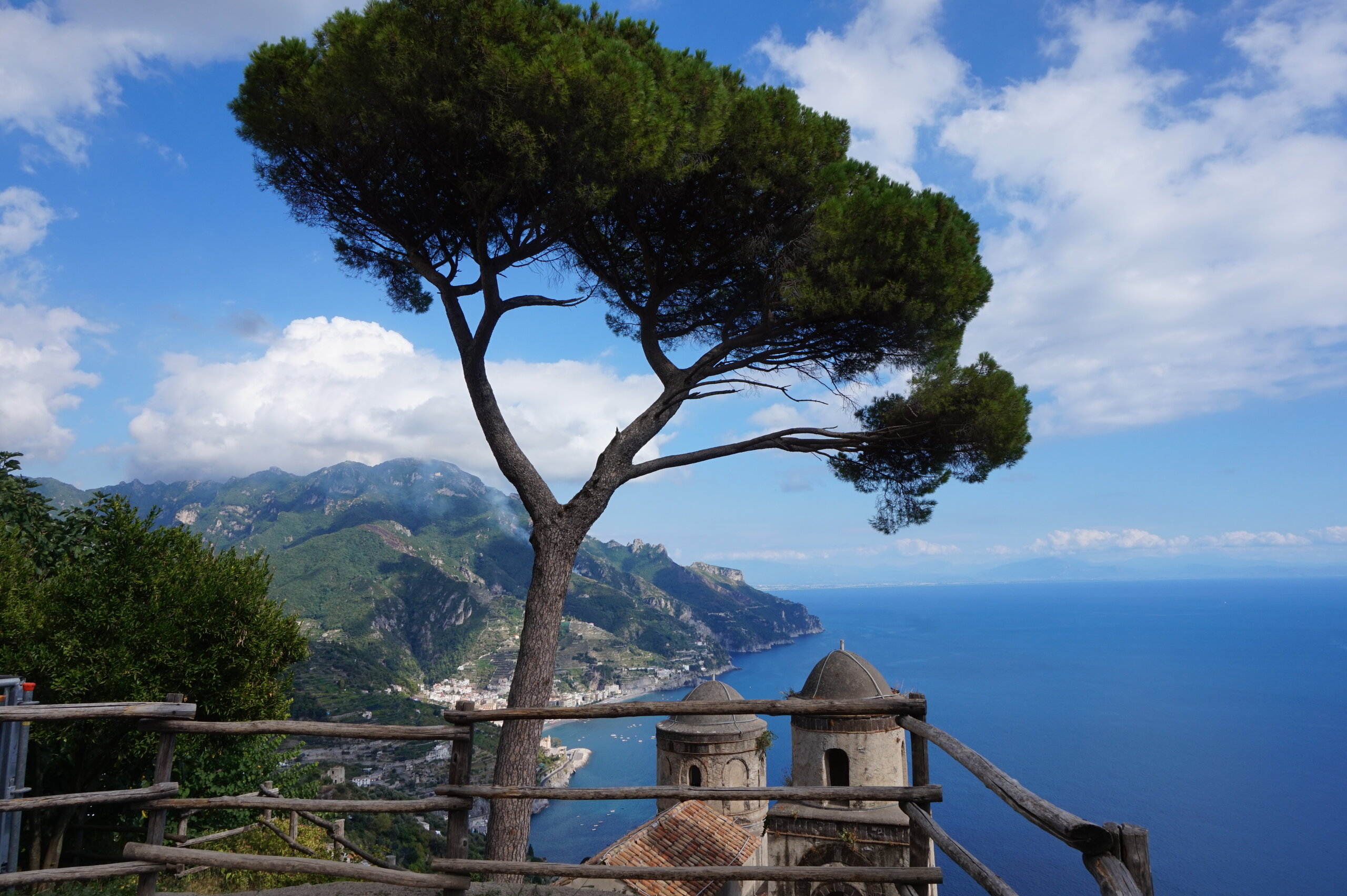 Р-Равелло. Это для меня одно из самых красивых мест в Италии. Высоко в горах над Амальфи, защищенный неприступными скалами и мощными стенами, в зарослях лимонных рощ, кроется небольшой городок. Когда-то здесь жили местные богачи, нажившие состояния на морской торговле. Они покинули шумные прибрежные поселения и забрались в поднебесье подальше от суеты и опасностей пиратского промысла. Ездили в Равелло с одногрупницей из Амальфи. Думали поехать на такси, с нас запросили 130 евро( с ожиданием 1,5 часа). Решили, что очень дорого и пошли на остановку автобуса. Итого туда-обратно-2,40 с человека. Автобусы ходят часто, иногда интервал5-15 минут. И 15 минут в дороге, любуемся сногсшибательными видами Амальфитаны. Мы вышли вот из этого тонеля, что посередине. Идём мы на Виллу Руфоло вот в эту арку справа. Тридцатиметровая трёхъярусная башня Торре Маджоре. На неё можно подняться, но я об этом не знала, да и времени у нас очень мало. Руфоло – знатное и богатое итальянское семейство, на протяжении многих лет игравшее большое значение в жизни Равелло. Во второй половине XIII века Руфоло построили прекрасную виллу на естественной террасе на высоте 350 метров над уровнем моря. Теперь Вилла Руфоло - один из главных символов Равелло. Почти двести лет до середины XIX века вилла была заброшена и находилась в полном запустении, пока в 1851 году её не приобрел коллекционер, искусствовед и любитель природы Френсис Невилл Рид, шотландец по происхождению. Благодаря Риду близ виллы появился прекрасный сад, в котором владелец постарался отразить суть эпохи романтизма. Открыточный вид Амальфитаны И ещё одна вилла Вилла Чимброне расположилась на скалистом утесе Чимброниум, от которого она и получила свое имя. Первичный особняк был построен в 11 веке, в период расцвета Равелло, и позднее был несколько раз перестроен. Вилла переходила из рук в руки . В 1904 году английский политик Эрнест Беккетт выкупил виллу и приступил к проекту масштабной реконструкции здания и сада. Он тяжело переживал смерть любимой жены и по совету друзей уехал лечить душевную травму в Италию (неплохой совет, а?) Амальфитанское побережье сразило своей красотой англичанина, и он остался здесь навсегда. Именно по его инициативе здесь были сооружены бойницы, террасы и крытая галерея. Особняк сочетает в себе элементы готической, норманнской, мавританской и венецианской архитектуры. Сегодня это фешенебельный отель , однако вход в сад открыт для всех желающих за 7 евро Но все едут на виллу Чимброне не за архитектурными изысками, а за великолепными видами, которые открываются из ее сада. Можно сказать безо всякого преувеличения, что эти виды – одни из самых лучших на всем Амальфитанском побережье. Через аллею Изобилия мы попадаем на Террасу Бесконечности. Не смогу описать лучше, чем автор книги «Я люблю Капри» Дж. Белинда -«… Церера, богиня плодородия встречает меня в конце аллеи и направляет в арку, откуда открывается самая потрясающая панорама, какую только доводилось мне видеть: длинный широкий балкон, где в ряд гордо выстроились 7 бюстов, и их силуэты четко выделяются на фоне царственных гор и моря цвета индиго…» И вот эти захватывающие дух виды! Скала нависает над резко спускающимся побережьем, где на террасах растут самые ароматнные и крупные лимоны в мире. Как хотелось всё это запомнить, впитать в себя, 
