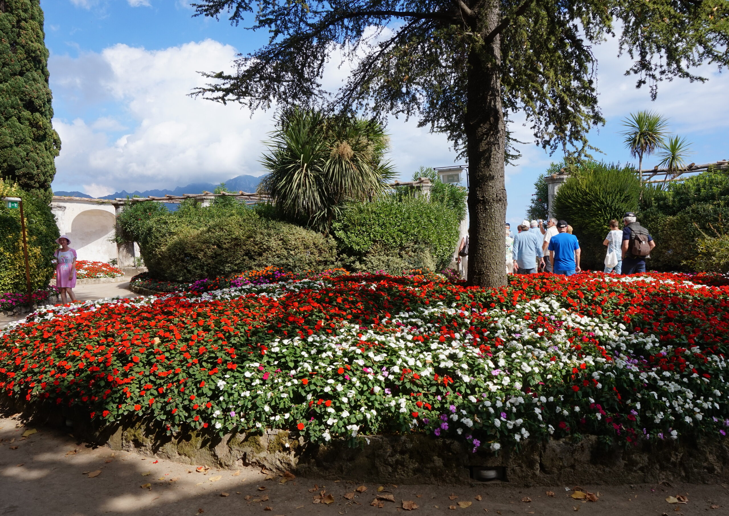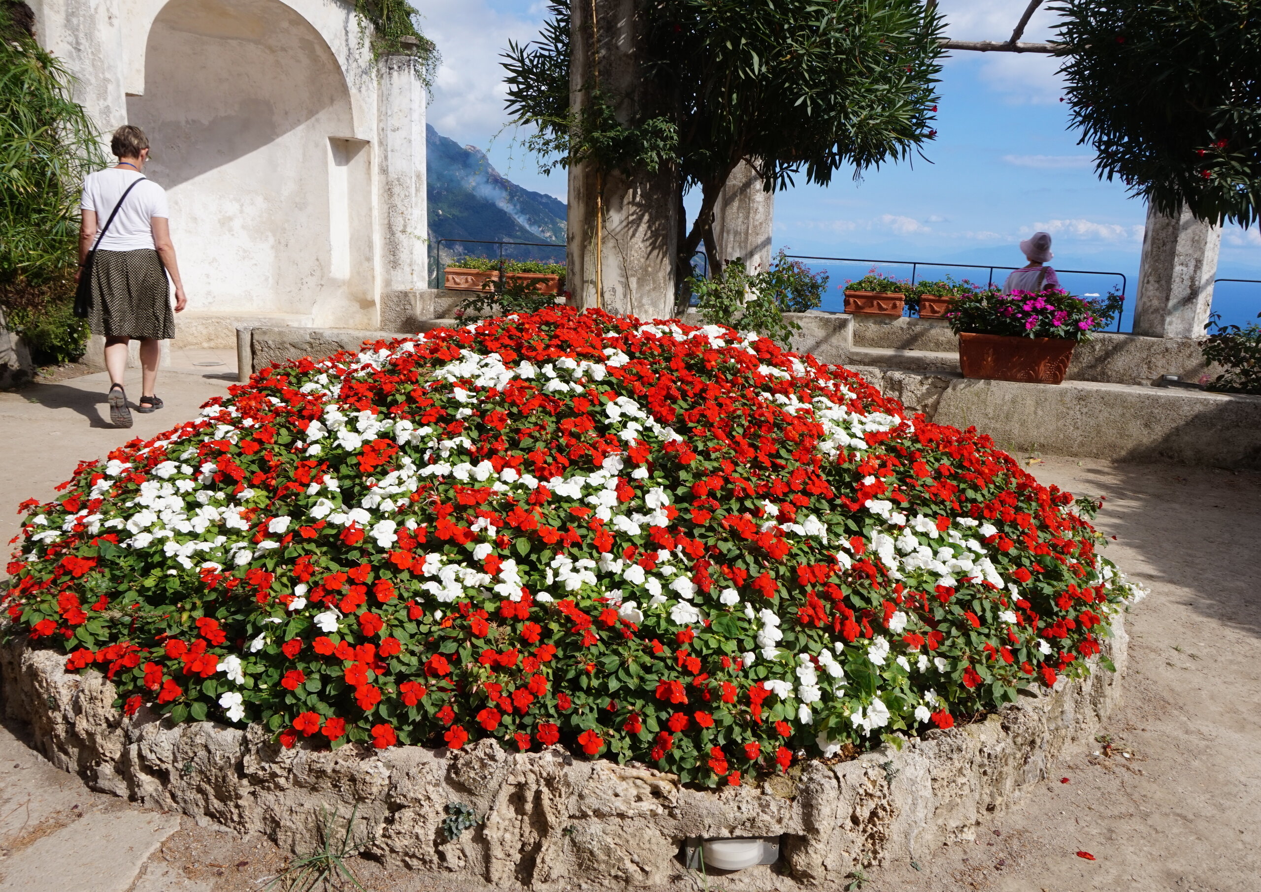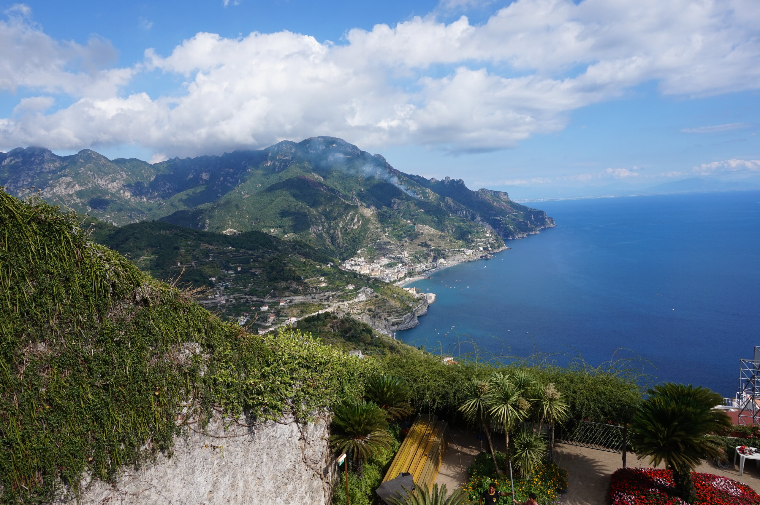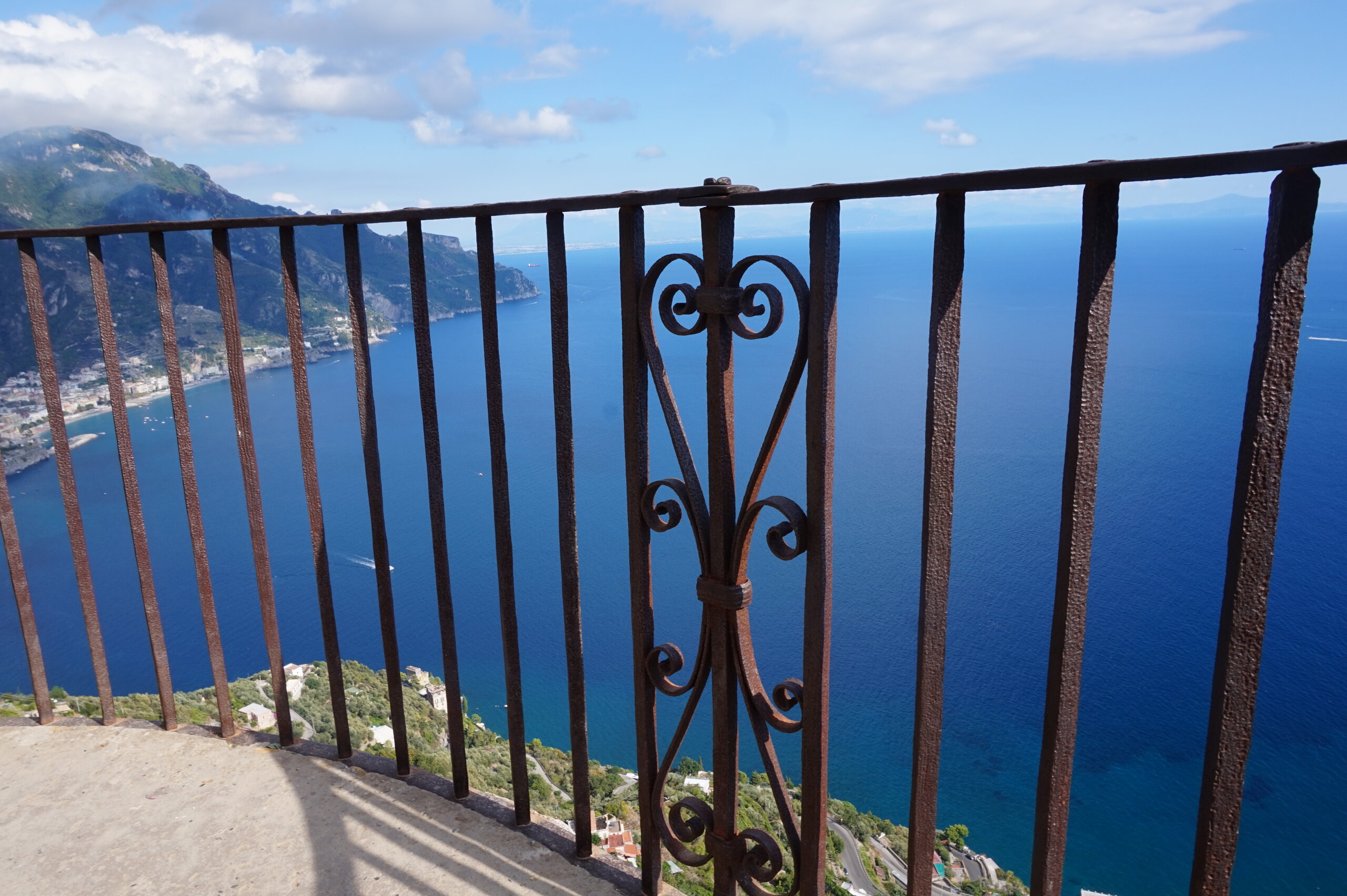 Р-Равелло. Это для меня одно из самых красивых мест в Италии. Высоко в горах над Амальфи, защищенный неприступными скалами и мощными стенами, в зарослях лимонных рощ, кроется небольшой городок. Когда-то здесь жили местные богачи, нажившие состояния на морской торговле. Они покинули шумные прибрежные поселения и забрались в поднебесье подальше от суеты и опасностей пиратского промысла. Ездили в Равелло с одногрупницей из Амальфи. Думали поехать на такси, с нас запросили 130 евро( с ожиданием 1,5 часа). Решили, что очень дорого и пошли на остановку автобуса. Итого туда-обратно-2,40 с человека. Автобусы ходят часто, иногда интервал5-15 минут. И 15 минут в дороге, любуемся сногсшибательными видами Амальфитаны. Мы вышли вот из этого тонеля, что посередине. Идём мы на Виллу Руфоло вот в эту арку справа. Тридцатиметровая трёхъярусная башня Торре Маджоре. На неё можно подняться, но я об этом не знала, да и времени у нас очень мало. Руфоло – знатное и богатое итальянское семейство, на протяжении многих лет игравшее большое значение в жизни Равелло. Во второй половине XIII века Руфоло построили прекрасную виллу на естественной террасе на высоте 350 метров над уровнем моря. Теперь Вилла Руфоло - один из главных символов Равелло. Почти двести лет до середины XIX века вилла была заброшена и находилась в полном запустении, пока в 1851 году её не приобрел коллекционер, искусствовед и любитель природы Френсис Невилл Рид, шотландец по происхождению. Благодаря Риду близ виллы появился прекрасный сад, в котором владелец постарался отразить суть эпохи романтизма. Открыточный вид Амальфитаны И ещё одна вилла Вилла Чимброне расположилась на скалистом утесе Чимброниум, от которого она и получила свое имя. Первичный особняк был построен в 11 веке, в период расцвета Равелло, и позднее был несколько раз перестроен. Вилла переходила из рук в руки . В 1904 году английский политик Эрнест Беккетт выкупил виллу и приступил к проекту масштабной реконструкции здания и сада. Он тяжело переживал смерть любимой жены и по совету друзей уехал лечить душевную травму в Италию (неплохой совет, а?) Амальфитанское побережье сразило своей красотой англичанина, и он остался здесь навсегда. Именно по его инициативе здесь были сооружены бойницы, террасы и крытая галерея. Особняк сочетает в себе элементы готической, норманнской, мавританской и венецианской архитектуры. Сегодня это фешенебельный отель , однако вход в сад открыт для всех желающих за 7 евро Но все едут на виллу Чимброне не за архитектурными изысками, а за великолепными видами, которые открываются из ее сада. Можно сказать безо всякого преувеличения, что эти виды – одни из самых лучших на всем Амальфитанском побережье. Через аллею Изобилия мы попадаем на Террасу Бесконечности. Не смогу описать лучше, чем автор книги «Я люблю Капри» Дж. Белинда -«… Церера, богиня плодородия встречает меня в конце аллеи и направляет в арку, откуда открывается самая потрясающая панорама, какую только доводилось мне видеть: длинный широкий балкон, где в ряд гордо выстроились 7 бюстов, и их силуэты четко выделяются на фоне царственных гор и моря цвета индиго…» И вот эти захватывающие дух виды! Скала нависает над резко спускающимся побережьем, где на террасах растут самые ароматнные и крупные лимоны в мире. Как хотелось всё это запомнить, впитать в себя, 