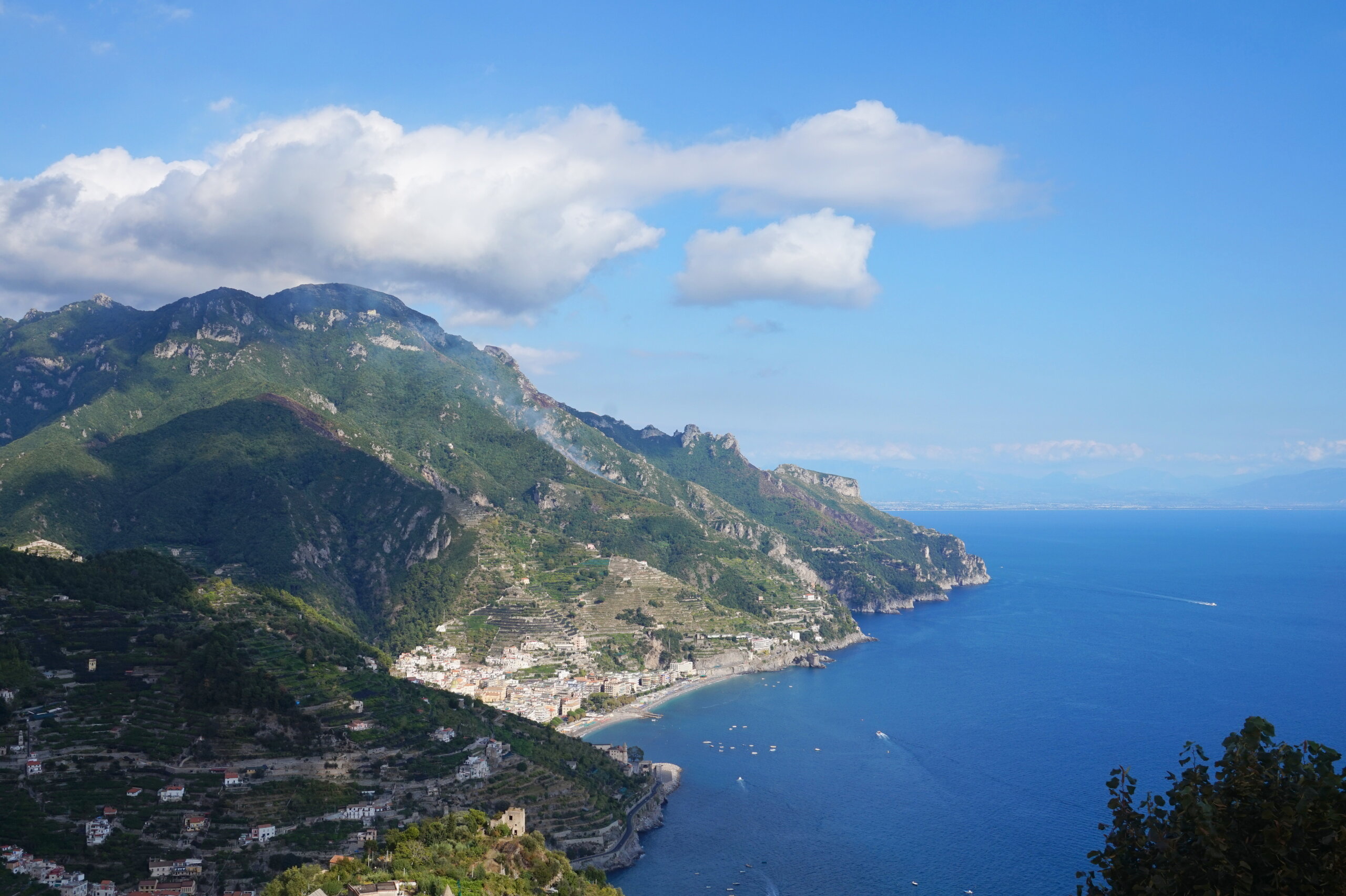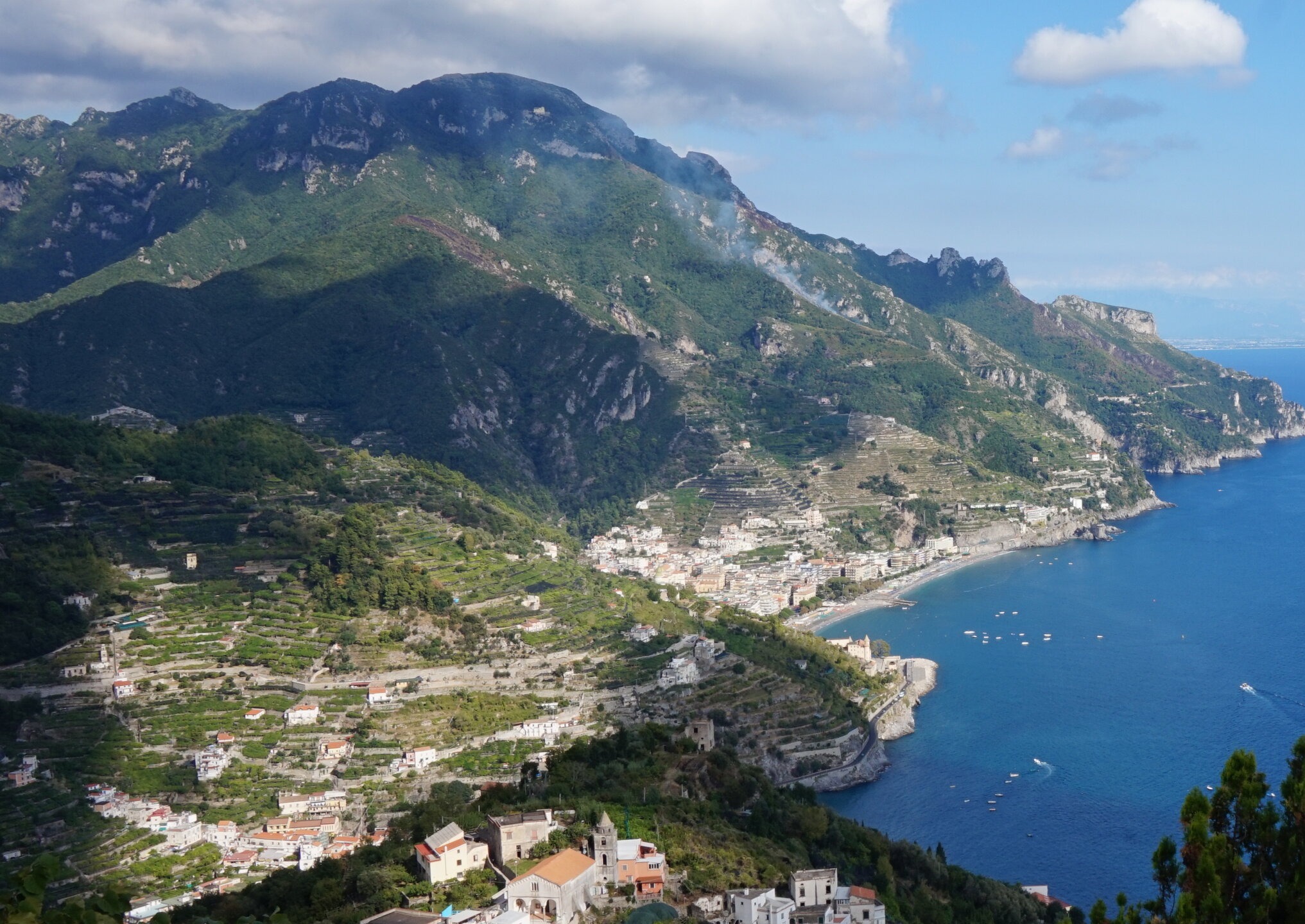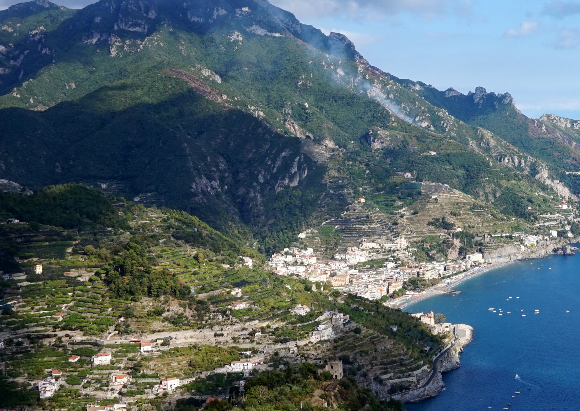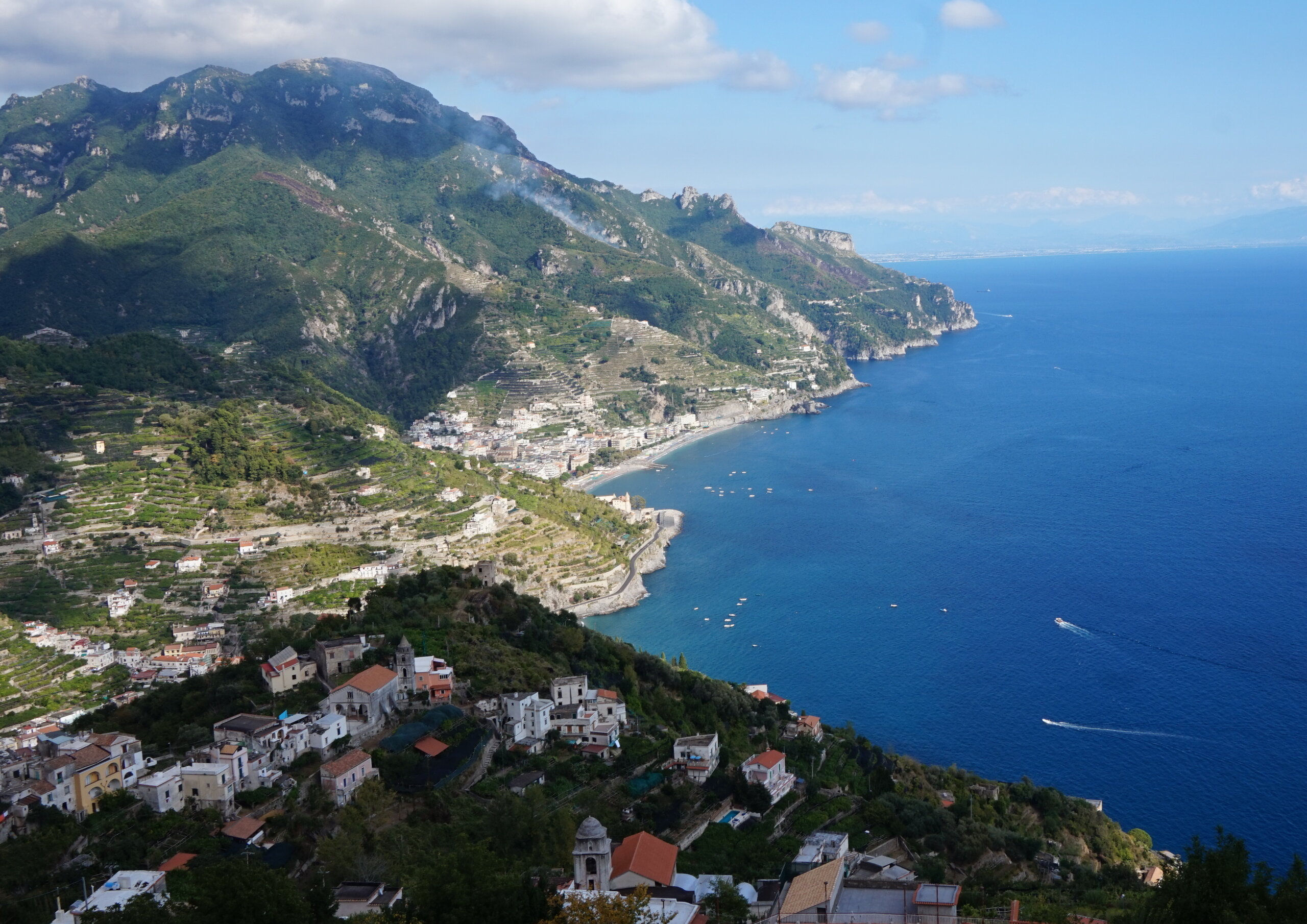 Р-Равелло. Это для меня одно из самых красивых мест в Италии. Высоко в горах над Амальфи, защищенный неприступными скалами и мощными стенами, в зарослях лимонных рощ, кроется небольшой городок. Когда-то здесь жили местные богачи, нажившие состояния на морской торговле. Они покинули шумные прибрежные поселения и забрались в поднебесье подальше от суеты и опасностей пиратского промысла. Ездили в Равелло с одногрупницей из Амальфи. Думали поехать на такси, с нас запросили 130 евро( с ожиданием 1,5 часа). Решили, что очень дорого и пошли на остановку автобуса. Итого туда-обратно-2,40 с человека. Автобусы ходят часто, иногда интервал5-15 минут. И 15 минут в дороге, любуемся сногсшибательными видами Амальфитаны. Мы вышли вот из этого тонеля, что посередине. Идём мы на Виллу Руфоло вот в эту арку справа. Тридцатиметровая трёхъярусная башня Торре Маджоре. На неё можно подняться, но я об этом не знала, да и времени у нас очень мало. Руфоло – знатное и богатое итальянское семейство, на протяжении многих лет игравшее большое значение в жизни Равелло. Во второй половине XIII века Руфоло построили прекрасную виллу на естественной террасе на высоте 350 метров над уровнем моря. Теперь Вилла Руфоло - один из главных символов Равелло. Почти двести лет до середины XIX века вилла была заброшена и находилась в полном запустении, пока в 1851 году её не приобрел коллекционер, искусствовед и любитель природы Френсис Невилл Рид, шотландец по происхождению. Благодаря Риду близ виллы появился прекрасный сад, в котором владелец постарался отразить суть эпохи романтизма. Открыточный вид Амальфитаны И ещё одна вилла Вилла Чимброне расположилась на скалистом утесе Чимброниум, от которого она и получила свое имя. Первичный особняк был построен в 11 веке, в период расцвета Равелло, и позднее был несколько раз перестроен. Вилла переходила из рук в руки . В 1904 году английский политик Эрнест Беккетт выкупил виллу и приступил к проекту масштабной реконструкции здания и сада. Он тяжело переживал смерть любимой жены и по совету друзей уехал лечить душевную травму в Италию (неплохой совет, а?) Амальфитанское побережье сразило своей красотой англичанина, и он остался здесь навсегда. Именно по его инициативе здесь были сооружены бойницы, террасы и крытая галерея. Особняк сочетает в себе элементы готической, норманнской, мавританской и венецианской архитектуры. Сегодня это фешенебельный отель , однако вход в сад открыт для всех желающих за 7 евро Но все едут на виллу Чимброне не за архитектурными изысками, а за великолепными видами, которые открываются из ее сада. Можно сказать безо всякого преувеличения, что эти виды – одни из самых лучших на всем Амальфитанском побережье. Через аллею Изобилия мы попадаем на Террасу Бесконечности. Не смогу описать лучше, чем автор книги «Я люблю Капри» Дж. Белинда -«… Церера, богиня плодородия встречает меня в конце аллеи и направляет в арку, откуда открывается самая потрясающая панорама, какую только доводилось мне видеть: длинный широкий балкон, где в ряд гордо выстроились 7 бюстов, и их силуэты четко выделяются на фоне царственных гор и моря цвета индиго…» И вот эти захватывающие дух виды! Скала нависает над резко спускающимся побережьем, где на террасах растут самые ароматнные и крупные лимоны в мире. Как хотелось всё это запомнить, впитать в себя, 