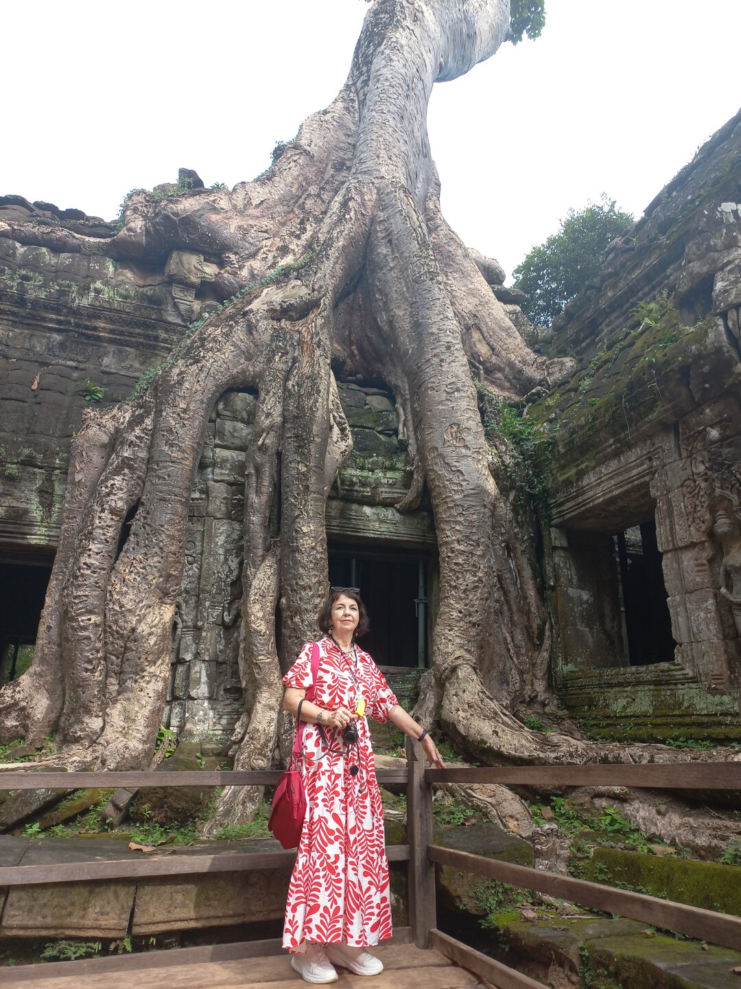 Та Пром(продолжение) Отличие Та Прома от других храмов Ангкора- мощные деревья, оплетающие строения. Фиговые деревья пустили свои корни по камням храма, разделяя стены и террасы, а их ветви и листья переплелись наверху, сформировав над храмом зеленый купол. Стволы деревьев соседствуют с каменными колоннами храма. В Та Проме встречаются в основном две разновидности деревьев: большие и мощные хлопковые деревья и более скромные в размерах, но не менее настойчивые фикусы-душители. Хлопковые деревья отличаются толстыми светлыми корнями, которые как большими руками охватывают постройки Та Прома. Для фикусов-душителей характерны многочисленные тонкие серые корни, которые опутывают камни кружевной паутиной. Фикусы с разросшимися корнями называют баньянами. Вот с этим корнем рядом стояла Анджелина Джоли, хотелось повторить кадр, но как-то рядом никого не оказалось, группа ушла вперёд, побоялась отстать. Очень атмосферное место, очаровывает не меньше Ангкор Вата. Также красивые барельефы, и очень много изображений небесных танцовщиц. А ещё в храме есть загадка- на одном барельефе- изображение динозавра. Сами бы на это внимание и не обратили- подсказал гид. Откуда он взялся и что здесь делает? Или динозавры не вымерли много миллионов лет назад? Фантастический храм! Под большим впечатлением едем в отель, поплавала в бассейне и есть время на поиск покупок, сувениров. Александр порекомендовал марку кофе с шоколадным вкусом, которым славится Камбоджа. И хотя я обычно покупаю кофе только в зёрнах, здесь купила и молотый. В первый день в супермаркете были три полки с этим кофе, а перед отъездом полки были уже пустые- всё разобрали.