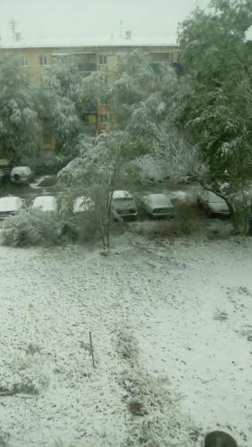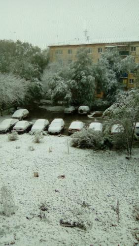 И снова про погоду. У нас в Самарской области тоже холодно. Снежок вчера сыпал периодически. Утром из окна была видна такая картина: Ну кто поверит, что еще на прошлой неделе было + 28? Сегодня сосульки на крыше подъезда так и не растаяли (хоть целый день светило солнце). А хуже всего то, что при отрицательной темературе по ночам и небольшой дневной, отопления в жилых домах пока не дали. Мерзнем, но не сдаемся!
