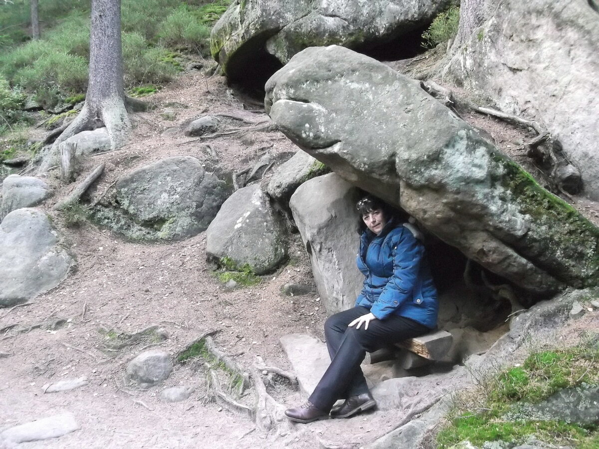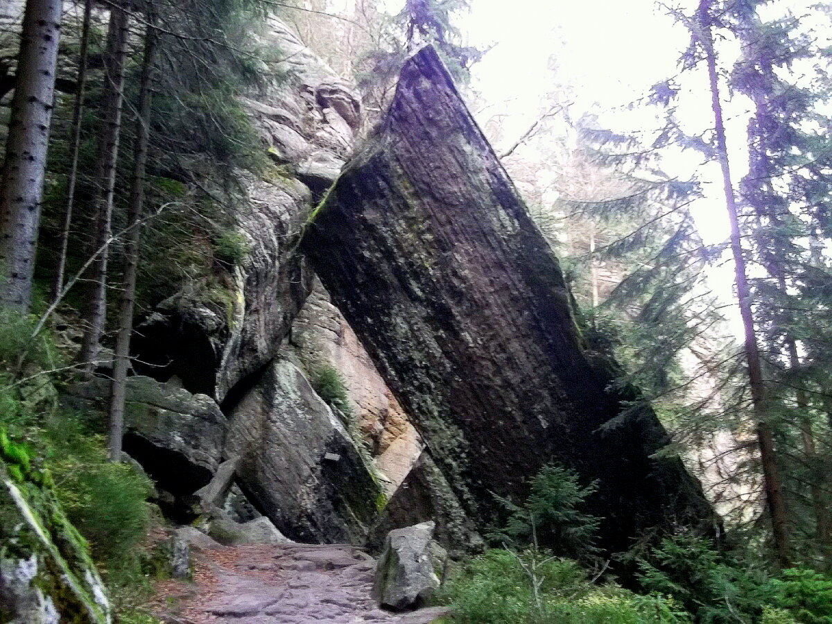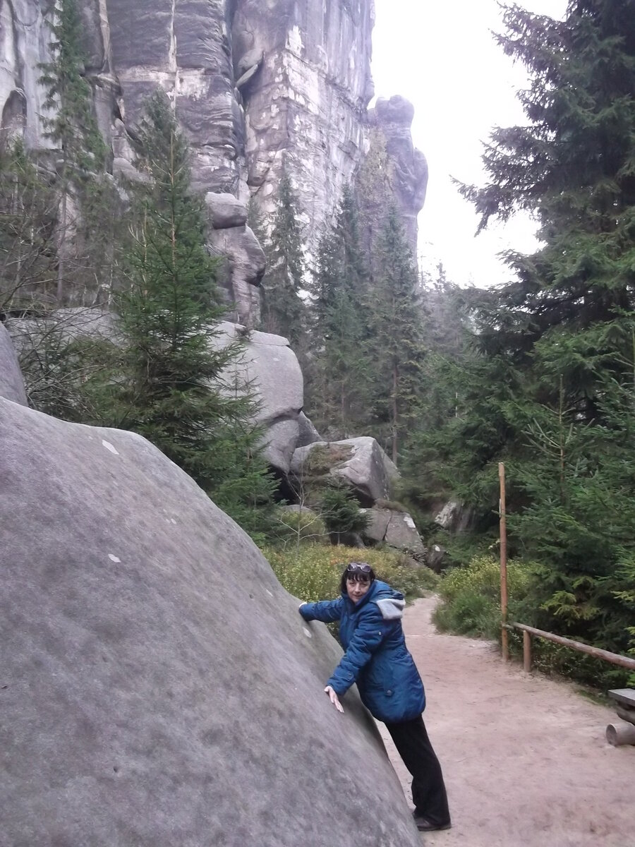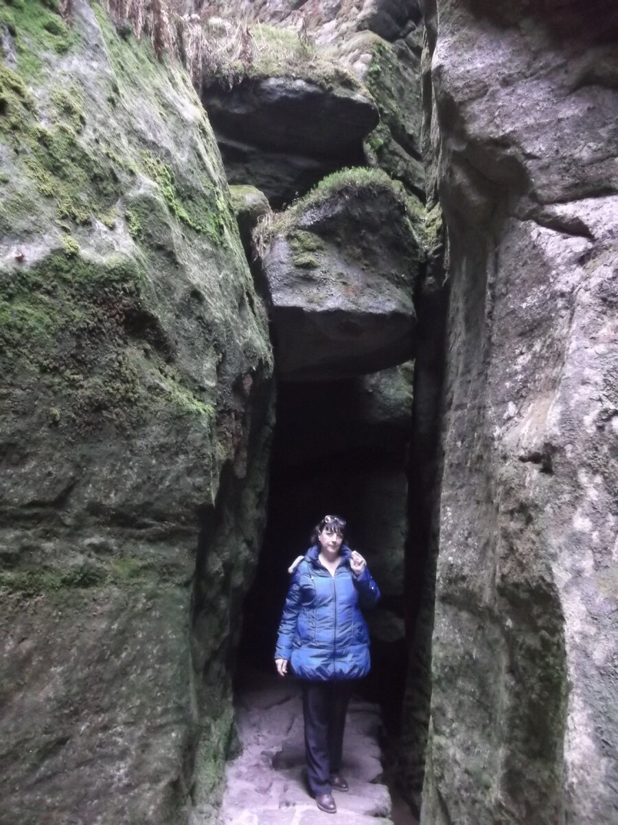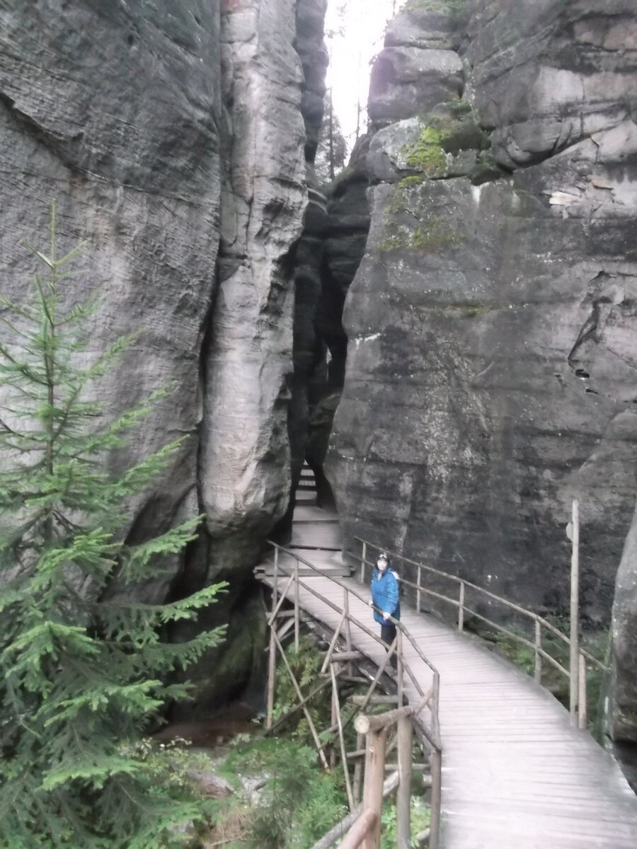 ТЕПЛИЦКИЕ СКАЛЫ - Teplické Rok město. Окончание. Обе части этого каменного заповедника соединяет Волчье ущелье с пешей тропой, однако пользуются ею в основном знатоки пешего туризма, и даже проводники лишний раз не рискуют по ней водить своих клиентов, предпочитая в основном переезжать на транспорте между входами, и следовать только лишь обозначенными в путеводителе маршрутами. После обеда Влад снова спросил - едем ли мы дальше? Впору было сказать, что устала, но жажда приключений не отпускала. Уйти с полпути было не по правилам игры. Световой день был практически на излете, и очень скоро заповедник и всех на его дорожках, ждала кромешная мгла. Огромные деревья не пропускали ни луча света на песчаные дорожки. Это было заметно в Адршпахе на отдельных участках и каньоне Сибирь со скалами-великанами. Та же история повторилась в Теплице на Метуи, причем с самого начала пешеходной тропы. Оставив машину на парковке на входе в Теплицкую часть, Влад взял с собой фонарик из машины и сразу предупредил, что возвращаться мы будем в полной темноте, весь трек не пройдем-не успеем и вернемся сразу же, как только начнут сгущаться сумерки, чтобы успеть спустится по влажным и мшистым булыжникам скалистого склона. Естественно, ходить в лес и скалы на ночь глядя, мне не приходилось. И смутно представлялась эта самая грядущая темнота, когда еще и намека на вечер не было. Да, время для меня остановилось и больше не работало в этом отдаленном от цивилизации регионе. Я была счастлива, что получилось добраться из Праги, и просила его только об одном - чтобы ни случилось на прогулке - донести и вернуть меня обратно, в пансион к пану Ярославу. Только представьте себе, что первые посетители пришли в этот заповедник в 1739 году!!!, и с тех самых пор не зарастает народная тропа в Адршпах и Теплице. По ней гуляли разбойники и авантюристы, поэты и художники, императоры и конечно же ТУРИСТЫ, которые всякий раз, оставляли на стенах скального города свои автографы. Приезжали неоднократно и киношники, ибо на мой субъективный взгляд, лучшей локации для натурных съемок сказок не найти во всей Европе. В ареале заповедника разрешен лицензированный альпинизм. Но судите сами, коли каждый год увеличивается количество памятных табличек в мемориальной часовне, кто будет покорять вершины комплекса? Не гранитного, и не каменного, на минуточку, а песчаного. Когда каждый уступ на высоте может стать последней секундой жизни? Одну такую семью скалолазов я встретила под скалой в Аршпахе. Они готовились к восхождению, имея рядом с собой маленьких детей. Отчаянные люди. Сказочность здесь действительно уступает место реальности, и не потому, что наступает вечер. Первозданности природы больше, и гораздо меньше чувствуется присутствие человека, вот как-то туда он не слишком проник, хотя все это рядом и очень близко буквально три-пять километров. Выглядки-смотровые площадки в скалах тоже были, но на такие подъемы уже не оставалось ни единого шанса. Чем дальше тем сказочней становилась местность, усыпанная гигантскими валунами на склонах среди высоченных деревьев. Один из главных теплицких порталов стал завершающим в осмотре и стоило поторапливаться, чтобы выбраться из каменного лабиринта Обнимашки на прощание и пора бежать в настоящее. Так интересно, что же там было дальше? До чего дойти не удалось??