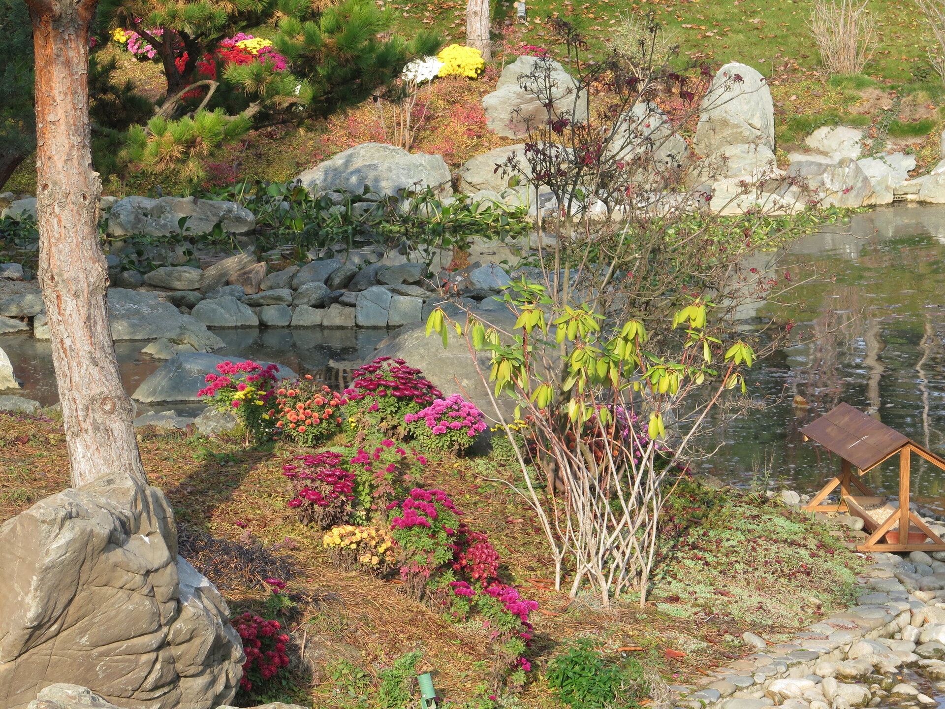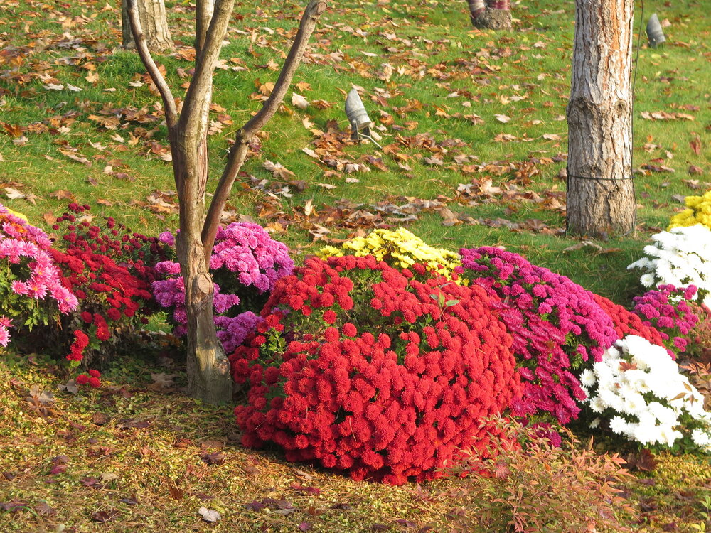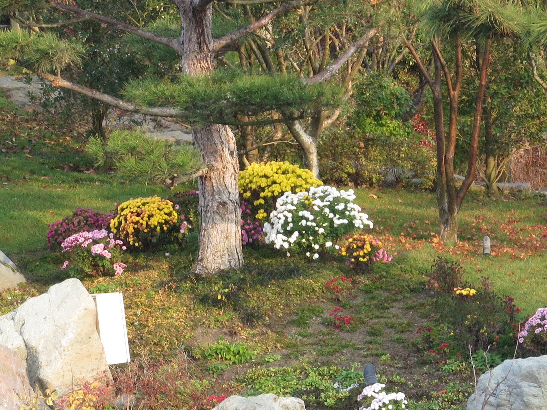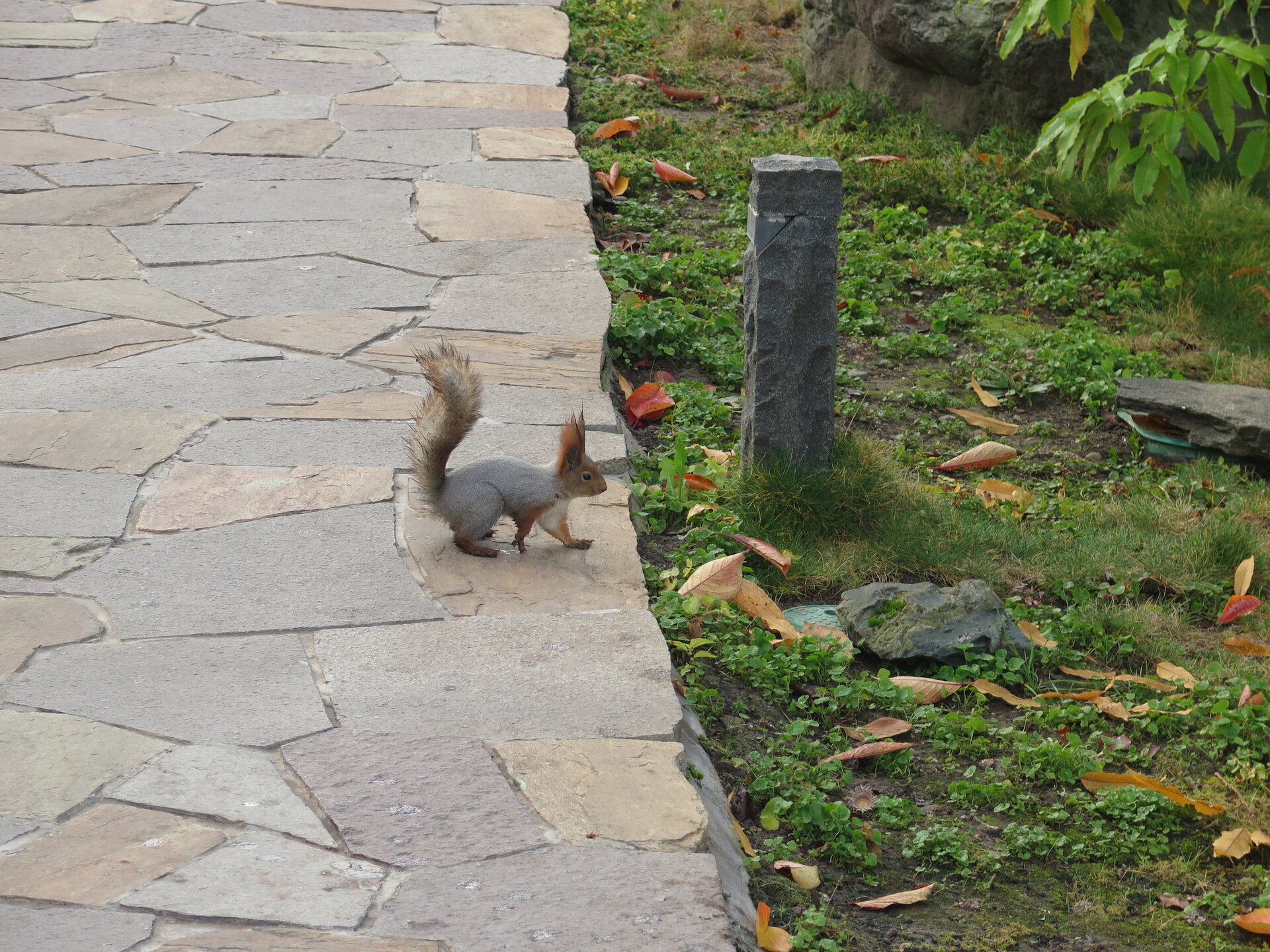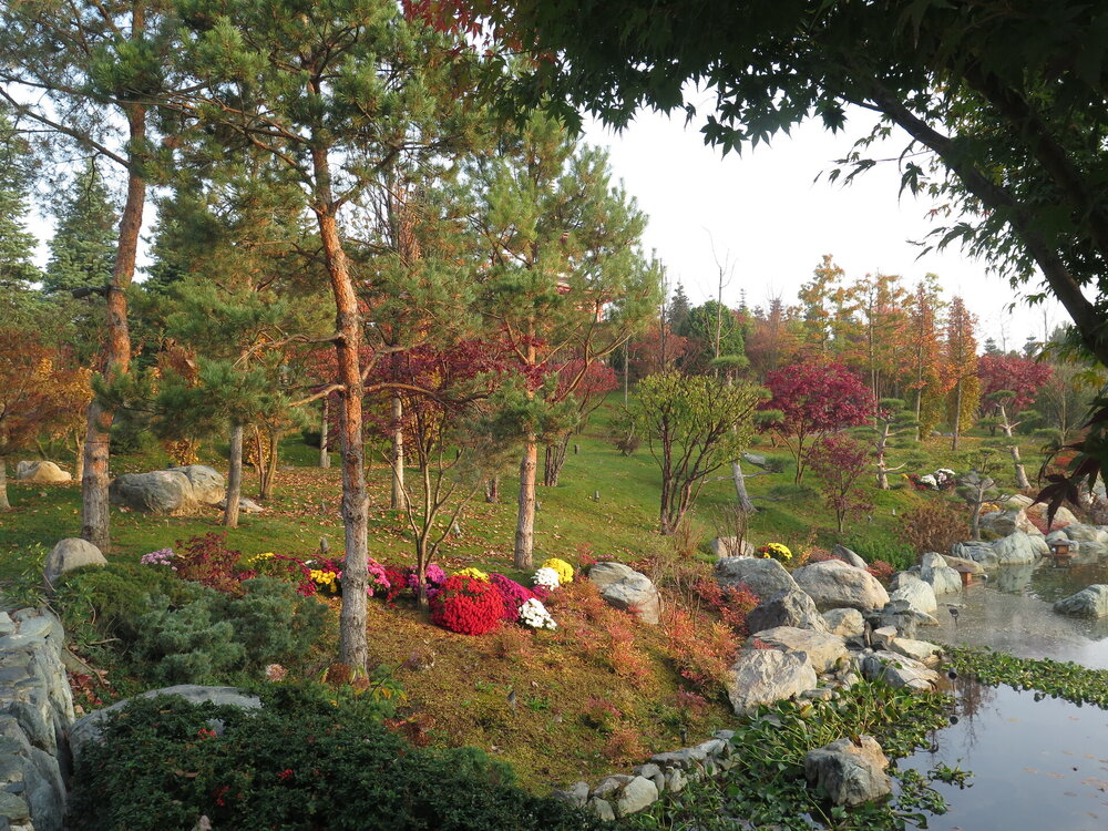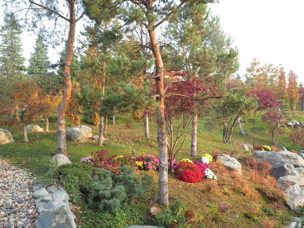 В саду очень много белок. Их не трогают и они здесь ходят пешком и никого не боятся. Но сфотографировать их сложно, они очень быстрые и юркие. Осень время хризантем и дубков. Не могу сказать , что их высажено много, но то что есть смотрится эффектно.
