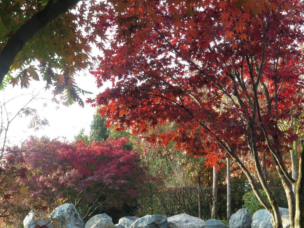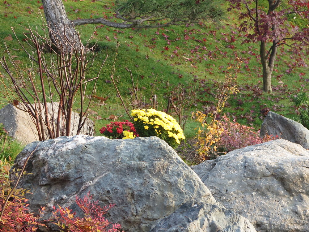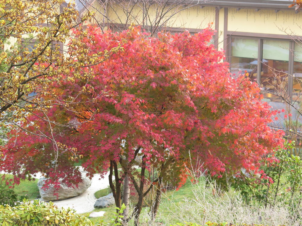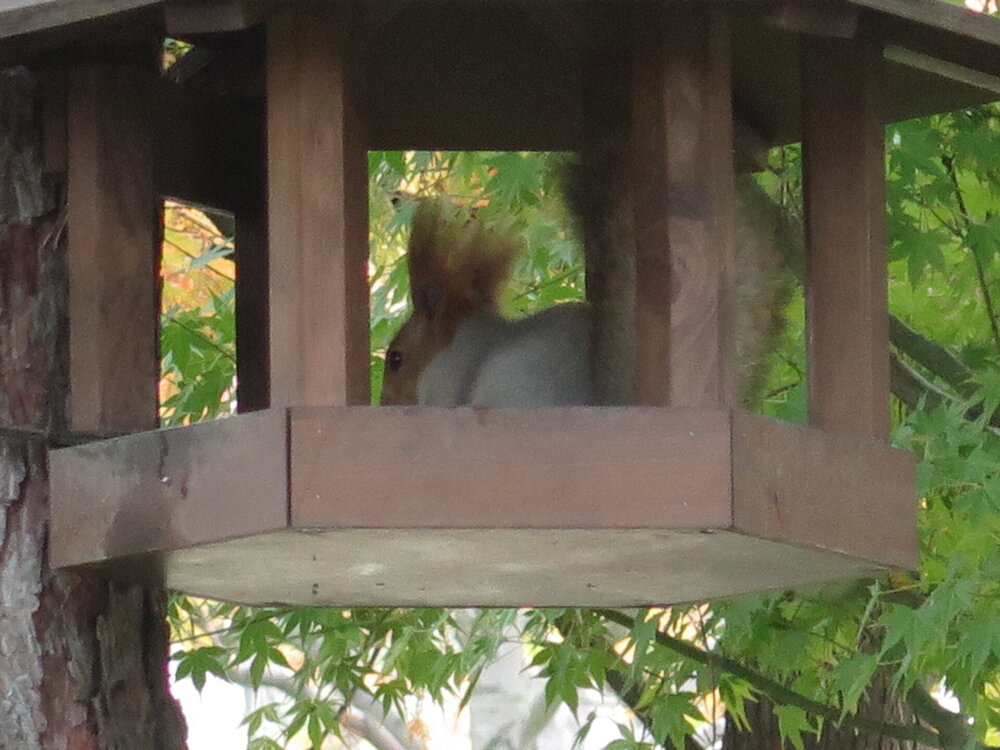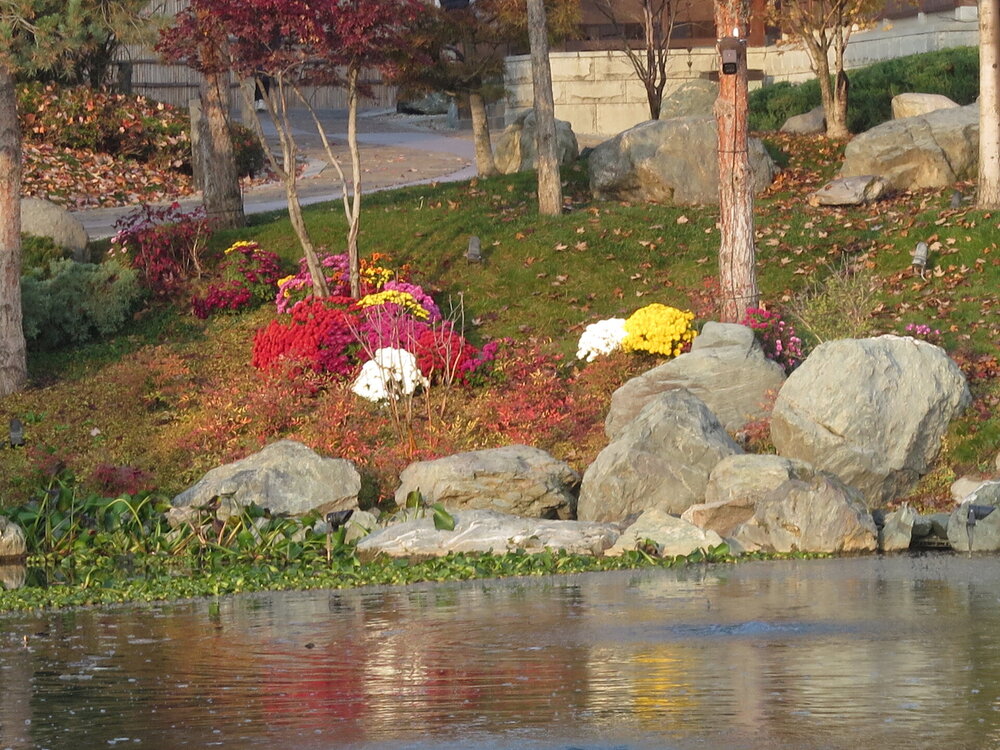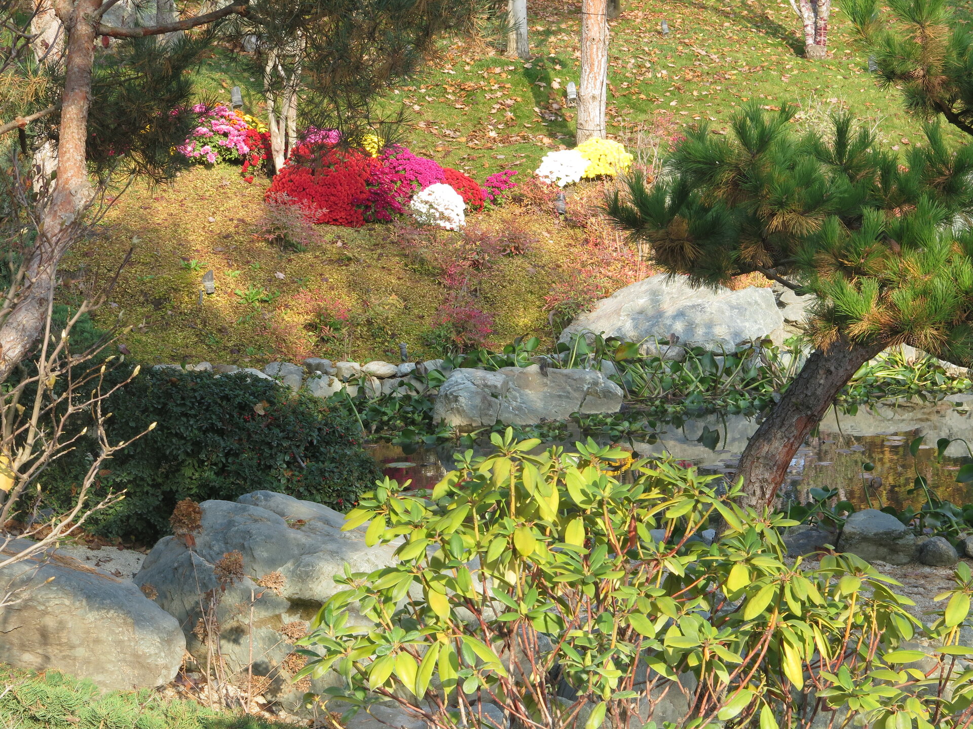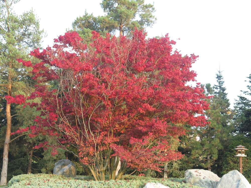 В саду очень много белок. Их не трогают и они здесь ходят пешком и никого не боятся. Но сфотографировать их сложно, они очень быстрые и юркие. Осень время хризантем и дубков. Не могу сказать , что их высажено много, но то что есть смотрится эффектно.
