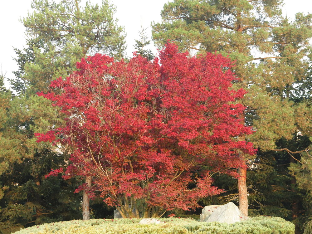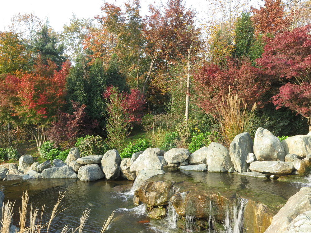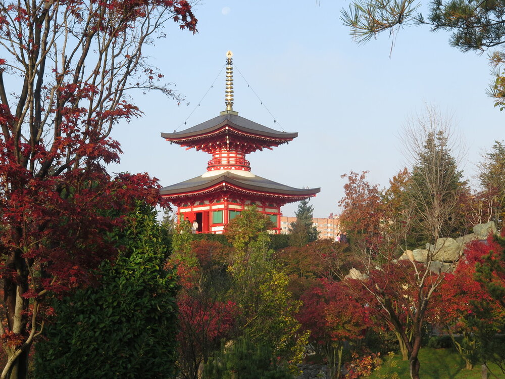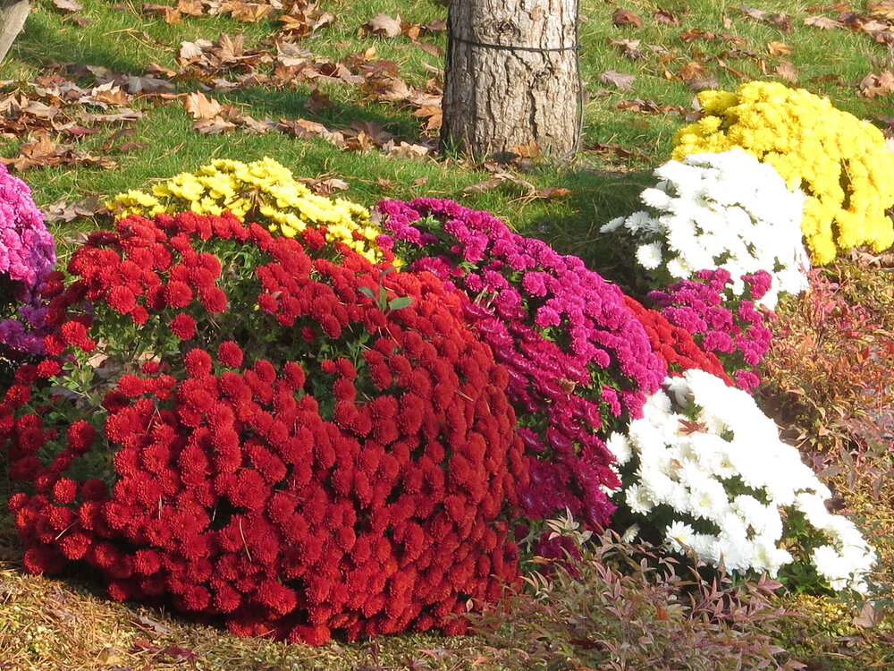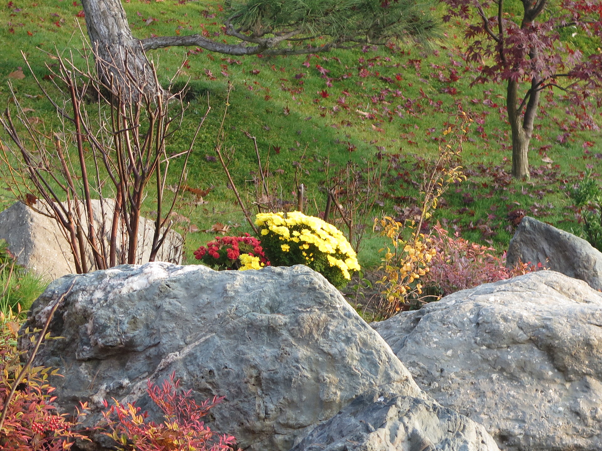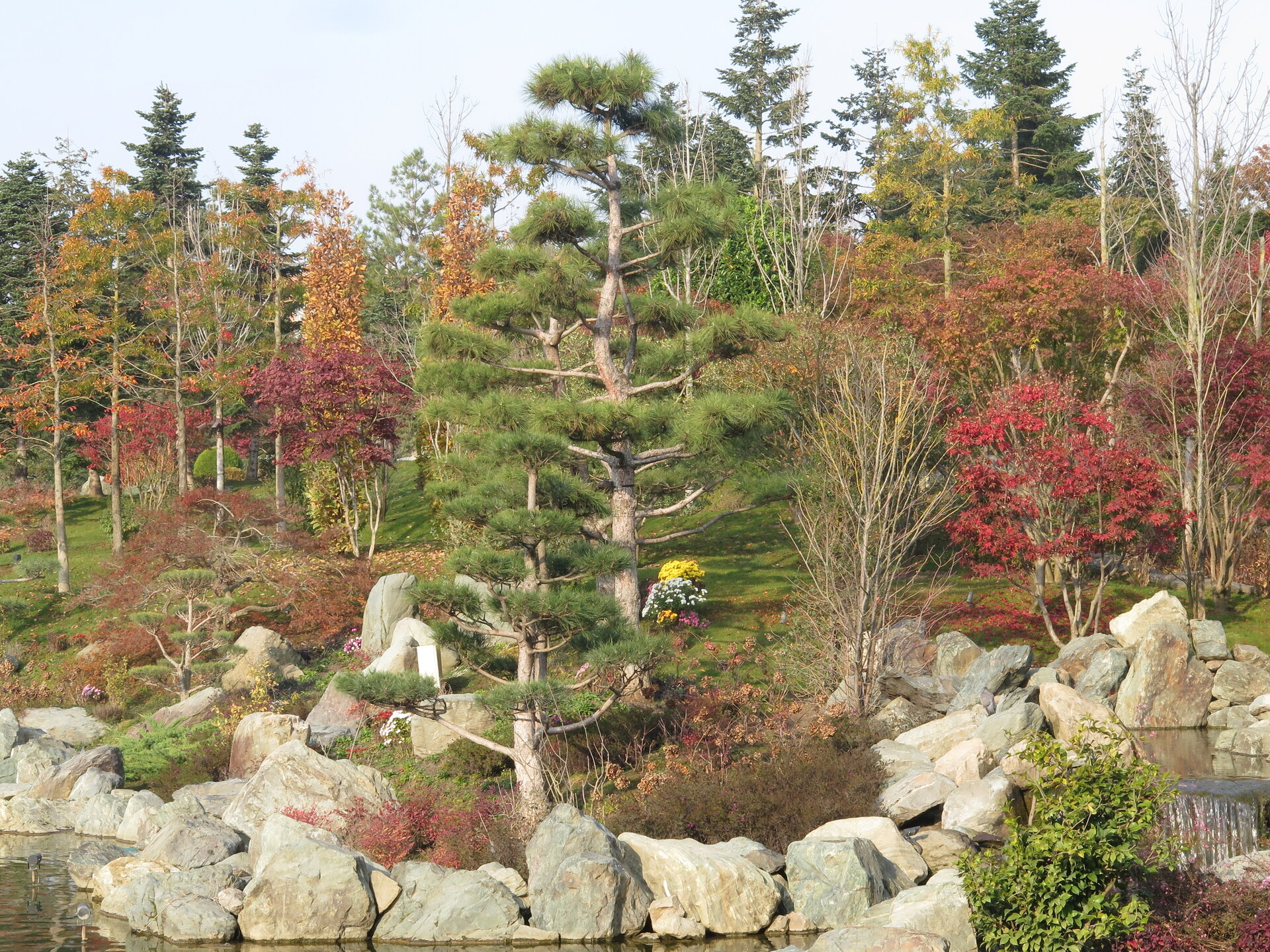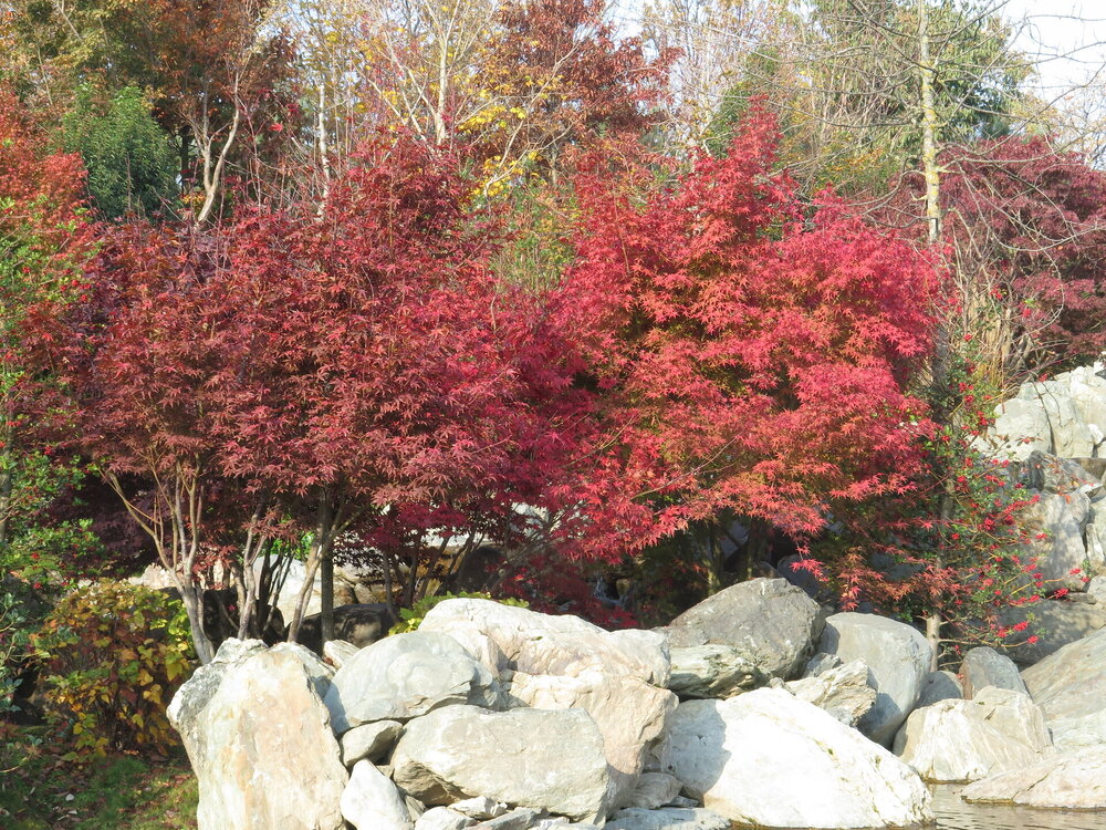 В саду очень много белок. Их не трогают и они здесь ходят пешком и никого не боятся. Но сфотографировать их сложно, они очень быстрые и юркие. Осень время хризантем и дубков. Не могу сказать , что их высажено много, но то что есть смотрится эффектно.