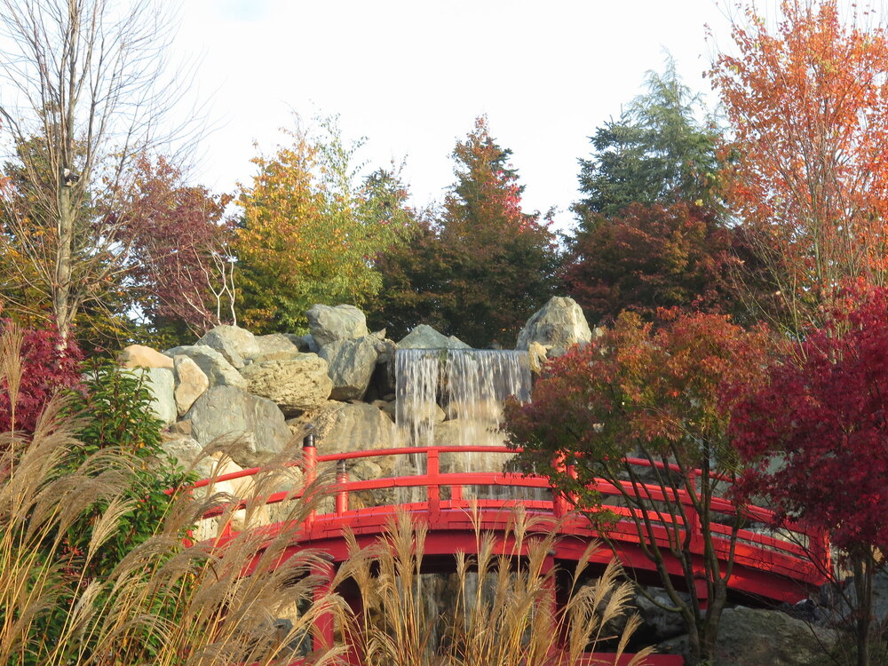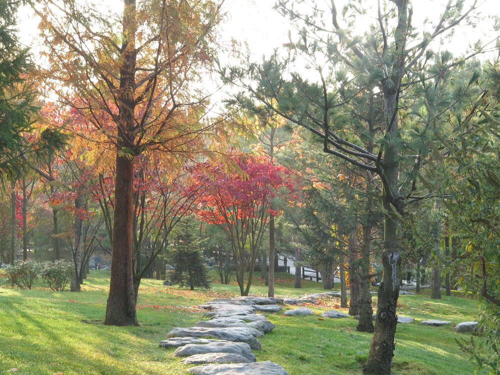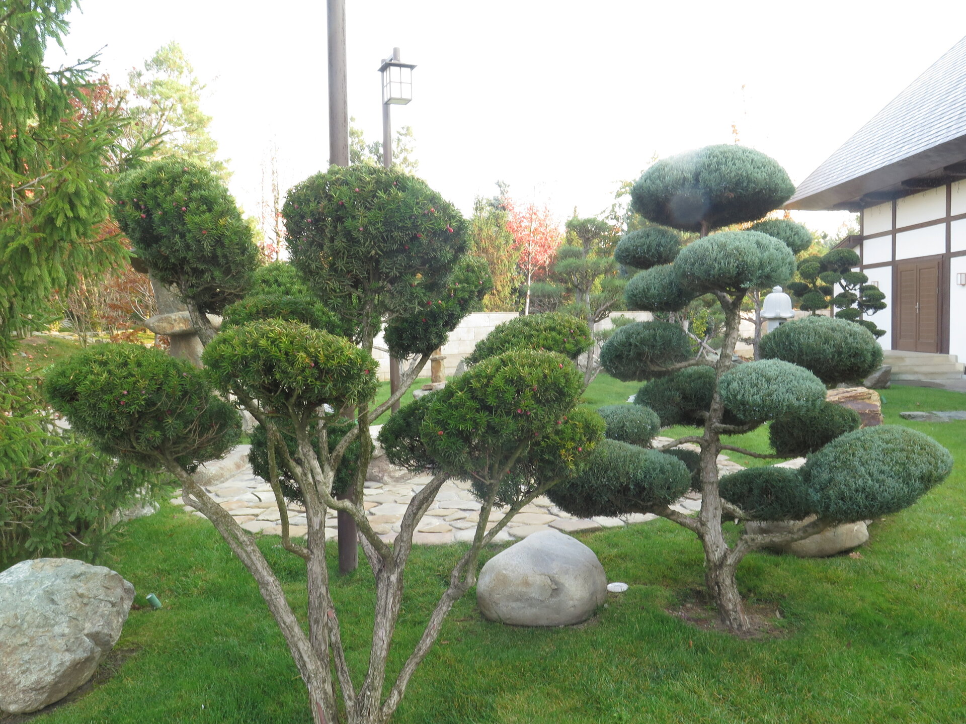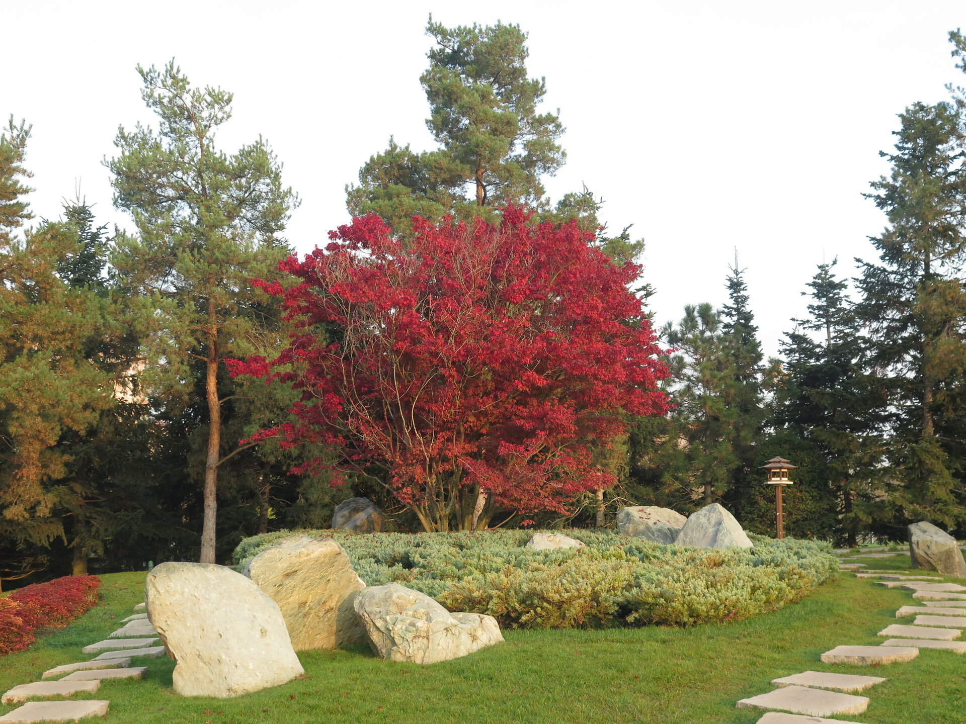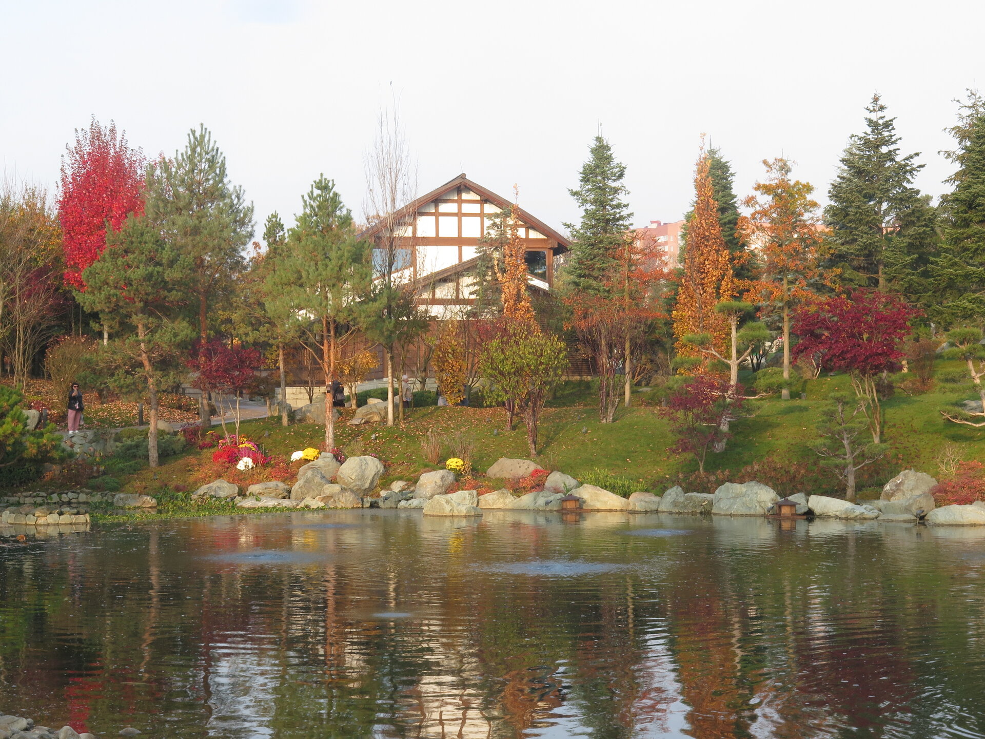 В саду очень много белок. Их не трогают и они здесь ходят пешком и никого не боятся. Но сфотографировать их сложно, они очень быстрые и юркие. Осень время хризантем и дубков. Не могу сказать , что их высажено много, но то что есть смотрится эффектно.