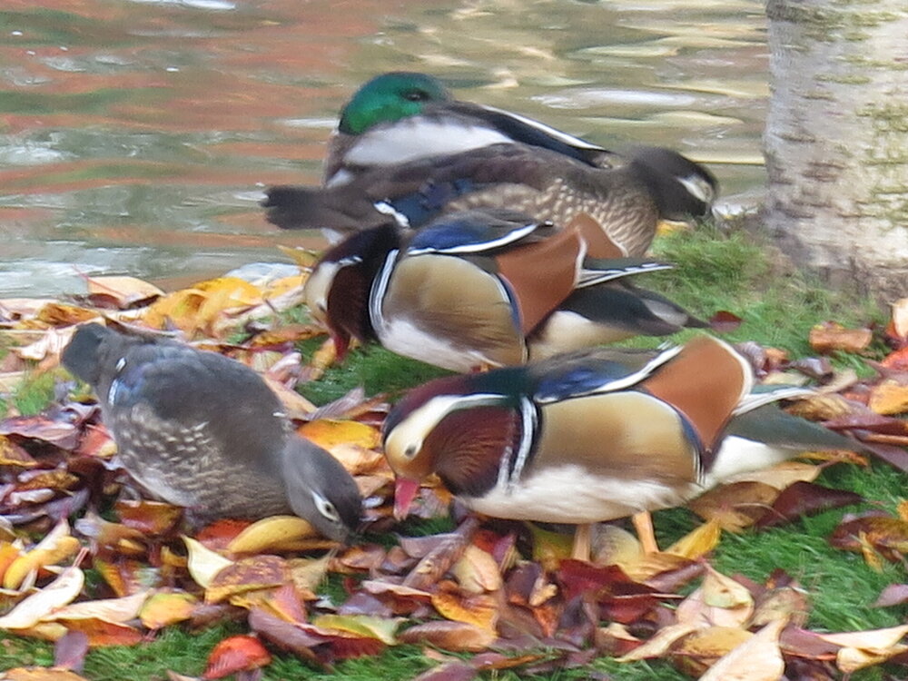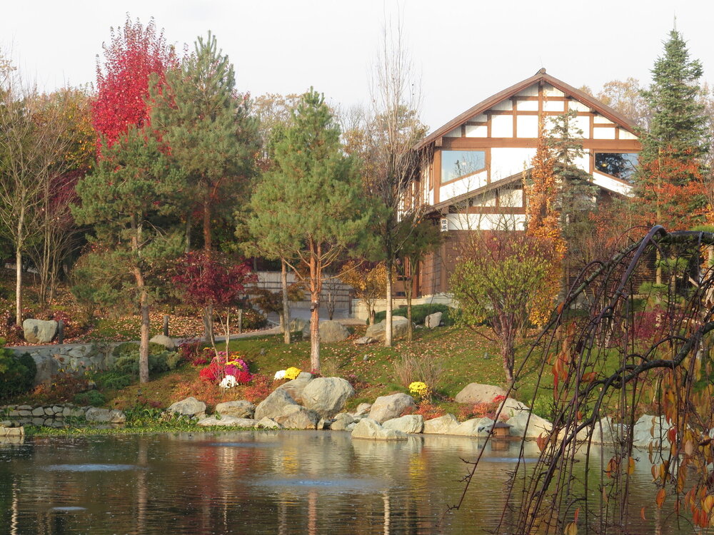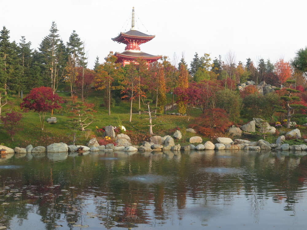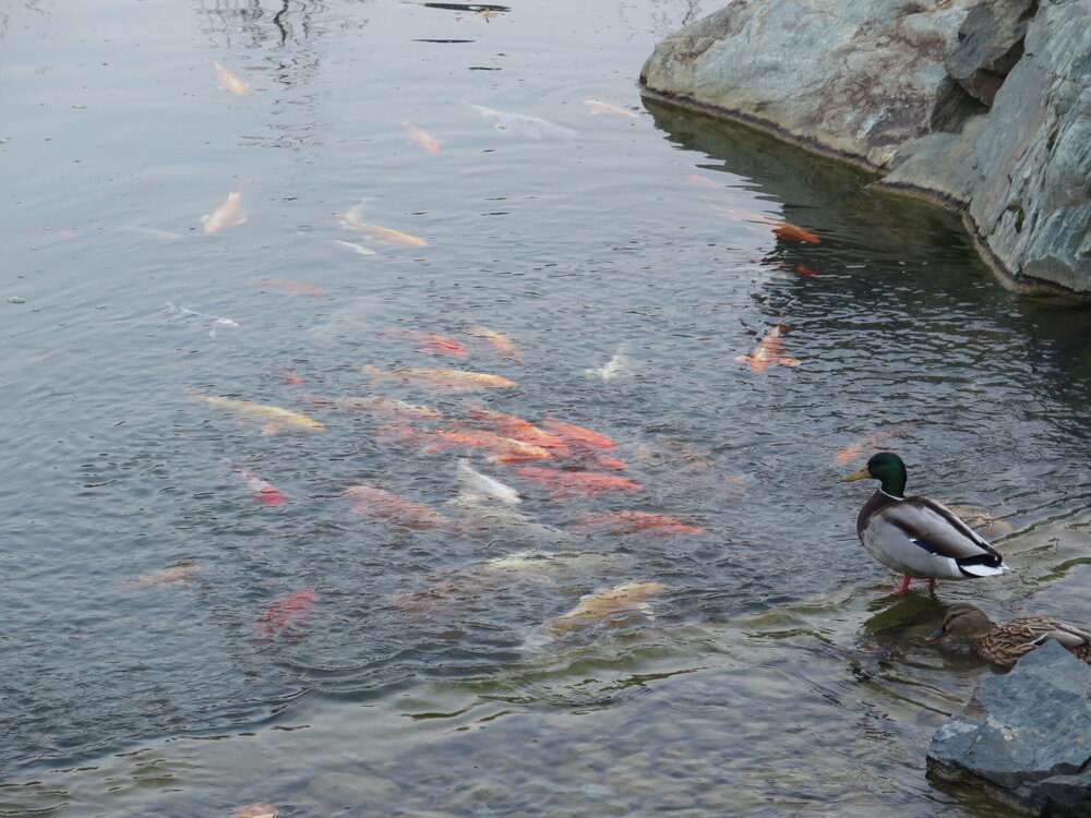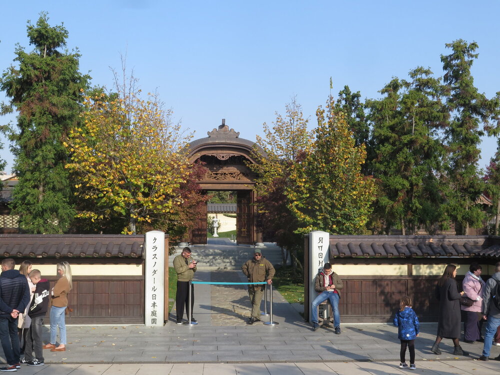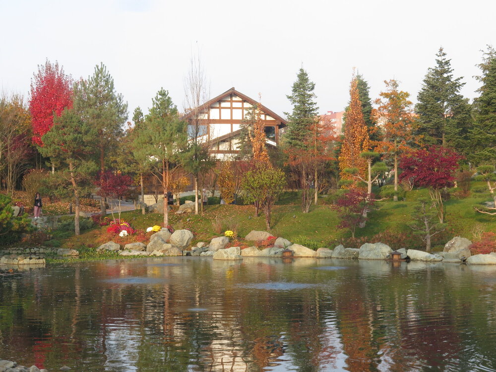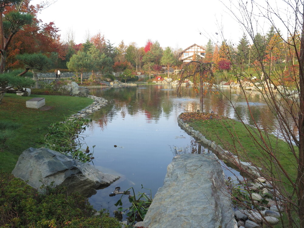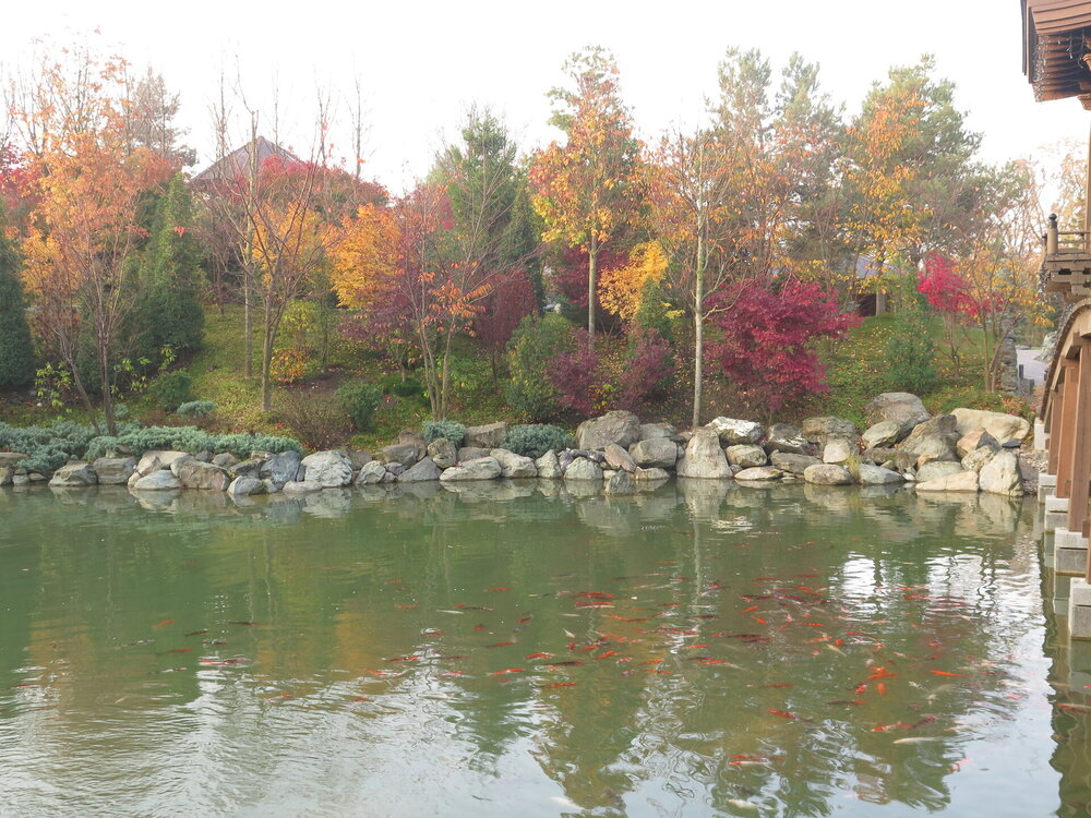 В прошедшую субботу я отправилась посмотреть на осенний Японский сад парка Галицкого. Конечно, стоять там в толпе на входе, в очереди мне не хотелось, но и платить за ресторан 2000 рублей тоже. Стала мониторить интернет, когда же лучше прийти, чтобы попасть в первых рядах. И оказалось, что в 7 утра запускают 150 человек. Одновременно в саду может находиться не более 200 человек. Поэтому 150 бесплатников и 50 тех, кто заплатил за кафе или ресторан. И по данным интернета люди приходят к пяти утра и далее. Поэтому и я встала в 4 утра, взяла такси и в 5 утра была рядом со стадионом. Еще надо было пройти минут 20 вглубь. Парк открывается в 5 утра, на улице темнотища. В парке тоже. Светает ближе к 7 утра. А свет включают в 6 утра. И я иду, горемычная, в полном одиночестве по пустому парку. Напрасно я надеялась перед входом в сад увидеть людей. Там не было никого. То есть в 5.30 утра я была первая. Собственно, а что удивляться. Люди после трудовой недели не настроены на ранний подьем. К тому же сейчас не лето. И на улице темно, что совсем не настраивает на раннее посещение. В начале седьмого пришла женщина и я уже была не в одиночестве. Она рассказала, что на прошлой неделе привезли рано два автобуса по 40 человек. Но это было в праздничные дни. Так что тут не угадаешь. Постепенно стали подходить люди. Но в 7 утра нас было всего лишь пятнадцать человек. Получив коды на терминале, можно было идти и любоваться красотами. Я не ожидала увидеть сад таким нарядным. Весной массово цвели рододендроны, а сейчас приходишь в восторг от японских кленов, которые осенью становятся потрясающе красивыми, красными. Есть здесь большой пруд со своими обитателями. Интересно где эта шикарная рыба зимует? Или её куда то переносят? Уточки мандаринки. -Так хочется рыбы. И почему она такая большая?