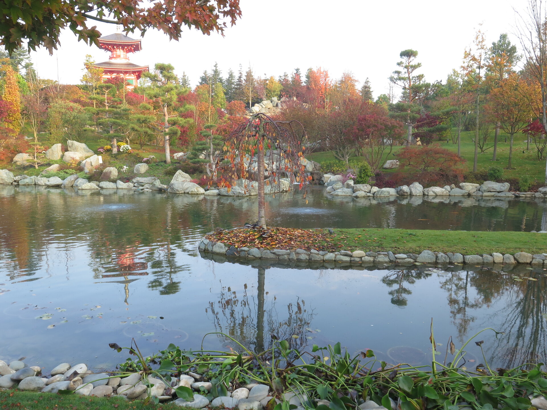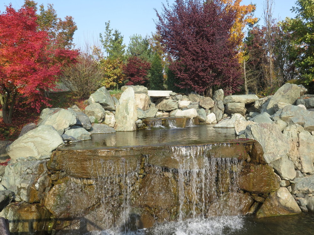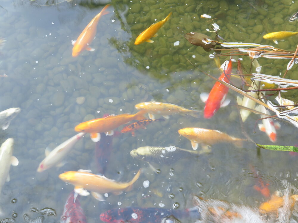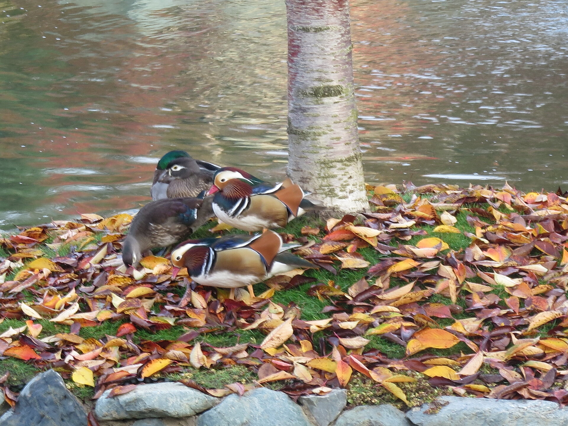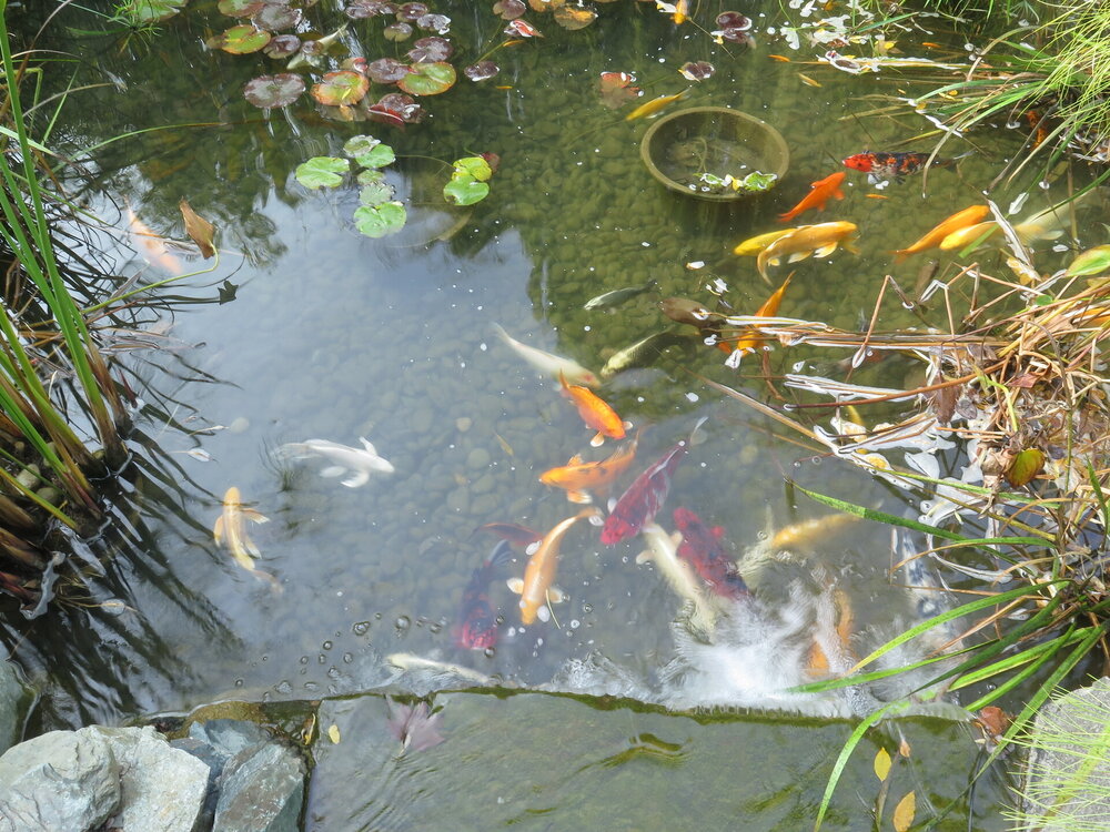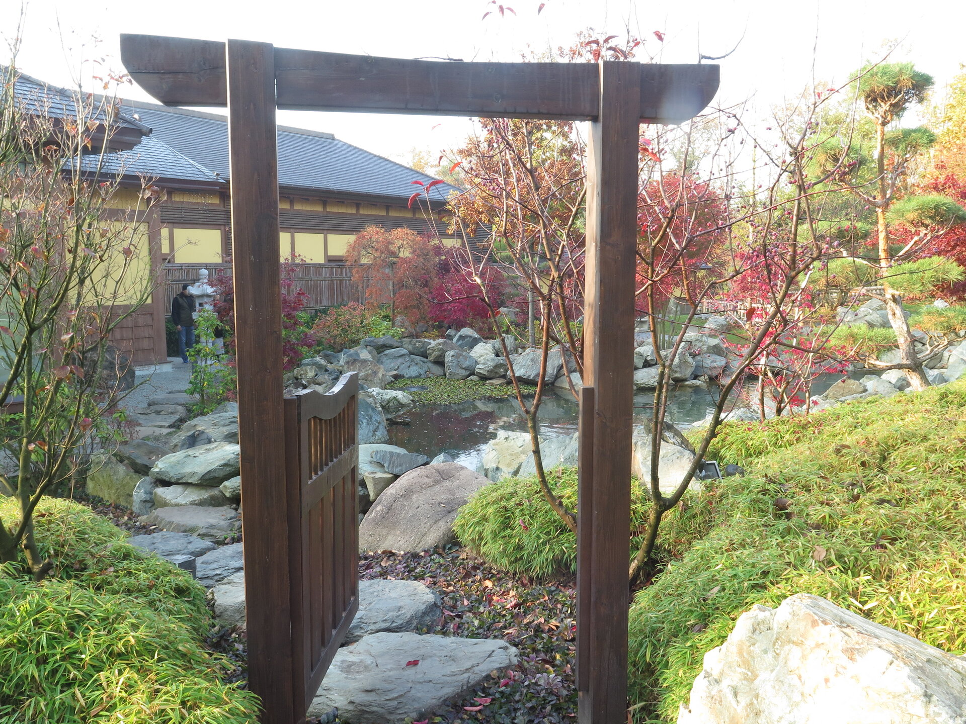 В прошедшую субботу я отправилась посмотреть на осенний Японский сад парка Галицкого. Конечно, стоять там в толпе на входе, в очереди мне не хотелось, но и платить за ресторан 2000 рублей тоже. Стала мониторить интернет, когда же лучше прийти, чтобы попасть в первых рядах. И оказалось, что в 7 утра запускают 150 человек. Одновременно в саду может находиться не более 200 человек. Поэтому 150 бесплатников и 50 тех, кто заплатил за кафе или ресторан. И по данным интернета люди приходят к пяти утра и далее. Поэтому и я встала в 4 утра, взяла такси и в 5 утра была рядом со стадионом. Еще надо было пройти минут 20 вглубь. Парк открывается в 5 утра, на улице темнотища. В парке тоже. Светает ближе к 7 утра. А свет включают в 6 утра. И я иду, горемычная, в полном одиночестве по пустому парку. Напрасно я надеялась перед входом в сад увидеть людей. Там не было никого. То есть в 5.30 утра я была первая. Собственно, а что удивляться. Люди после трудовой недели не настроены на ранний подьем. К тому же сейчас не лето. И на улице темно, что совсем не настраивает на раннее посещение. В начале седьмого пришла женщина и я уже была не в одиночестве. Она рассказала, что на прошлой неделе привезли рано два автобуса по 40 человек. Но это было в праздничные дни. Так что тут не угадаешь. Постепенно стали подходить люди. Но в 7 утра нас было всего лишь пятнадцать человек. Получив коды на терминале, можно было идти и любоваться красотами. Я не ожидала увидеть сад таким нарядным. Весной массово цвели рододендроны, а сейчас приходишь в восторг от японских кленов, которые осенью становятся потрясающе красивыми, красными. Есть здесь большой пруд со своими обитателями. Интересно где эта шикарная рыба зимует? Или её куда то переносят? Уточки мандаринки. -Так хочется рыбы. И почему она такая большая?