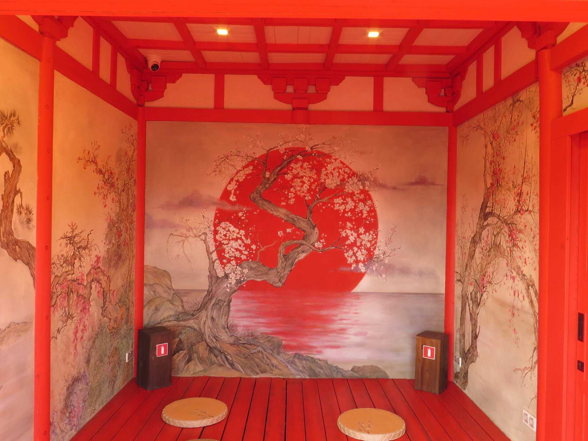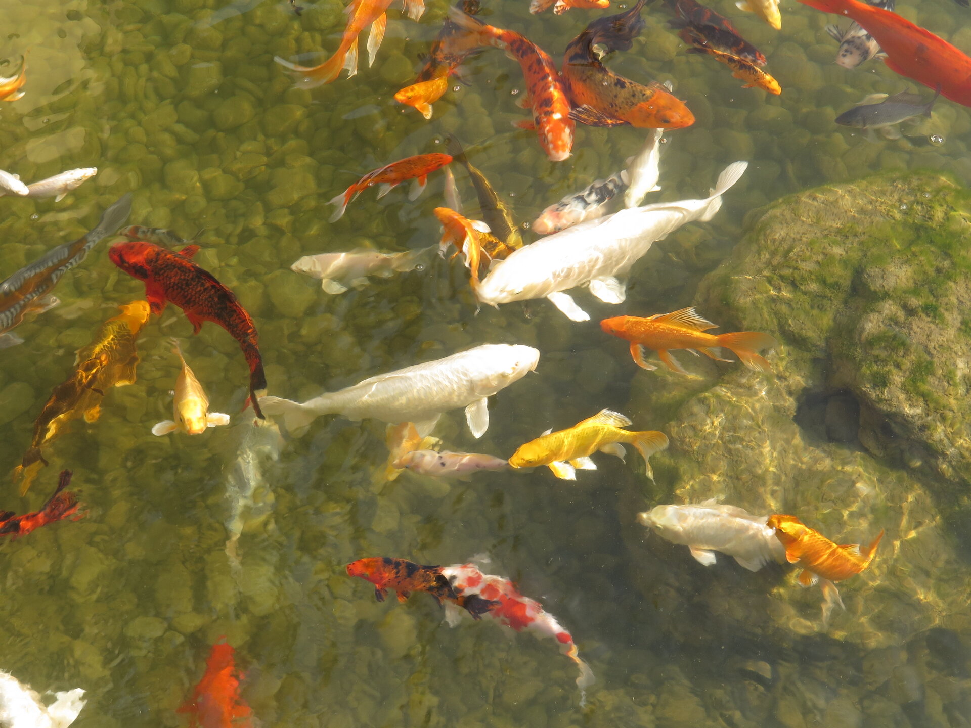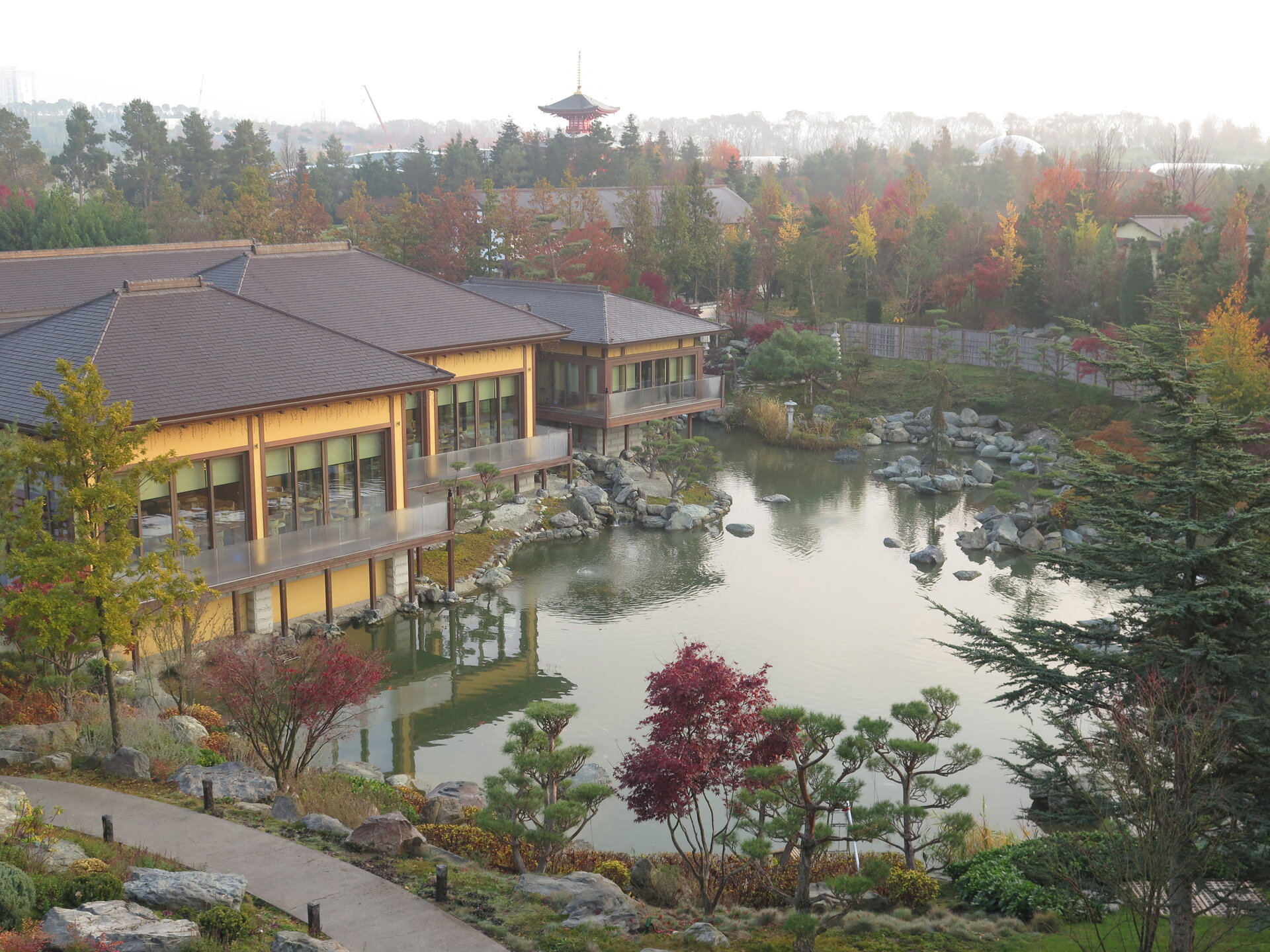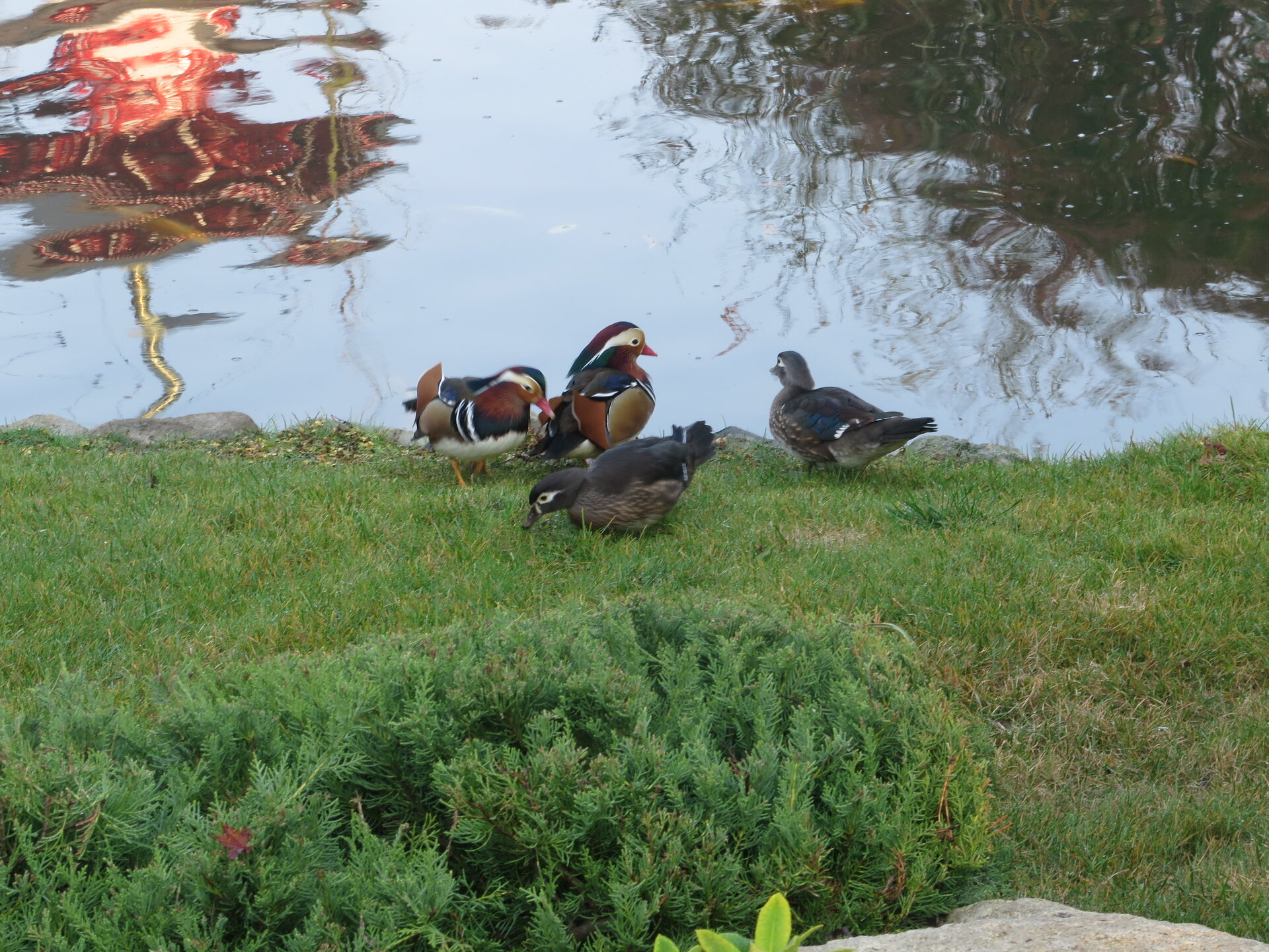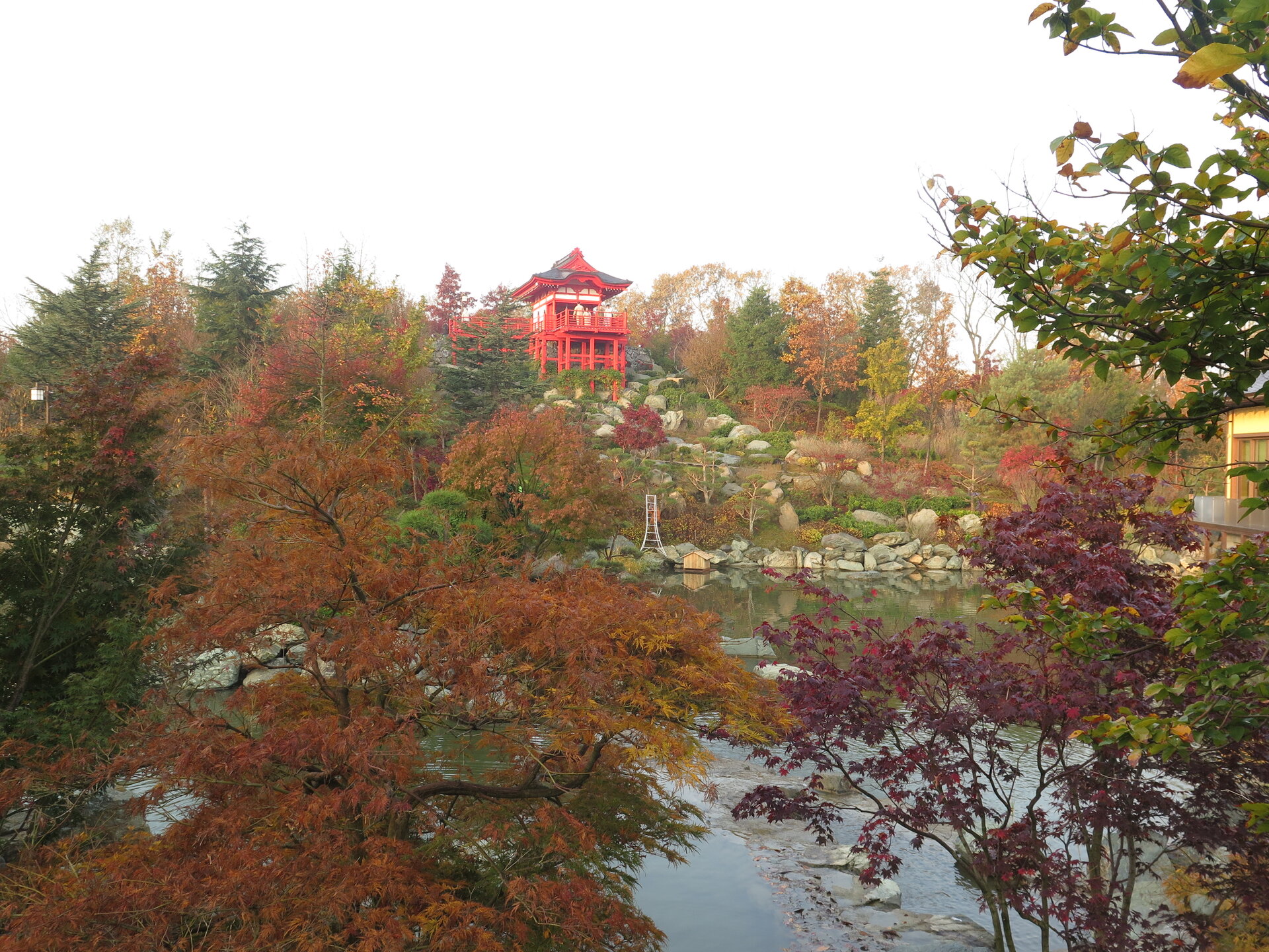 В прошедшую субботу я отправилась посмотреть на осенний Японский сад парка Галицкого. Конечно, стоять там в толпе на входе, в очереди мне не хотелось, но и платить за ресторан 2000 рублей тоже. Стала мониторить интернет, когда же лучше прийти, чтобы попасть в первых рядах. И оказалось, что в 7 утра запускают 150 человек. Одновременно в саду может находиться не более 200 человек. Поэтому 150 бесплатников и 50 тех, кто заплатил за кафе или ресторан. И по данным интернета люди приходят к пяти утра и далее. Поэтому и я встала в 4 утра, взяла такси и в 5 утра была рядом со стадионом. Еще надо было пройти минут 20 вглубь. Парк открывается в 5 утра, на улице темнотища. В парке тоже. Светает ближе к 7 утра. А свет включают в 6 утра. И я иду, горемычная, в полном одиночестве по пустому парку. Напрасно я надеялась перед входом в сад увидеть людей. Там не было никого. То есть в 5.30 утра я была первая. Собственно, а что удивляться. Люди после трудовой недели не настроены на ранний подьем. К тому же сейчас не лето. И на улице темно, что совсем не настраивает на раннее посещение. В начале седьмого пришла женщина и я уже была не в одиночестве. Она рассказала, что на прошлой неделе привезли рано два автобуса по 40 человек. Но это было в праздничные дни. Так что тут не угадаешь. Постепенно стали подходить люди. Но в 7 утра нас было всего лишь пятнадцать человек. Получив коды на терминале, можно было идти и любоваться красотами. Я не ожидала увидеть сад таким нарядным. Весной массово цвели рододендроны, а сейчас приходишь в восторг от японских кленов, которые осенью становятся потрясающе красивыми, красными. Есть здесь большой пруд со своими обитателями. Интересно где эта шикарная рыба зимует? Или её куда то переносят? Уточки мандаринки. -Так хочется рыбы. И почему она такая большая?