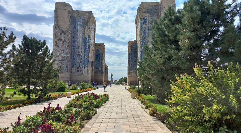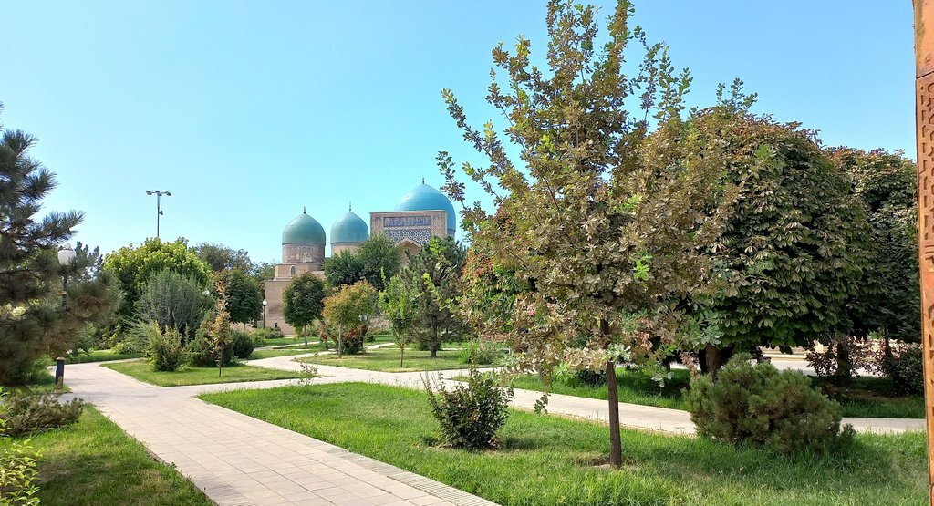 Еще о Шахрисабзе В своих рассказах Шерзод постоянно ссылался на испанского дипломата Руи Гонсалеса де Клавихо. Испанцы были заинтересованы в установлении дипломатических отношений с Тамерланом, и отправили к нему своё посольство. На протяжении всего странствия Руи Гонсалес вел дневник, в котором подробно описывал ход поездки. Его труд «Жизнь и деяния великого Тамерлана, с описанием земель его империи», переведенный на несколько языков, стал великолепным источником, повествующий о важных исторических событиях и наглядно демонтирующий уклад жизни того времени. Летом 1404 г. дипломаты подъехали к большому городу Кеш (Шахрисабзу). Автор в своем дневнике описывает равнинную местность, окруженную горами, с быстрыми ручьями и зелеными садами. Сам же город был защищен оборонительной стеной. Дворец Аксарай как раз в том году и был окончательно построен. Роскошь дворца поразила испанца: «там было столько помещений, что сразу и не расскажешь, отделка золотом, лазурью и разными цветами, достойная удивления даже в Париже, где так много искусных мастеров». Впечатленные рассказами Шерзода и де Клавиха, идем по громадному зеленому парку дальше. Парк размахом впечатляет не менее дворца: Попадается современная скульптура. Кто, что в ней увидит. Я – изуродованную стопу с отрубленным пальцем (навеяно рассказами о жестокости Тимура): По пути исторические постройки различных веков: Медресе XIX века, характерное своей нетипичной планировкой - не замкнутый четырёхугольник с внутренним двором, в который выходят все двери и окна жилых и учебных помещений, а наоборот, квадратное строение, похожее на мечеть, окружённое с трёх сторон айваном: Старинный караван-сарай с нынешним рестораном внутри: Базар Чорсу: Держим курс на мемориальный комплекс Дорут-Тиловат, строительство которого было начато по указанию Амира Тимура и сложилось в целостный комплекс в течение конца XIV – начала XV веков. Название переводится как «Место чтения Священного Корана, место для размышлений, созерцаний». Этот комплекс возведён в память о знаменитом религиозном деятеле XIV века шейхе Кулола, который был наставником отца Тимура, а также самого Тимура. По указанию Тимура был построен однокупольный мавзолей, куда в 1373 году был перенесён прах отца Тимура. В следующие десятилетия мемориал обрастал новыми гробницами, мечетями, медресе, связанными с именами тимуридов (фото из инт-та): Мечеть Кок-Гумбаз ("зелёный купол"), пятничная мечеть Шахрисабза, и медресе при ней, входящие в этот комплекс, построил Улугбек, внук Тамерлана, в 1435—36 годах: Михраб, направление молитвы, в мечети: Выходим из комплекса и идем к следующему объекту, возвышающему вдали. Бордово-зеленые шикарные растения на клумбах - базилик с одуряющим запахом. Следующим летом обязательно посажу у себя на балконе: Взгляд назад на Дорут-Тиловат: и вперед на мемориальный комплекс Дорус-Саодат (вместилище власти): В 20-летнем возрасте умирает младший, любимый сын Тимура, имевшей острый ум и бесстрашие. Тимур видел его престолонаследником. Затем погибает другой 29-летний сын при осаде иранского города. Тимур строит для них склеп, а также начинает строительство склепа для себя здесь же, в своем родном городе. Но, как помните, умер Тимур зимой, когда горный перевал был непроходим, и похоронили его в Самарканде. В комплексе есть медресе 