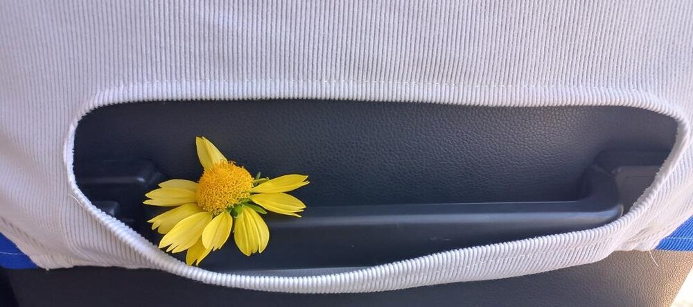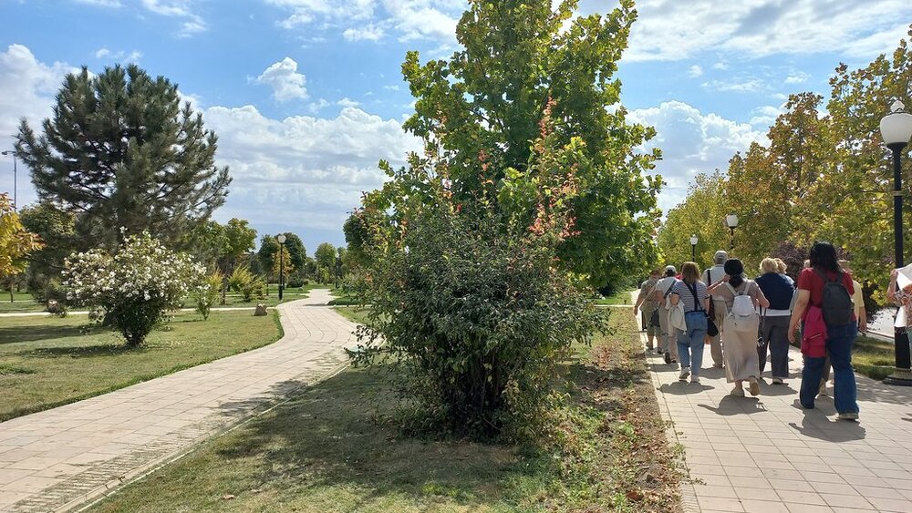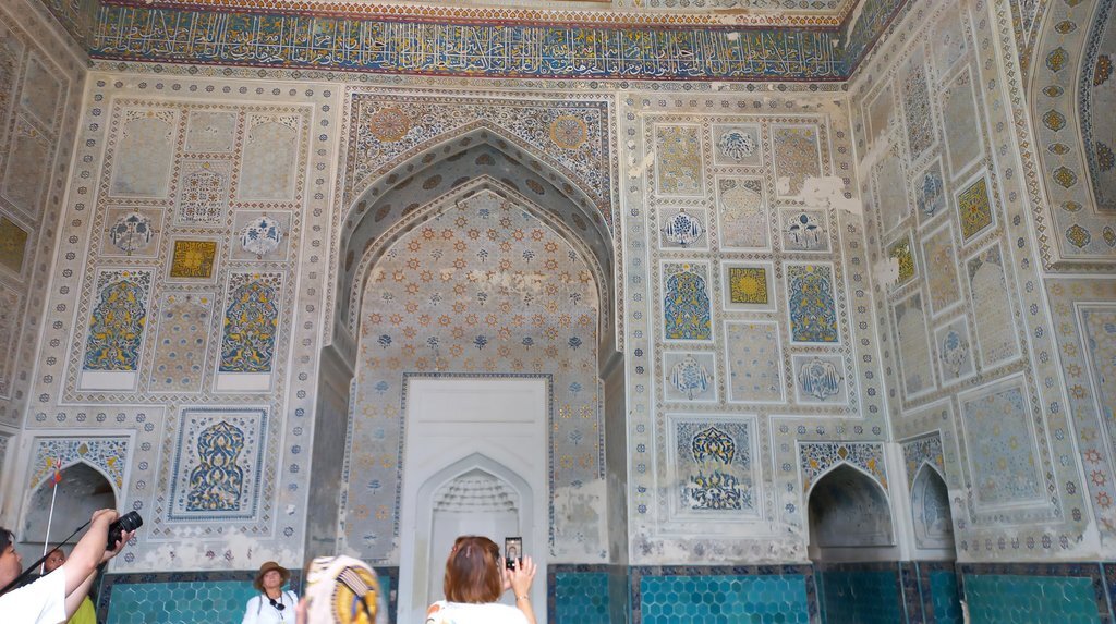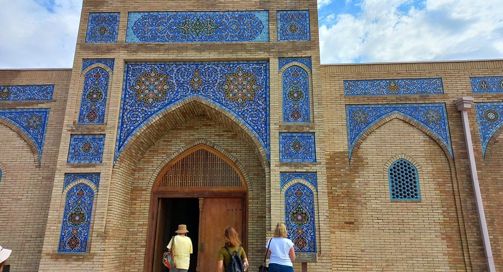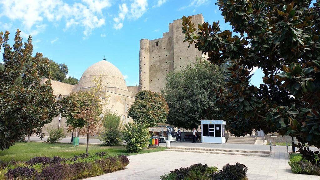 Гиждуван. Медресе Улугбека Недалеко от гончарной мастерской находится исторический комплекс: захоронение местного святого и третье, последнее медресе Улугбека. Оно самое маленькое из трех. Весь комплекс окружен молодым парком: Наружная стена медресе, напротив фонтанчики для омовения: Парадная стена медресе с айваном и надписью арабской вязью - Улугбек: Дерево дает уютную тень и симпатичный вид: Вход во внутренний дворик: Везде сворачивают ковры после джума-намаза: Наши собираются на выход, что-то весело обсуждают: А захоронение святого, к которому паломники ходят уже почти тысячу лет, что-то я упустила, где-то меня носило в то время, как о нем Шерзод рассказывал. Местные нарядные в честь пятницы девочки подарили нам с Раей по цветочку с клумбы. Он красиво вписался в спинку кресла в автобусе:
