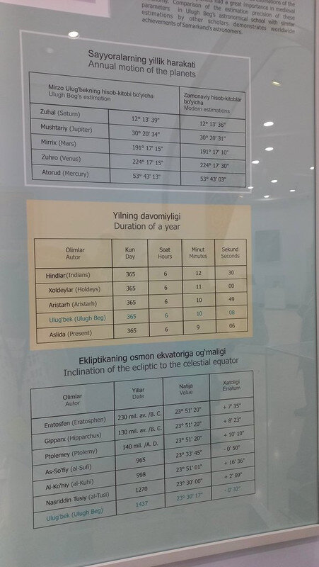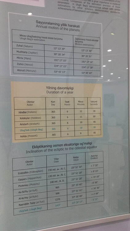 Обсерватория Улугбека После возвращения из Шахрисабза обедаем и едем в обсерваторию Улугбека. Кстати, жгут по краю арки айвана, является символом, отличительным знаком всех построек тимуридов: Улугбек - младший внук Тимура. С юных лет он проявлял склонность к научным занятиям. Ещё в детстве Улугбек имел возможность посетить развалины знаменитой обсерватории Ат-Туси, Насир ад-Дина в Мараге. Это произвело на любознательного отрока сильное впечатление и стало началом его увлечения астрономией. Став правителем, уделял много внимания развитию культуры и науки в государстве, покровительствовал ученым. Построил медресе в Самарканде, Бухаре и Гиждуване. Привлек к преподаванию в самаркандском медресе видных ученых того времени и преподавал в нем сам. Делом жизни Улугбека было открытие обсерватории в Самарканде. Обсерватория была уникальным сооружением для своего времени. Главный инструмент, секстант, был ориентирован по линии меридиана с юга на север. Помимо главного инструмента в обсерватории находились и другие астрономические приборы. Размер секстанта, его удачная конструкция, научные знания Улугбека и его коллег сделали возможным точные астрономические наблюдения. Под руководством и при участии великого астронома Улугбека был составлен главный труд обсерватории “Зиджи Гураган”, “Звездные таблицы Улугбека”. В каталоге содержатся координаты 1018 звезд, определенные этой Самаркандской обсерваторией с невероятной точностью впервые после Гиппарха. Создание астрономического каталога — является выдающимся вкладом в сокровищницу мировой астрономической науки. Остатки секстанта, той его части, что была углублена в землю: Кроме этого, в обсерватории проводились работы по определению наклона эклиптики к экватору и длины звездного года; по вычислению значения синуса одного градуса — важной астрономической постоянной — с точностью до восемнадцатого знака после запятой! Улугбек много раз проверял свои данные и пришел к выводу, что его цифры точны. В 1437 году он определил длину астрономического года: 365 дней 6 часов 10 минут 8 секунд. Как выяснилось позднее, погрешность измерений составила лишь 58 секунд. Если учесть, что длина астрономического года составляет 31 миллион 558 тысяч 150 секунд, то становится ясно, с какой высокой точностью проводил Улугбек измерения: Фантастика, да? Где современники Улугбека и где секстант Улугбека За увлечение Улугбека наукой, его просветительскую деятельность и пренебрежительное отношение к религии ученый был обвинен в ереси. Старший сын Улугбека Абд ал-Латиф, находившийся под влиянием духовенства, объявил ему войну. Она окончилась поражением Улугбека - он был предательски убит как «отступник от ислама». Религиозные фанатики впоследствии полностью разрушили обсерваторию. Стараниями русского ученого В. Л. Вяткина в 1908 и 1914 были произведены первые раскопки обсерватории. Но Улугбек оставил свое имя в веках, прославил свою страну и свой город: