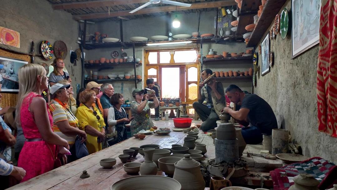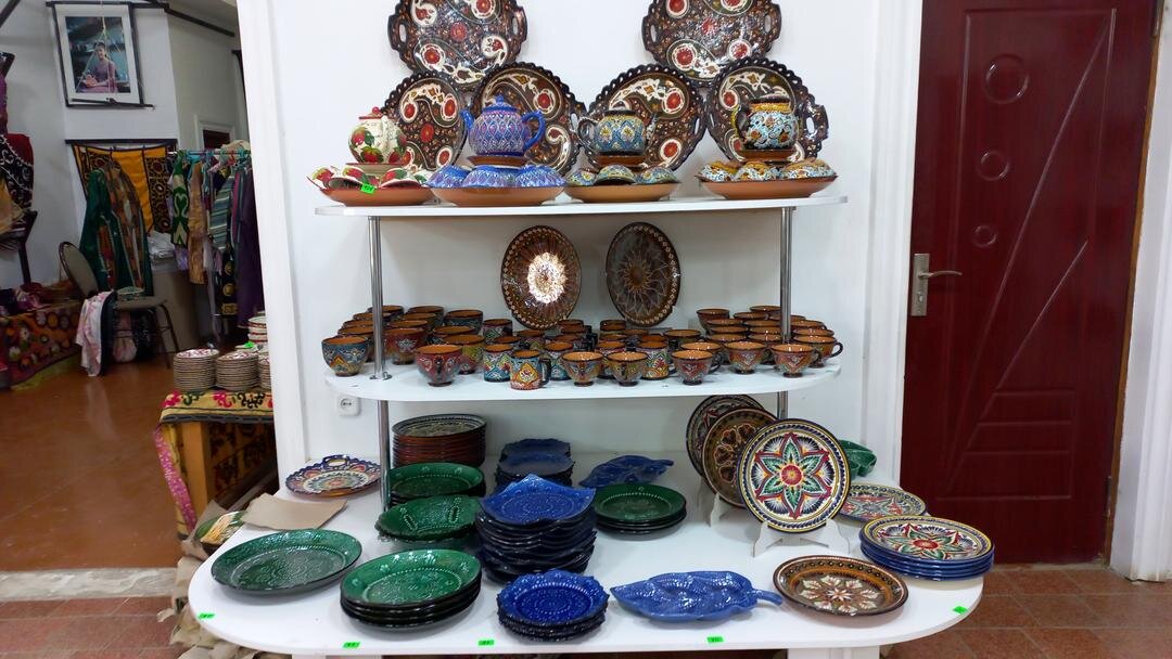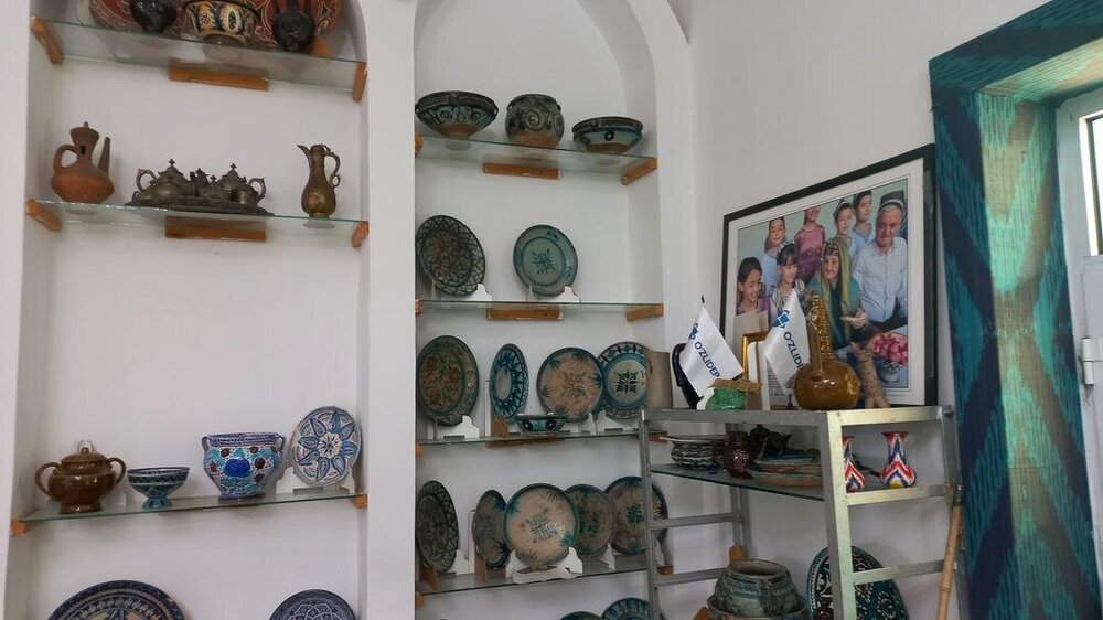 Гиждуван. Гончарная мастерская В километрах 50 от Бухары заезжаем в небольшой городок Гиждуван - один из ремесленных центров Узбекистана, который издревле славился необыкновенно красивой, самобытной керамикой. Гиждуванская гончарная школа по праву гордится уникальностью своих изделий, представляющих собой не столько утварь, сколько произведения искусства. Эту школу отличает использование геометрических форм, а также растительной тематики, птиц и цветов в орнаментах. Подъезжаем к гончарной мастерской. На дороге пробка. Закончился джума-намаз– пятничный полдничный намаз, обязательный для мужчин. Все спешат на работу из мечети расположенного по соседству медресе всё того же умницы Улугбека. Совершается джума-намаз только в мечетях, специально отведенных для джума-намаза. Обычно это главная мечеть города -джума-мечеть. Перед молитвой мусульманину желательно совершить полное омовение, остричь ногти и надеть чистые, праздничные одежды. Желательно также надушиться благовониями. Есть чеснок, лук и другие продукты с острым запахом перед посещением мечети запрещено. Коран: "О вы, которые уверовали! Когда возглашают азан (призыв) на пятничную молитву, то устремляйтесь поминать Аллаха усердно, оставив торговлю. Ведь то, что велено вам, лучше для вас, если вы знаете! Завершив молитву, разойдитесь по земле, отстаивая свои интересы и ища милости Аллаха, и часто поминайте Аллаха своим сердцем и словами. Может быть, вы преуспеете в этой и будущей жизни." Во многих мечетях висит расписание намазов. Их пять: полуденный намаз всегда в астрономический(!) полдень, а время других намазов связано с восходом и заходом солнца, поэтому непостоянно: Джума-намаз – обязателен. При этом, пятница в Узбекистане – рабочий день, в отличие, например, от Ирана, где выходные – пятница и суббота. Здесь на намаз мужчин отпускают с работы. Совершив его, на работу возвращаются. Иногда отрабатывают это время, иногда нет, иногда добровольно отрабатывают даже больше, чем отсутствовали. Вернемся к гончарам. Они уже на рабочем месте, проводят нам экскурсию: Родоначальником династии считется усто (что означает - мастер, виртуоз своего дела) Шарифиддин Гиждувоний, родившийся в 1790 году. А огромная заслуга в возрождении почти утерянного в середине 20 века ручного ремесла и традиционных старинных технологий принадлежит Ибадулло Нарзуллаеву. Династия трагически оборвалась в годы сталинских репрессий - погиб отец 5-летнего Ибадулло и его брат. От забвения династию спас другой известный усто Гиджувана Усман Умаров. Он усыновил оставшегося без отца маленького Ибадулло. От приёмного отца будущий усто перенял мастерство гончара-формовщика и керамической росписи и стал хранителем обеих династий и традиционной керамической школы Гиждувана. Ибадулло создал не только свой индивидуальный стиль, но и передал свое мастерство сыновьям Алишеру и Абдулло и дочери Нодире. Это шестое поколение, продолжающее традиции создания керамических изделий своей семьи. Ходим по территории дома, построенного Ибадулло: Рассказывает его внучка: «Дедушка был патриотом. Он не мог позволить себе потерять традиции, которые столетиями передавались от отца к сыну. Очень старался держать бренд семьи, поэтому начал обучать своих сыновей с раннего возраста. Мой папа, Абдулло Нарзуллаев, с пяти лет проводи