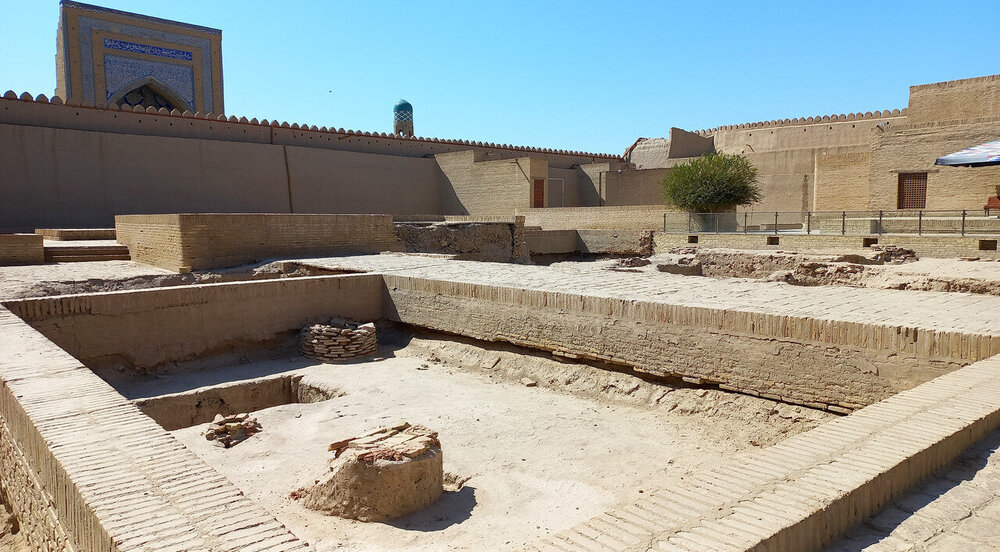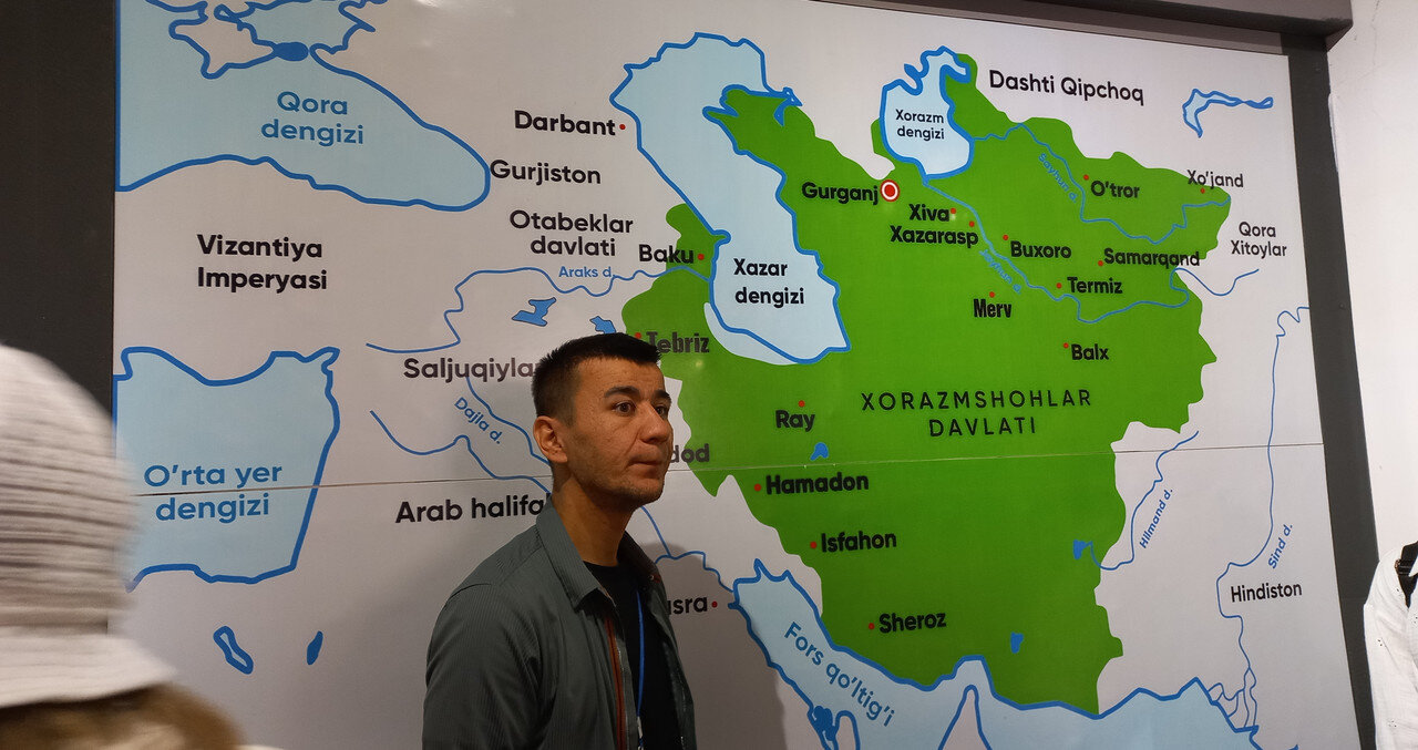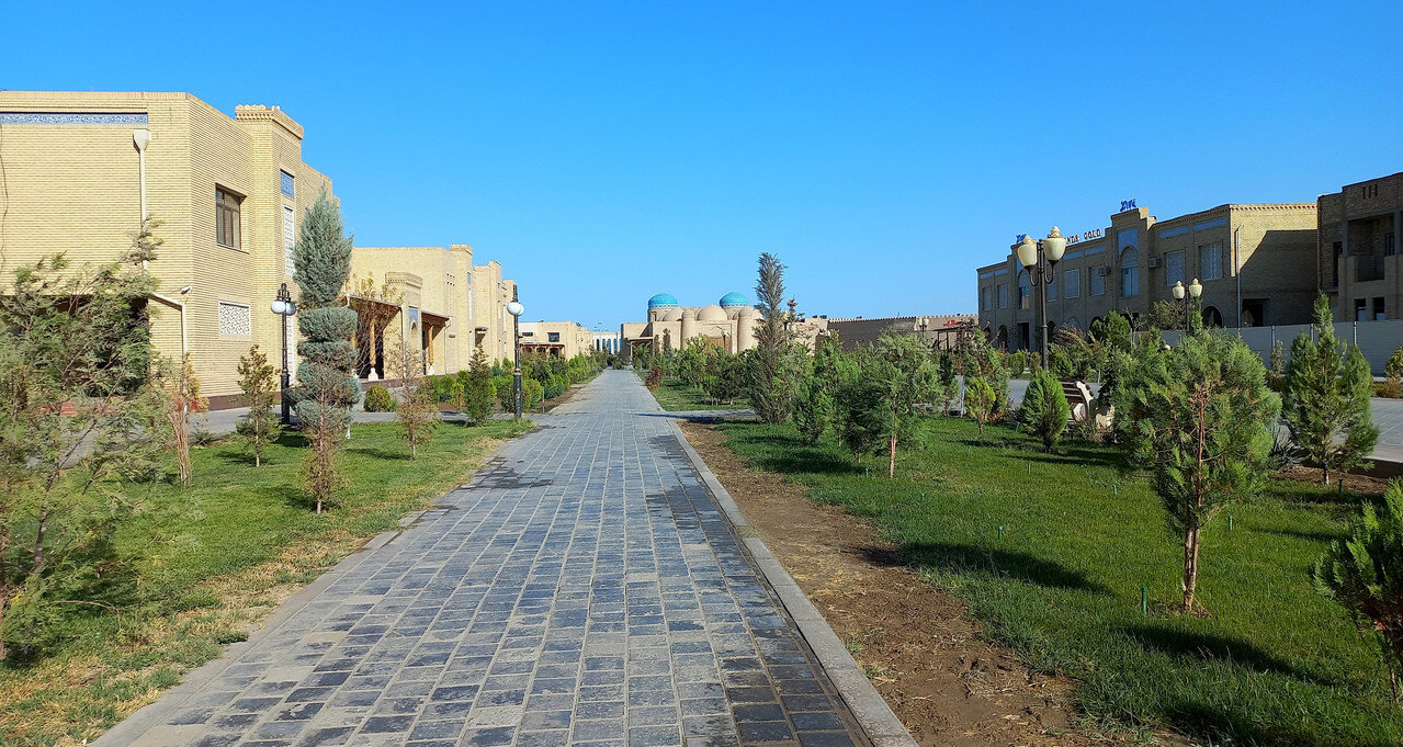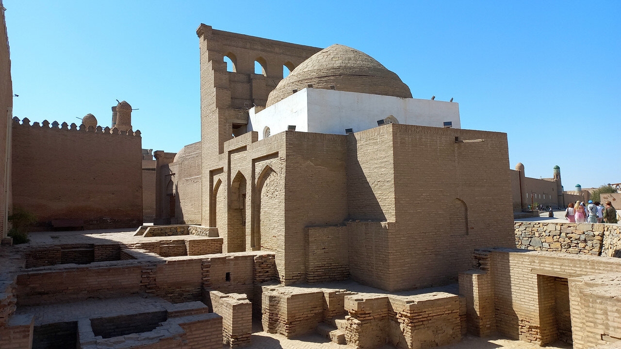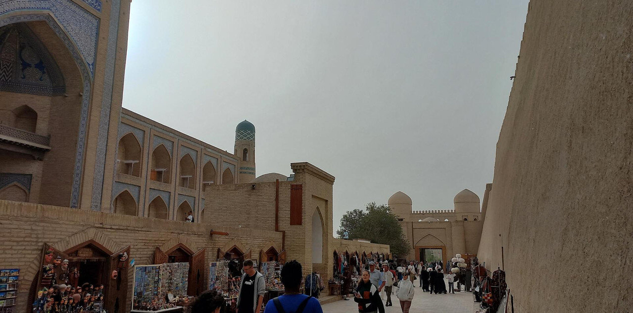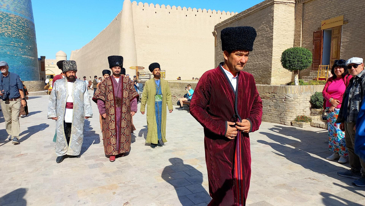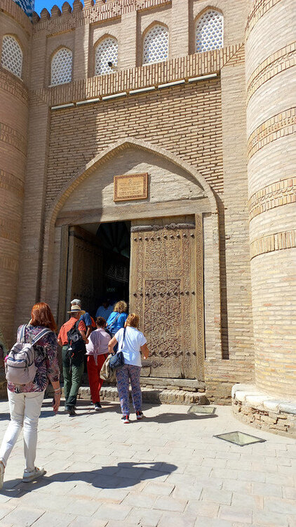 Через дорогу от медресе Амин-хана с его недоделанным минаретом находится Куня Арк, что переводится, как старая крепость. Арками называют крепость с дворцом правителя одновременно внутри города. Помните, бухарский Арк? Хивинская резиденция ханов находится за высоченной стеной у парадных западных ворот. Вот, пожалуйста - впереди парадные ворота в Ичан-Калу, слева медресе Амин-хана, позади Кальта- минор, а справа высоченные стены хивинского Арка с ханским дворцом внутри, ханской канцелярией, залом для приёмов, гаремом, зимней и летней мечетью, монетным двором и подсобными помещениями: конюшнями, складами, мастерскими. Это был целый маленький город внутри Ичан-Калы за вторыми стенами: А если встать задом наперед, то стены Арка слева: Перед входом в Арк большая площадь, где проходили парады, рубились головы, оглашались указы: Никак не могу понять, почему нахожу кучу причин и дел, чтобы не писать про Хиву, а если пишу, то делаю это через силу. Возможно, потому, что я всё интересное про нее пропустила. Ходила, как чумная от недомогания, мало слушала, мало фотографировала. Сейчас изучила карту с панорамами Ичан-Калы, хотя бы сориентировалась в пространстве и поняла, что у меня находится на редких фотографиях (даже фотографировать там уже не хотелось). Поэтому не буду ничего через силу читать про Куня Арк, чтобы рассказать, а просто вставлю немного фотографий внутренних двориков крепости. Вход со старинными дверями: Вроде бы, двор приемов: "Под ногами путалась" другая группа со своим предводителем: Какие-то развалины и карта Хорезма напоследок: И на обед: После обеда распрощались с Шерзодом. Он улетел в Ташкент на встречу со следующей группой. А мы еще немного погуляли и побрели по безлюдному бульвару в отель. Полив деревьев. Не так-то просто растить в Каракумах бульвары: Тяга к жизни в пустыне: Впереди еще одни старинные ворота, наверно от третьего транспортного крепостного кольца: Рая собралась с группой товарищей в ночную пустыню на берегу канала с ужином из свежепойманной рыбы, а я напилась всяких снадобий и с удовольствием улеглась в постель. Ночью - вылет. Осталось подвести итоги.