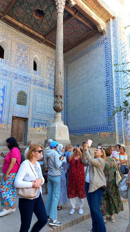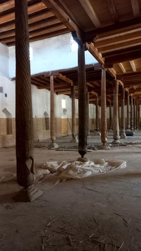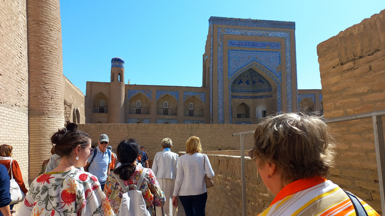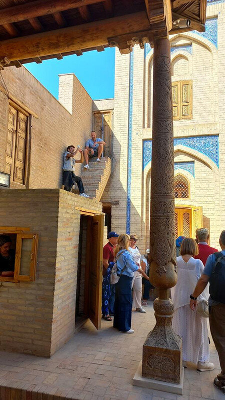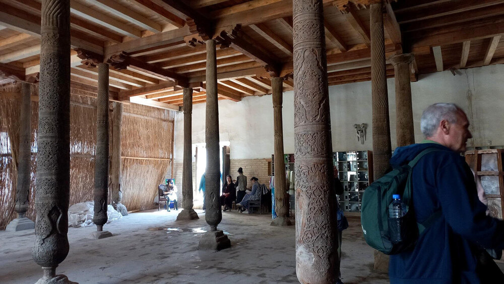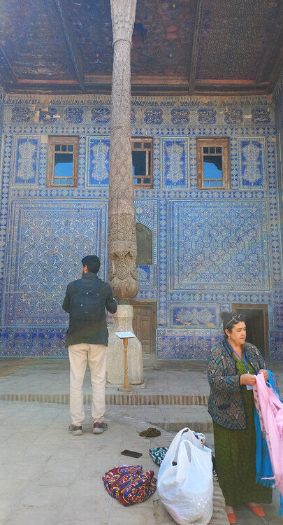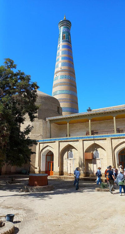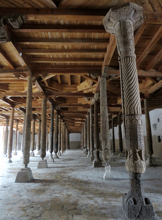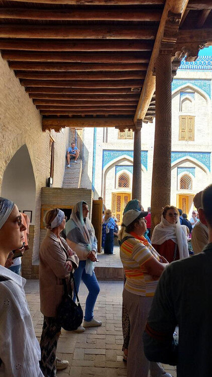 Хива. День второй. Утром собираемся в холле отеля на экскурсию На улице сегодня яркое солнце, совсем незатуманенное пылью, хотя ветер опять очень сильный. Куда делась пыль, непонятно. Молодой человек из группы, уже пробежавшийся по округе, сказал, что на улице жарко. Поверила ему и оделась легко. Сегодня я уже конкретно разболелась. Градусника не было, температуры скорее всего тоже, так как пот лился градом. Поэтому порывы холоднющего ветра на длинном бульваре меня совсем не радовали. Надеялась, что за стенами Ичак-Калы ветра не будет, но напрасно. Экскурсия началась с медресе Амин-хана. Того самого хана, который замахнулся на строительство самого высокого минарета Кальта-Минор, да погиб, не достроив. Но медресе сначала всё же построил. Над входом в медресе красуется надпись на арабском языке: "Это прекрасное сооружение вечно будет стоять на радость потомкам". Спасибо Амин-хану. Медресе порадовало. Это медресе самое большое в Средней Азии. Двухэтажное здание занимает внушительную площадь 72 на 60 метров и вмещает 125 худжр (келий), рассчитанных на 260 студентов. Уникальность планировки заключалась в том, что каждая худжра состояла из двух комнат, а худжры второго этажа имели еще и лоджию, выходящую на фасад здания, что обеспечивало студентам комфортные условия для учебы и отдыха. Где-то остался кусок древней мостовой: Выходим опять на центральную улицу: Ветер здесь свистал, и я устремилась за этими колоритными личностями к нашим восточным воротам - утепляться в отель. У ворот скучали три транспортных туристических средства. На одном их них, обдуваемая со всех сторон, я прокатилась за оставшиеся сумы до отеля. Водитель меня подождал и домчал обратно. На бульваре, что мы не ходили, встретилось за все время всего несколько одиночных туристов. Ощущение, что все отели вдоль бульвара пустуют. Как ни странно, я сразу нашла нашу группу. У Джума-мечети. Мечеть известна уже более тысячи лет, и все эти века внутри неё разрастается лес из резных деревянных колонн - сейчас их 212: Фото из инт-та: У каждой колонны своя история и неповторимый вид. Например, одну из колонн, по легенде, привёз из Индии хорезмский силач Палван-Махмуд. Выдержав множество поединков, он показал себя непобедимым, и в награду от индийского султана попросил освободить всех пленных хорезмийцев, вместе с которыми и с этой колонной в придачу вернулся домой. Его именем названы восточные ворота, главная улица, идущая от западных ворот до восточных. Дальше мы были еще где-то, наверно, в караван-сарае И у мавзолея:
