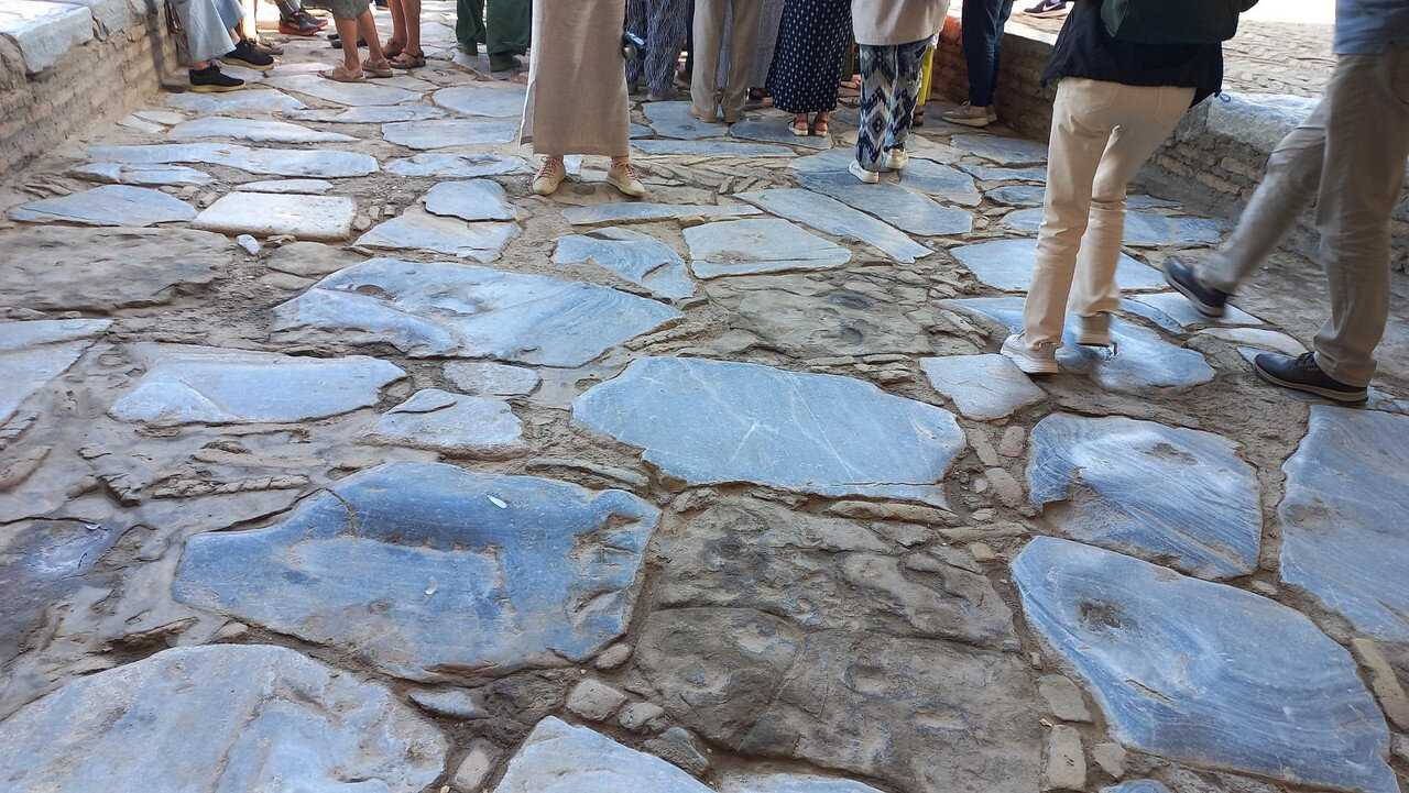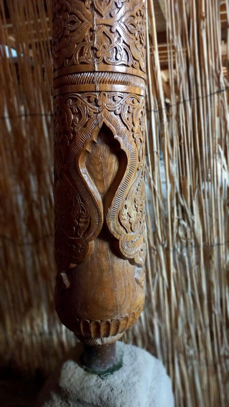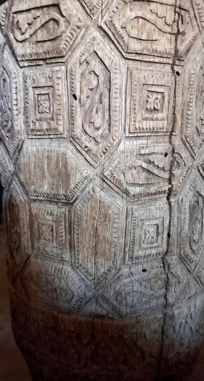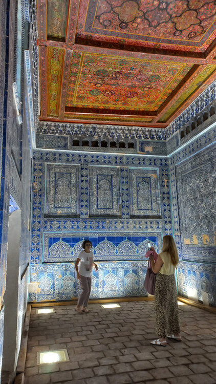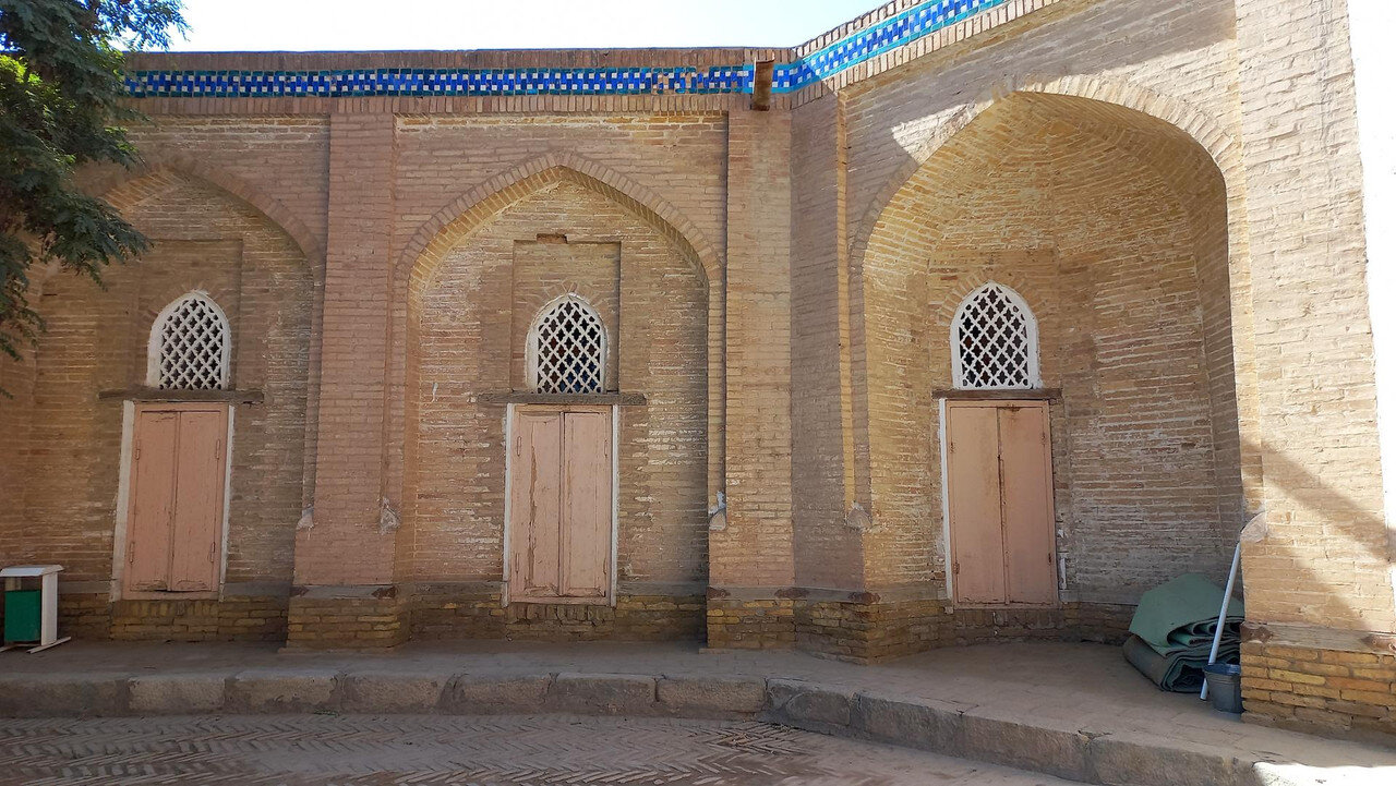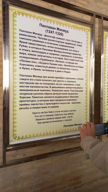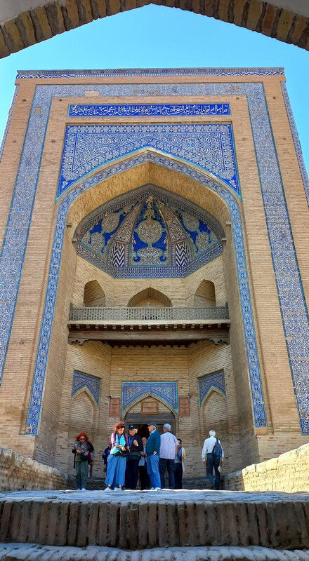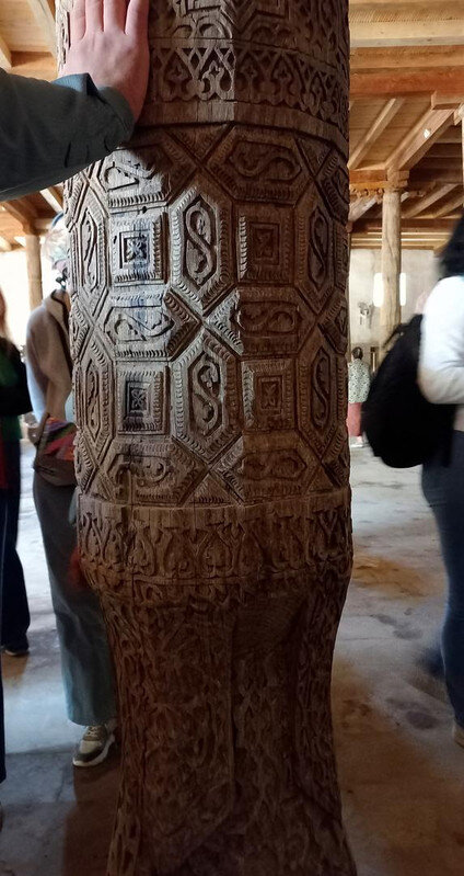 Хива. День второй. Утром собираемся в холле отеля на экскурсию На улице сегодня яркое солнце, совсем незатуманенное пылью, хотя ветер опять очень сильный. Куда делась пыль, непонятно. Молодой человек из группы, уже пробежавшийся по округе, сказал, что на улице жарко. Поверила ему и оделась легко. Сегодня я уже конкретно разболелась. Градусника не было, температуры скорее всего тоже, так как пот лился градом. Поэтому порывы холоднющего ветра на длинном бульваре меня совсем не радовали. Надеялась, что за стенами Ичак-Калы ветра не будет, но напрасно. Экскурсия началась с медресе Амин-хана. Того самого хана, который замахнулся на строительство самого высокого минарета Кальта-Минор, да погиб, не достроив. Но медресе сначала всё же построил. Над входом в медресе красуется надпись на арабском языке: "Это прекрасное сооружение вечно будет стоять на радость потомкам". Спасибо Амин-хану. Медресе порадовало. Это медресе самое большое в Средней Азии. Двухэтажное здание занимает внушительную площадь 72 на 60 метров и вмещает 125 худжр (келий), рассчитанных на 260 студентов. Уникальность планировки заключалась в том, что каждая худжра состояла из двух комнат, а худжры второго этажа имели еще и лоджию, выходящую на фасад здания, что обеспечивало студентам комфортные условия для учебы и отдыха. Где-то остался кусок древней мостовой: Выходим опять на центральную улицу: Ветер здесь свистал, и я устремилась за этими колоритными личностями к нашим восточным воротам - утепляться в отель. У ворот скучали три транспортных туристических средства. На одном их них, обдуваемая со всех сторон, я прокатилась за оставшиеся сумы до отеля. Водитель меня подождал и домчал обратно. На бульваре, что мы не ходили, встретилось за все время всего несколько одиночных туристов. Ощущение, что все отели вдоль бульвара пустуют. Как ни странно, я сразу нашла нашу группу. У Джума-мечети. Мечеть известна уже более тысячи лет, и все эти века внутри неё разрастается лес из резных деревянных колонн - сейчас их 212: Фото из инт-та: У каждой колонны своя история и неповторимый вид. Например, одну из колонн, по легенде, привёз из Индии хорезмский силач Палван-Махмуд. Выдержав множество поединков, он показал себя непобедимым, и в награду от индийского султана попросил освободить всех пленных хорезмийцев, вместе с которыми и с этой колонной в придачу вернулся домой. Его именем названы восточные ворота, главная улица, идущая от западных ворот до восточных. Дальше мы были еще где-то, наверно, в караван-сарае И у мавзолея: