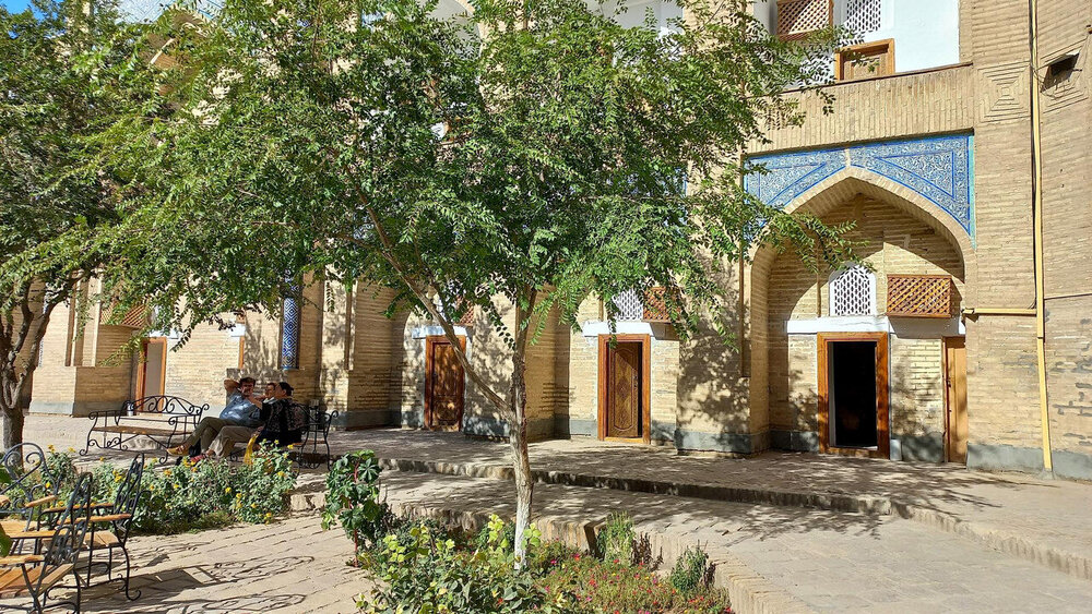 Бухара. Музей кукол, махалля, медресе Чор-минор Здесь же на берегу канала напротив Ляби-хауза есть музей театральных кукол. Основатель музея-мастерской Искандар Хакимов когда-то загорелся идеей сделать представление про узбекские традиции, и постепенно на место живых актеров пришли куклы. Когда этнографический кукольный спектакль был доведен до идеала, его создатель увлекся самой идеей создания необычных кукол, оставил работу в кукольном театре и открыл этот музей. И всё это благодаря одному случаю: как-то в конце 90-х годов после спектакля одна зрительница взяла в руки куклу и умоляла продать ее - ведь, она была так похожа на эту женщину. После долгих уговоров Искандар Хакимов сдался, хотя эта кукла играла одну из ведущих ролей, и была в единственном экземпляре. Возникла необходимость создать новую, и основатель мини-театра решил лично заняться изготовлением кукол. И это послужило толчком к созданию музея. Сегодня музей национальных кукол в Бухаре представляет собой небольшой выставочный зал, в котором собраны самые разные образы: Куклы имеют рост 40-50 сантиметров, и созданы из папье-маше. Также, как и люди, каждая кукла имеет свои уникальные черты лица и эмоции, особые наряды. Образы, созданные кукольным мастером Искандаром, основаны на реальных людях, которых он мог увидеть в кино или новостях, и даже на улице. И именно схожесть кукол с человеческой индивидуальностью сделала этот музей таким особенным. Есть гости, которые, как и та женщина, продолжают находить сходство с собой или своими знакомыми. Есть куклы. похожие на известных артистов, певцов, политических деятелей. Здесь хранится коллекция фотографий со своими двойниками. Сейчас кукол можно здесь купить. Искандар Хакимов по-прежнему занимается созданием своих необычных кукол. Процесс создания куклы включает несколько этапов: эскиз, гипсовая форма тела, папье-маше, роспись лица, пошив одежды. В мастерской работают 17 человек. Мужчины занимаются созданием форм будущих кукол, а женщины шьют одежду и головные уборы, крепят украшения. За неделю плодотворной работы здесь могут сделать около 15 кукол. А иногда здесь устраиваются мастер-классы, раскрывающие секреты и тонкости создания этих харизматичных кукол. Нам хозяин показал маленький спектакль с куклами: Из музея идем через махалля к автобусу. Наконец-то мы попали в эти махалля. Интересно, чисто, аккуратно. Нет каляк-маляк на стенах, нет переполненных мусорных баков, но и мусора на дороге тоже нет. Наш частный сектор бывает не столь аккуратен. Здесь кто-то вспомнил еще анекдот-историю о Насреддине: Как-то в один из таких домов залез воришка и начал рыться в вещах, не заметив спящих хозяев. Жена проснулась и ткнула Ходжу Насреддина в бок, шёпотом сказав, что в доме вор. Насреддин так же шёпотом жене ответил: -Не спугни! Вдруг что-нибудь найдёт? **** В одном месте сворачиваем с курса в сторону. Последний объект: медресе Халифа Ниязкула, или Чор-минор (четыре башни). При строительстве этого медресе в 1807 году были нарушены все каноны. А всё потому, что кто платит, тот и дизайнер. В медресе могли остановиться на ночлег путники и торговцы, следующие по Шелковому пути, независимо от веры. Четыре башни символизируют четыре стороны света и четыре религии - ислам, христианство, иудаизм и буддизм. У каждой - свой декор, узор не повторяется. Купол в 