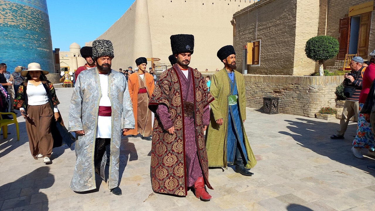 Хива Хива стала столицей Хорезма после Ургенча в 16 веке, и Хорезм стал называться Хивинским ханством. А Ичан-Кала - внутренний город Хивы, крепость с 10-метровыми зубчатыми стенами в высоту и 5-6 метровой толщиной, за которыми в лабиринте узких улиц стоят мечети, медресе, минареты, дворцы и жилые дома. Это - город-музей, но на его территории, как и в средние века, живут люди, около 2 тысяч. Ичан-Кала имеет форму прямоугольника примерно 800х400 м. С каждой стороны имеются ворота с ударными защитными башнями. Мы заходим через Восточные. Они же - Палван-Дарваза, Богатырские ворота (названы в честь знаменитого борца и поэта древности Палвана, или Пахлавана) или Невольничьи ворота (ранее справа от них располагался большой невольничий рынок). Фото только вечернее есть, когда оглянулись, уходя: При чтении про эти ворота попалась необычная легенда. Недалеко за воротами находятся бани и мечеть. История их строительства такова: один из правителей Хивы имел девять сыновей, но очень хотелось ему иметь дочь, и десятым ребенком он наконец её получи - дочь Ануш. Прошли годы, и затеял этот хивинский хан войну с бухарским ханом (такая война, действительно, была), но войну проиграл, и был пленен. Выручать незадачливого папашу отправились не сыны, которые уже делили трон меж собой, а Ануш. Она заключила с бухарским ханом пари: если сможет изумить его, он отпустит отца. И отпустил, ведь. Потому что Ануш изумила, раздевшись при нем донага. Дочь оказалась сыном, просто от хивинского хана это скрыли, чтобы не огорчать Растроганный и тоже изумленный хивинский хан молвил: -Я думал, у меня есть девять сыновей и одна дочь, а оказалось, что у меня есть только один сын, - и передал трон Ануш, а заодно построил в честь нее него бани и мечеть. По узкой улице, рассекающей Ичан-Калу посередине, доходим до западных ворот. Это главные ворота крепости, через которые сюда и заходят туристы, ибо живут в маленьких отелях старого города за стенами Ичан-Калы. У нас же - большая группа, поэтому мы жили везде в больших помпезных отелях. А наилучший вариант проживания - в отелях внутри Ичан-Калы. Из многих этих отелей есть выходы на смотровые площадки, а завтраки накрывают на крышах с видом на древности внизу. Фото ворот из инт-та: В крепости много качественных жанровых скульптур. Снаружи у западных ворот - караван: Кто книжки в дороге читает, чего терять время зря: а я проверяю, как закреплен мой сундучок с драгоценностями, хотя чтение книжек в дороге мне бы больше подошло, да на верблюда уже не вскарабкаться: Зато изумила двух аксакалов, ткнув пальцем в небо, да, и сама изумилась увиденному: Друзья трогательно-забавными получились. Один мальчик в узбекской тюбетейке, другой в туркменской меховой шапке (Туркменяи хдесь рядом). Наверно, скульптура о дружбе народов: А это уже живые персонажи: Этот важный верблюд тоже живой: