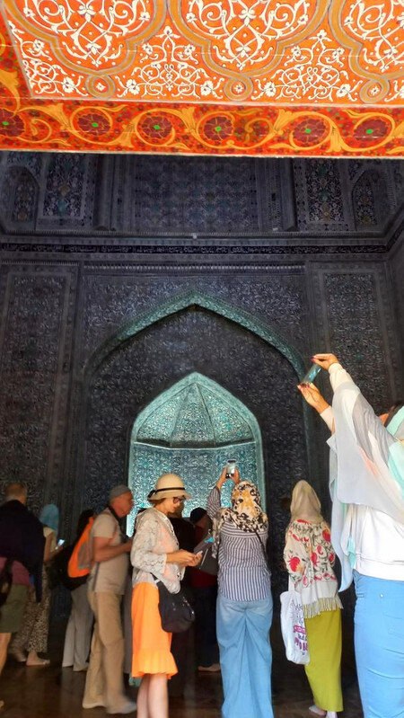Мавзолей Ходжи Накшбанди -Я поведу тебя в музей Я повезу вас в мавзолей, - торжественно объявил в автобусе Шерзод. И торопливо добавил водителю: - Трогай! А что делать? Куда с подводной лодки денешься - экскурсия с романтичным названием «Загородные замки(?) Бухары» была оплачена при покупке тура. Сегодня седьмой день поездки, и что-то мы уже подустали от мавзолеев. Тем более, что сегодняшний день был очень насыщенным. Он начался еще в крепости «Арк» несколько постов назад, и читатель уже, наверно, и забыл о бухарской крепости, а день еще не кончился. Итак, мы недалеко от Бухары в мавзолее Ходжи Бахауддина Накшбанди. Накшбанди (в переводе - чеканщик по своему ремеслу) является духовным покровителем Бухары. Он основал суфийский орден накшбандия (чеканщики). Свою философию строил на принципе: "В сердце - Аллах, а в руках - труд". Особенностью его учения был отказ от нищенства: каждый накшбанд должен знать минимум два ремесла и уметь прокормить не только себя, но и других. Основной духовной практикой был "тихий зикр", то есть, нечто подобное медитации, совершаемой в определённой позе и с определённым ритмом вдохов, задержек дыхания и выдыхов (дервиши со своим мистическим танцем-кружением – тоже суфии только другого течения). Накшбанди в Бухаре считается вторым почитаемым святым после пророка Мухаммеда. С молитвами к нему обращаются и за удачей в делах, и за помощью попавшим в беду, и за защитой от порчи и болезни. И каждый обратившийся получает помощь у этого святого. По крайней мере, так говорят верующие. Главная идея суфизма - «уединение в толпе»: духовная сосредоточенность при активном участии в общественной жизни. – Чем суфизм отличается от «официального ислама»? – Суфизм – это «высший пилотаж» нашей духовности, когда мы настолько приблизились к Всевышнему, что ни на что в этом мире уже не обращаем внимания. Но в исламе монашество запрещено, и даже суфий будет ходить на работу, - например, объясняет имам казанской мечети «Гаиля» Рустам хазрат Хайруллин. Читаю сейчас о суфиях - очень интересно, но много непонятного, много вопросов возникает. С каким удовольствием теперь я бы переслушала рассказ Шерзода в мавзолее и вопросов назадавала. *** По аллее между высоких стен ханского некрополя идем в небольшой дворик, где и стоит мавзолей святого: Стены окружены красивым айваном с резными деревянными колоннами: Во дворике есть небольшой хауз и маленький чартак - сооружение с куполом на четырех арках. Отсюда производные - "чердак, чертог". Внутри чартака обычно стоял сосуд с водой, чтобы путники могли утолить жажду: Территория мавзолея большая и тенистая. Здесь две действующих мечети: большой хауз, за ним виднеется купол необычных очертаний. Это - ханака, временное пристанище для странствующих суфий с кельями по периметру и свободной площадкой в центре, где странствующие суфийские философы и мудрецы предавались размышлениям о жизни: Направляемся на выход, еще не осознав, где мы побывали: