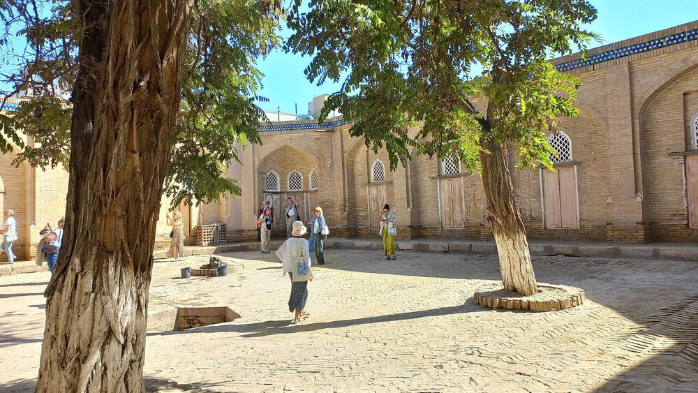 Ляби-хауз Объекты биеннале расположены вдоль берега канала Шахруд. Большая его часть сейчас проходит под землей, выходя наружу в отдельных местах. Мы его пересекали в парке саманидов: и здесь, где находится следующий исторический ансамбль Ляби Хауз, один из уютнейших уголков старой Бухары. Переводится – У хауза. А снабжает этот хауз водой канал Шахруд. Шахруд переводится, как главный канал, канал шаха. Канал прорыт от реки Зеравшан в нескольких километрах от Бухары до шахристана (города внутри стены). Под стеной канал проходил через решетку, защищавшую город от проникновения врагов. На территории шахристана от Шахруда отходило множество арыков, которые снабжали водой около 80 хаузов - водоемов с проточной питьевой водой. Вся древняя Бухара была пронизана сетью арыков и хаузов. Правда, так было со времен древности только до 1920 г, пока Фрунзе не отбомбил Бухару. После этого древняя система водоснабжения города была нарушена, постоянное обновление воды прекратилось, а хаузы стали рассадниками всевозможных инфекций. В целях борьбы с инфекциями (помните, рассказывала о метровых червях, поселявшихся в человеке) многие хаузы были осушены и засыпаны, а город получил современную систему водоснабжения. Этот же хауз, к которому мы подошли, всё же сохранился до наших дней, ибо не было бы счастья, да несчастье помогло. В советские годы его осушили и использовали как небольшую спортивную арену (типа нашего «спартаковца»). Но потом произошёл пожар в соседнем магазине, и воды в ближайшем арыке не хватило для его тушения – магазин сгорел дотла. После этого решено было вновь наполнить хауз водой и использовать как пожарный водоём. Комплекс Ляби-Хауз - это строения XVI-XVII веков вокруг хауза и сам хауз. А так всё это было создано благодаря усилиям визиря Надира Диван-беги, то и хауз называется Диван-беги. Диван на персидском языке означает реестр, дом с документами и титул «заведующего» этим домом с документами или по-современному, по-нашему – министр. Медресе Диван-беги построено в 1623 году. Министр строил здание как свой караван-сарай в надежде получать потом с него прибыль (средневековой коррупцией пахнуло), но что-то пошло не так, и хан повелел Дивану открыть в нем медресе. Вместо ожидаемой прибыли Диван-беги просто нежданно-негаданно обрел славу благодетеля. Очень красивое, но злополучное для министра медресе Диван-беги: Точно напротив медресе на другой стороне хауза стоит ханака Диван-беги, построенная чуть раньше – в 1620 году, одновременно с хаузом. Ханака - пристанище для суфиев, странников-проповедников несколько мистического течения ислама. Мы уже помним, что противостояние фасадов зданий, находящихся на одной оси, часто встречается в восточной архитектуре и называется кош. Через дорогу от всего этого находится медресе Кукельдаш – самое старое из строений Ляби-Хауза (1569 год) и самое большое медресе в регионе. Справа на фото виден его кусочек (как-то я больше на хауз внимание обратила): Вот этот остов засохшего персика датируется 1477 годом: Между хаузом и медресе Диван-беги – памятник самому известному персонажу фольклора мусульманского Востока – Ходже Насреддину с затертыми, естественно, разными частями его тела и ишака: Однажды в этом хаузе тонул один чиновник, барахтаясь у самого берега. Народ стоял на берегу и кричал: -Дай руку! Дай руку! Мы