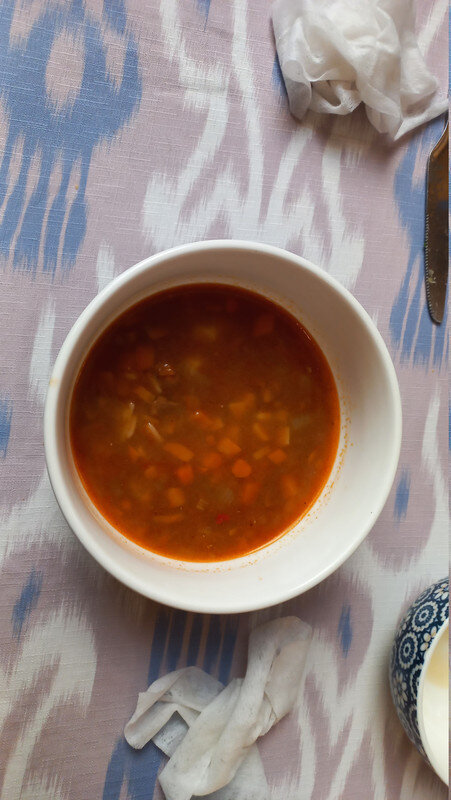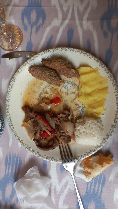 Прощание с Бухарой Из загородной резиденции нас привезли на поздний обед в районе Ляби-Хауз в ресторан под открытым небом. Опять всё сытно и вкусно: шурпа, манты, зеленый чай со штруделем и мороженое: Заехали ненадолго в отель и отправились гулять по вечерней Бухаре. Субботний вечер. Весь исторический центр - практически сплошная пешеходная зона. Сумерки превращаются в ласковый южный вечер, теплый, томный. Много гуляющих - это и туристы, и местные. Среди местных много пожилых женщин. По большей части они сопровождают свою дочь или невестку с внуками, но есть и просто пожилые пары. И, конечно, много молодежи. Торговля допоздна на каждом шагу. Но надо отдать должное узбекам - они не навязывают товар, не завлекают. В разных местах звучит музыка, где-то танцуют. Садимся на открытом подиуме приглянувшегося мне вчера кафе между задней стеной медресе Мири Араб и торгового центра "Купол ювелиров". Заказываем красное сухое вино местного производства: Всё, как я люблю: сидеть среди древних стен, бездумно попивать по глоточку вино, глядя на проходящую мимо разноголосую толпу. Погружаться в мыслях в прошлое этого места и возвращаться в реальность. Рая начинает пританцовывать за столом под восточную мелодию: Повезло мне с попутчицей. В своем Саратове Рая читает меня здесь с подругами: -Рая, спасибо тебе за наши дружные, веселые вечера! Неожиданно город погружается в темноту. Что-то с электричеством. Паники нет. Даже интересно - наверно, так выглядели эти стены ночью в средние века: Минут через десять появился свет, заиграла музыка: Пошли дальше, в сторону Ляби-хауза. Народа на улице еще больше: Облюбовали другое заведение: и вечер опять получился душевным. Из всей поездки больше всего на душу легла Бухара. Ташкент было интересно увидеть, и вечера были в нем вкусные и яркие. Но в целом, Ташкент остался в памяти фоном, на котором сверкали яркие звезды: Самарканд, Бухара, Хива. И самая яркая звездочка из них - Бухара. Самарканд тоже очень понравился, удивил, восхитил своей древностью. Но его древность - музейная, что ли: во-первых, по входному билету, во-вторых, там, в древности его, ты не живешь, а просто смотришь, ну и разве что, стены можешь потрогать руками. А в Бухаре мы оказались в древнем городе - не музейном, а настоящем. И этот город жил, пел, танцевал, поил, кормил, торговал. Почти все туристические объекты находились в пешей доступности. По дороге в отель впитывали в себя напоследок виды, запахи, звуки полюбившейся Бухары: