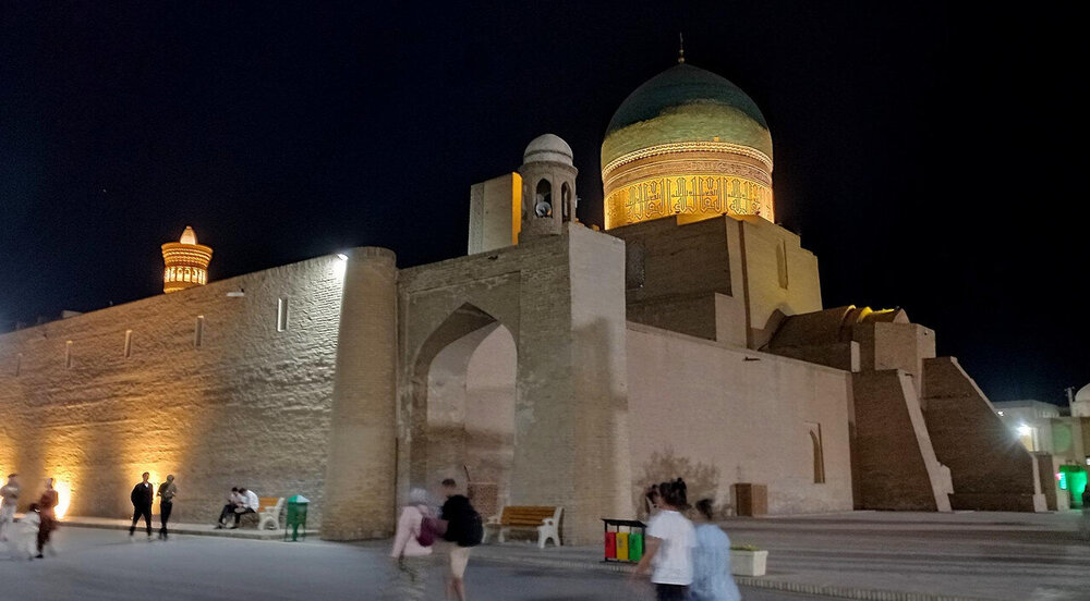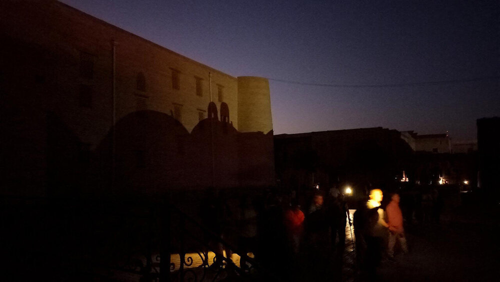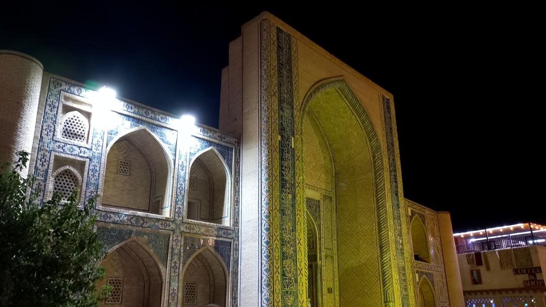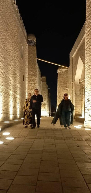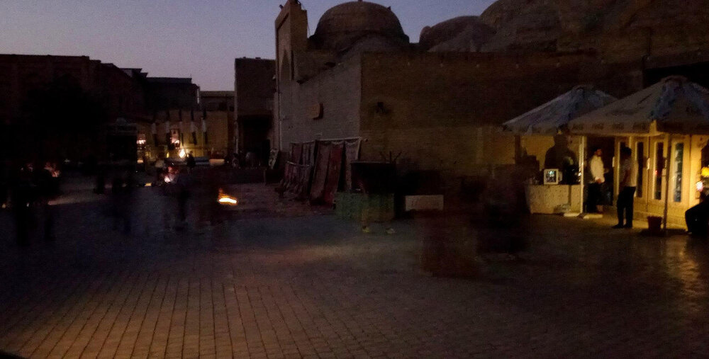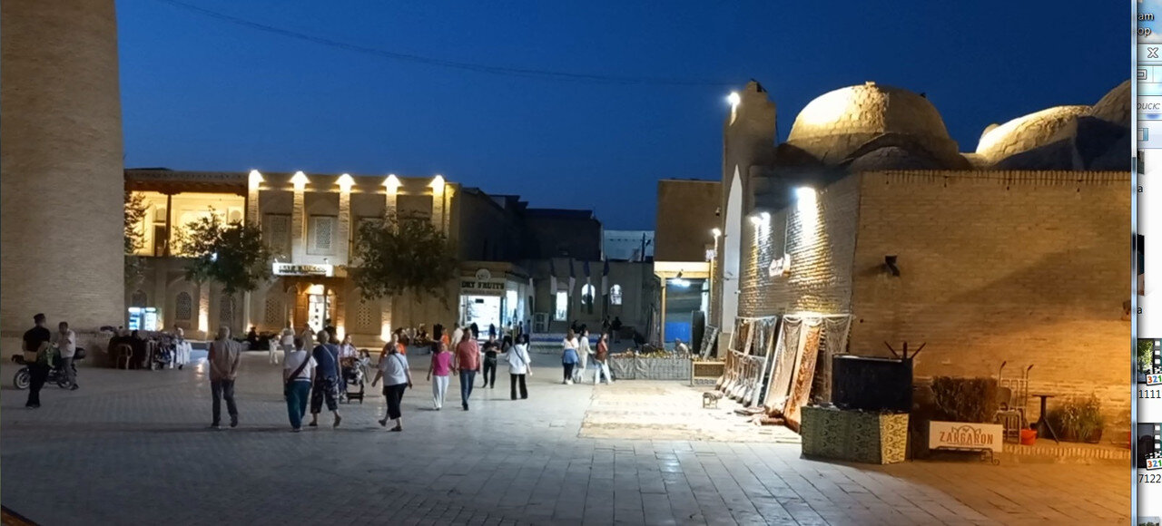 Прощание с Бухарой Из загородной резиденции нас привезли на поздний обед в районе Ляби-Хауз в ресторан под открытым небом. Опять всё сытно и вкусно: шурпа, манты, зеленый чай со штруделем и мороженое: Заехали ненадолго в отель и отправились гулять по вечерней Бухаре. Субботний вечер. Весь исторический центр - практически сплошная пешеходная зона. Сумерки превращаются в ласковый южный вечер, теплый, томный. Много гуляющих - это и туристы, и местные. Среди местных много пожилых женщин. По большей части они сопровождают свою дочь или невестку с внуками, но есть и просто пожилые пары. И, конечно, много молодежи. Торговля допоздна на каждом шагу. Но надо отдать должное узбекам - они не навязывают товар, не завлекают. В разных местах звучит музыка, где-то танцуют. Садимся на открытом подиуме приглянувшегося мне вчера кафе между задней стеной медресе Мири Араб и торгового центра "Купол ювелиров". Заказываем красное сухое вино местного производства: Всё, как я люблю: сидеть среди древних стен, бездумно попивать по глоточку вино, глядя на проходящую мимо разноголосую толпу. Погружаться в мыслях в прошлое этого места и возвращаться в реальность. Рая начинает пританцовывать за столом под восточную мелодию: Повезло мне с попутчицей. В своем Саратове Рая читает меня здесь с подругами: -Рая, спасибо тебе за наши дружные, веселые вечера! Неожиданно город погружается в темноту. Что-то с электричеством. Паники нет. Даже интересно - наверно, так выглядели эти стены ночью в средние века: Минут через десять появился свет, заиграла музыка: Пошли дальше, в сторону Ляби-хауза. Народа на улице еще больше: Облюбовали другое заведение: и вечер опять получился душевным. Из всей поездки больше всего на душу легла Бухара. Ташкент было интересно увидеть, и вечера были в нем вкусные и яркие. Но в целом, Ташкент остался в памяти фоном, на котором сверкали яркие звезды: Самарканд, Бухара, Хива. И самая яркая звездочка из них - Бухара. Самарканд тоже очень понравился, удивил, восхитил своей древностью. Но его древность - музейная, что ли: во-первых, по входному билету, во-вторых, там, в древности его, ты не живешь, а просто смотришь, ну и разве что, стены можешь потрогать руками. А в Бухаре мы оказались в древнем городе - не музейном, а настоящем. И этот город жил, пел, танцевал, поил, кормил, торговал. Почти все туристические объекты находились в пешей доступности. По дороге в отель впитывали в себя напоследок виды, запахи, звуки полюбившейся Бухары: