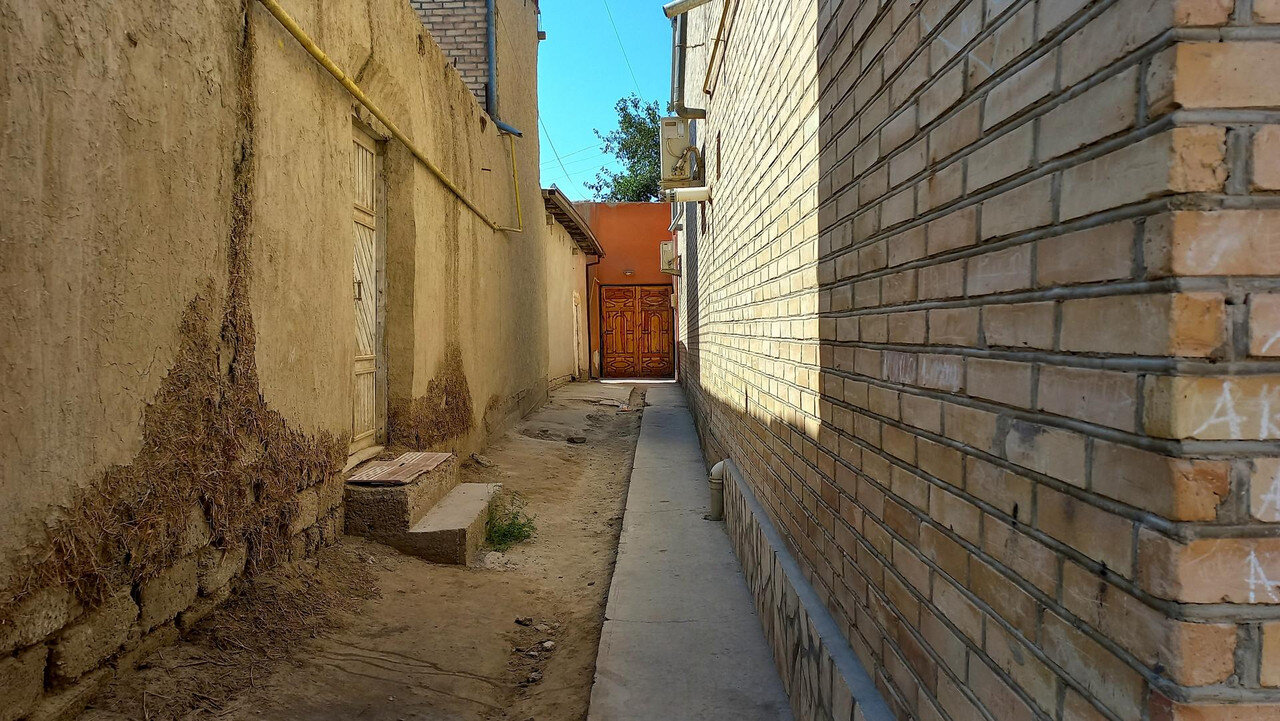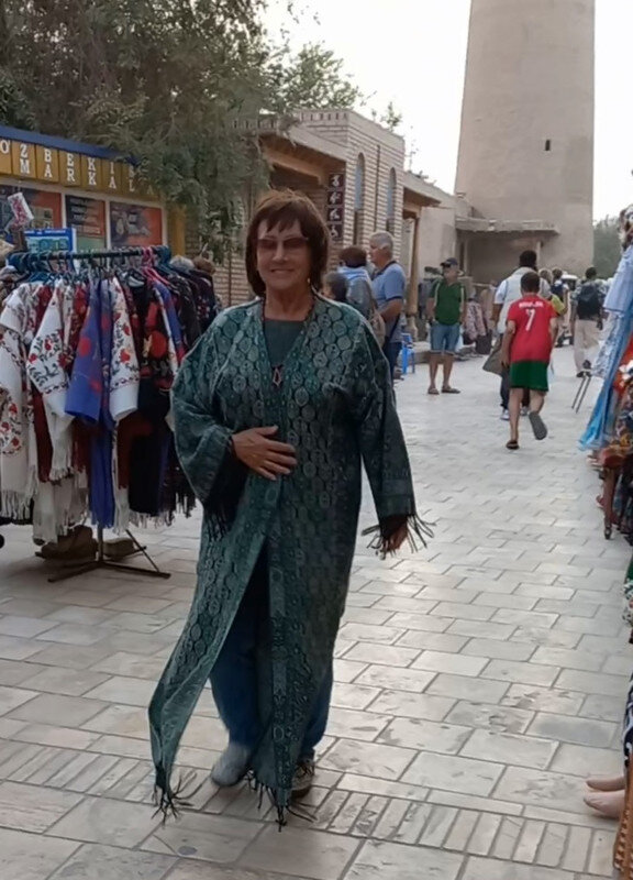 Хива вечерняя Это уже другое медресе: А это следующее: Медресе в Хиве на каждом шагу. Это несомненно похвально, но вспомнились "12 стульев": -В уездном городе N было так много парикмахерских заведений и бюро похоронных процессий, что казалось, жители города рождаются лишь затем, чтобы побриться, остричься, освежить голову вежеталем и сразу же умереть. Наконец нам удалось вырваться из рыночных рядов. Мы все время сворачивали направо от центральной улицы и бродили там по каким-то захоронениям, караван-сараям, дворикам со скульптурой и столиками. И всё это было увешано халатами и палантинами, заложено тюбетейками и меховыми шапками. А стоило свернуть налево, как мы оказались в тишине и древности. И древность здесь, как кусок черного хлеба с солью после надоевших сладостей: Перекресток двух строгих улиц: И халат на мне вписался в стены, а когда еще полы халата развеваются на все четыре стороны, то вирус - вирусом, но танцы - танцами Вышли мы потом через наши, задние, восточные ворота и побрели по длинному бульвару в отель. Завтра нам Шерзод на экскурсии расскажет, где мы были, и что видели.