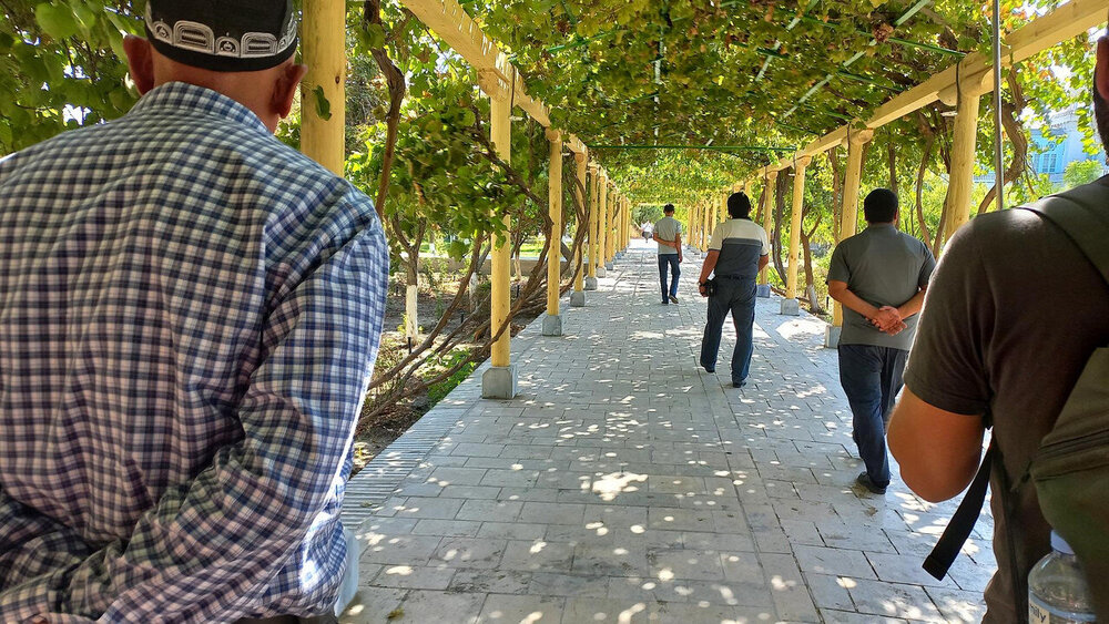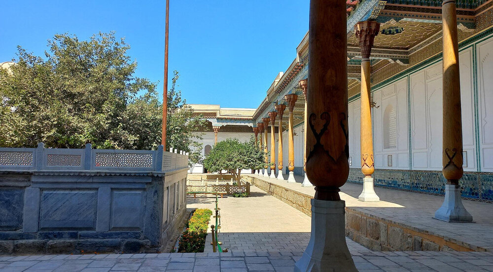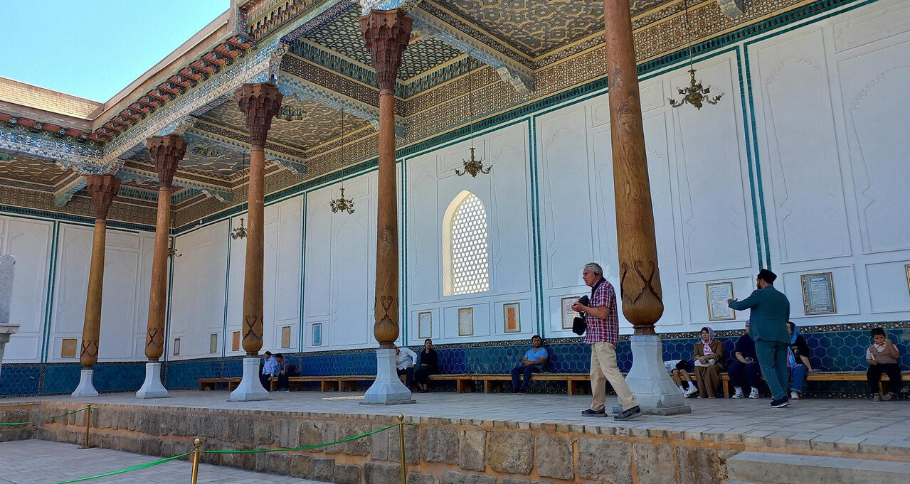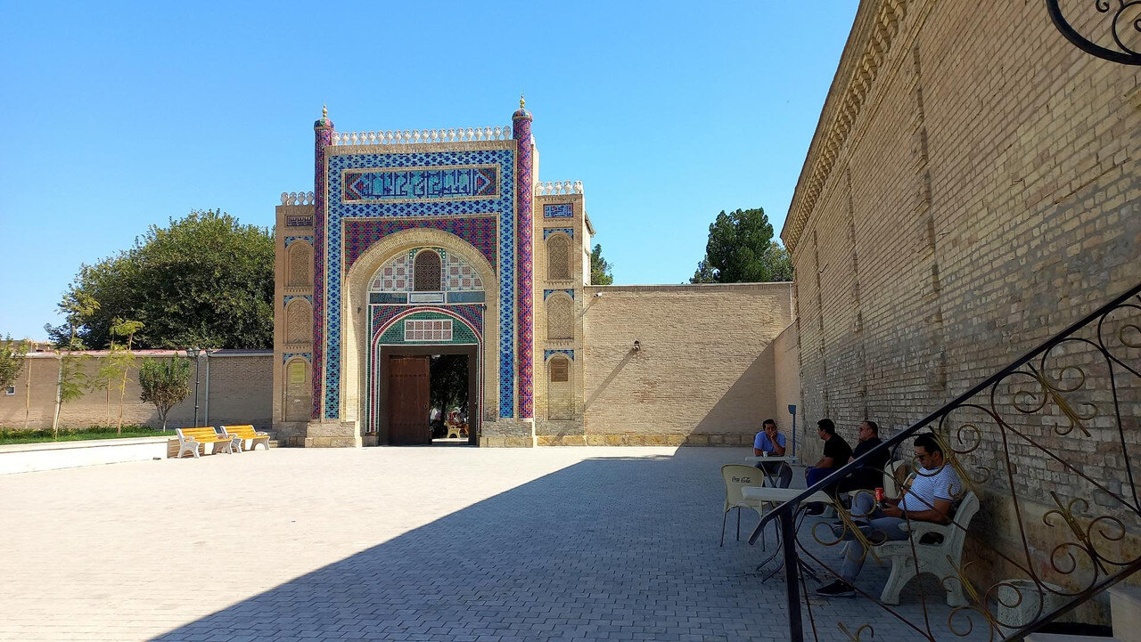 Мавзолей Ходжи Накшбанди -Я поведу тебя в музей Я повезу вас в мавзолей, - торжественно объявил в автобусе Шерзод. И торопливо добавил водителю: - Трогай! А что делать? Куда с подводной лодки денешься - экскурсия с романтичным названием «Загородные замки(?) Бухары» была оплачена при покупке тура. Сегодня седьмой день поездки, и что-то мы уже подустали от мавзолеев. Тем более, что сегодняшний день был очень насыщенным. Он начался еще в крепости «Арк» несколько постов назад, и читатель уже, наверно, и забыл о бухарской крепости, а день еще не кончился. Итак, мы недалеко от Бухары в мавзолее Ходжи Бахауддина Накшбанди. Накшбанди (в переводе - чеканщик по своему ремеслу) является духовным покровителем Бухары. Он основал суфийский орден накшбандия (чеканщики). Свою философию строил на принципе: "В сердце - Аллах, а в руках - труд". Особенностью его учения был отказ от нищенства: каждый накшбанд должен знать минимум два ремесла и уметь прокормить не только себя, но и других. Основной духовной практикой был "тихий зикр", то есть, нечто подобное медитации, совершаемой в определённой позе и с определённым ритмом вдохов, задержек дыхания и выдыхов (дервиши со своим мистическим танцем-кружением – тоже суфии только другого течения). Накшбанди в Бухаре считается вторым почитаемым святым после пророка Мухаммеда. С молитвами к нему обращаются и за удачей в делах, и за помощью попавшим в беду, и за защитой от порчи и болезни. И каждый обратившийся получает помощь у этого святого. По крайней мере, так говорят верующие. Главная идея суфизма - «уединение в толпе»: духовная сосредоточенность при активном участии в общественной жизни. – Чем суфизм отличается от «официального ислама»? – Суфизм – это «высший пилотаж» нашей духовности, когда мы настолько приблизились к Всевышнему, что ни на что в этом мире уже не обращаем внимания. Но в исламе монашество запрещено, и даже суфий будет ходить на работу, - например, объясняет имам казанской мечети «Гаиля» Рустам хазрат Хайруллин. Читаю сейчас о суфиях - очень интересно, но много непонятного, много вопросов возникает. С каким удовольствием теперь я бы переслушала рассказ Шерзода в мавзолее и вопросов назадавала. *** По аллее между высоких стен ханского некрополя идем в небольшой дворик, где и стоит мавзолей святого: Стены окружены красивым айваном с резными деревянными колоннами: Во дворике есть небольшой хауз и маленький чартак - сооружение с куполом на четырех арках. Отсюда производные - "чердак, чертог". Внутри чартака обычно стоял сосуд с водой, чтобы путники могли утолить жажду: Территория мавзолея большая и тенистая. Здесь две действующих мечети: большой хауз, за ним виднеется купол необычных очертаний. Это - ханака, временное пристанище для странствующих суфий с кельями по периметру и свободной площадкой в центре, где странствующие суфийские философы и мудрецы предавались размышлениям о жизни: Направляемся на выход, еще не осознав, где мы побывали: