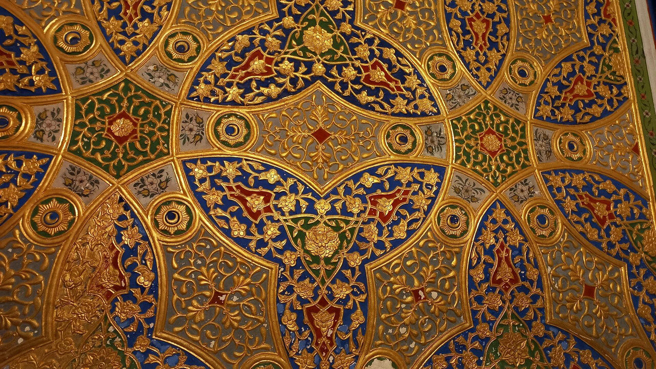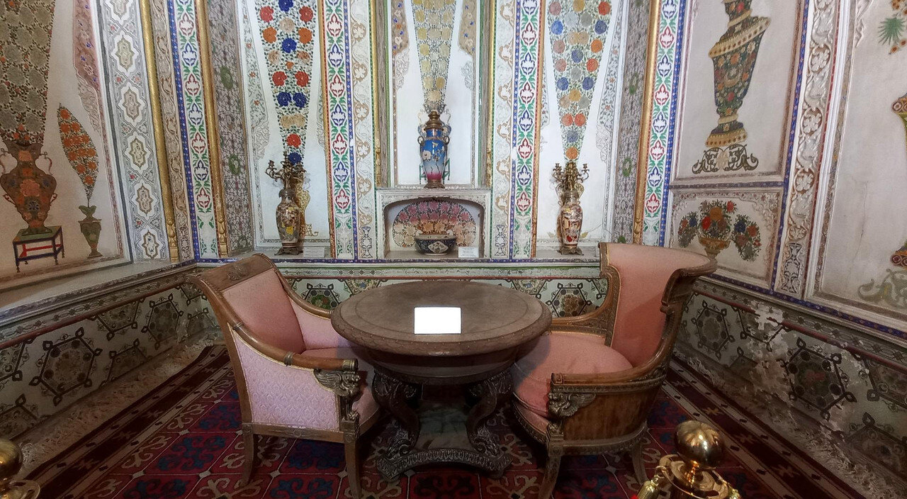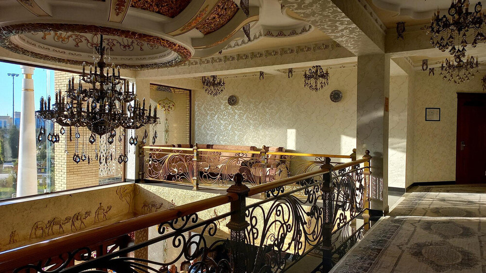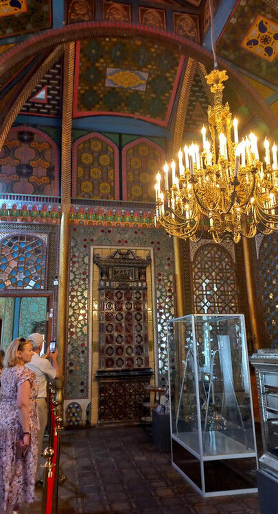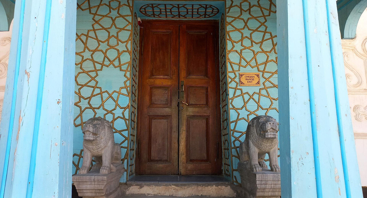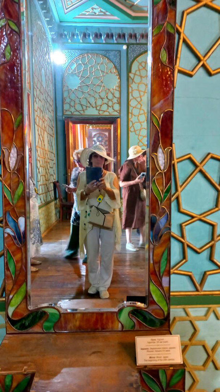 Дворец, подобный звездам и луне Так переводится название летней резиденции бухарских эмиров - Ситораи Мохи Хоса . Находится она теперь уже на окраине Бухары в 6 км от крепости Арк, в которой распологалась главная эмирская резиденция. Каждый уважающий себя правитель должен иметь загородный дворец. Первую летнюю резиденцию на этом месте построил еще в 1822 г очень уважающий себя эмир Насрула, ну, тот, что головы английским шпионам поотрубал, потому что нечего было к нему заходить без подарка. К нашему приезду от Насрулы уже ничего не осталось, а то, что мы увидели, это перестроенная в 1912-1918 годы резиденция для Сеида Алим-хана. Место для нее (еще при Насруле, естественно) выбрали интересным образом: разложили в разных местах, которые приглянулись, туши убитых баранов. То место, где баран протух в последнюю очередь, и выбрали. Как думаете, почему? Верно. Потому что в этом месте – правильная роза ветров. И все в такой розе будут лучше сохраняться. Проходим через ворота внутрь: При эмире здесь был зверинец. Сейчас от зверинца остались потомки эмировых павлинов, которые и вели себя по-эмировски важно. Их здесь несколько штук с вожаком по имени Паша, который даже загоняет павлинов обратно в ворота, если они выходят за пределы дворца. Возможно, павлин, топтавшийся на скамейке в попытках угнездится на ней, как на троне, как раз и есть Паша. На нас не обращал абсолютно никакого внимания: Три года обучения в Петербурге для эмира не прошли даром. Европейская архитектура легла ему на душу и откликнулась в реконструкции резиденции. Сплав Востока и Европы и есть изюминка дворца. Дворец имеет П-образную форму. Одна сторона оформлена айваном с изящными деревянными колоннами: Выход на противоположной стороне охраняют львы, опять же навеянные петербургским Египтом. Но местный мастер, который высекал скульптуры из камня, никогда львов не видел. Поэтому высеклось нечто странное, химеры какие-то: Дворец был не жилой, а церемониальный. Приемы проводились в белом зале: Его внутреннее убранство создал усто Ширин Мурадов с двадцатью пятью учениками. По преданию в полнолуние мастер взглянул на луну и увидел там будущие украшения Белого зала. Ширину Мурадову на территории установлен памятник. В советское время он стал почётным членом Академии наук Узбекской ССР и выдающимся художником, получившим признание за свой вклад в искусство Узбекской ССР в 1943 году. В 1948 году он также получил Сталинскую премию. Люстра, висящая в зале, изготовлена в Варшаве. Зал украшают зеркала. Их обрамляет резьба по ганчу, очень популярная на Востоке. Мы повсюду ее видели. Ганч – это природная, а чаще искусственная смесь гипса и лёсса. Вдоль стен стоят многочисленные китайские и японские фарфоровые вазы. В зал проход запрещен. При входе в него комната ожидания приема. Она оформлена в узбекском стиле, а мебель изготовлена в России в европейском стиле: По анфиладе комнат идем дальше. Следующий зал - шахматный. Эмир хорошо играл в шахматы: Комната мирзы, или секретаря. Оформлена в спокойном голубом свете, чтобы ничто не отвлекало от написания документов, которые потом складывались в этот шкафчик: Здесь же - зеркало.
