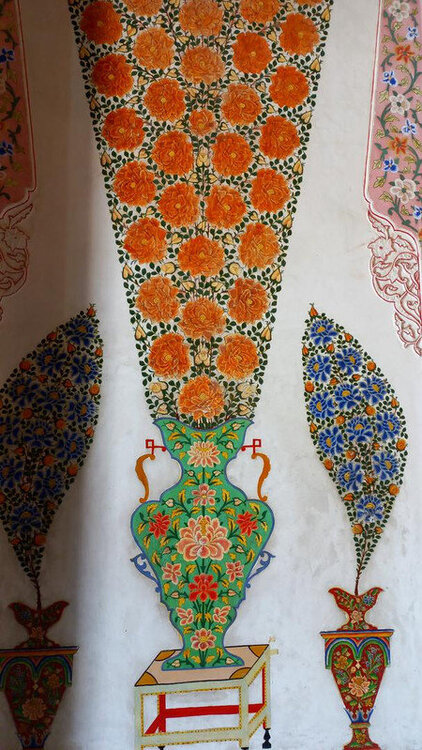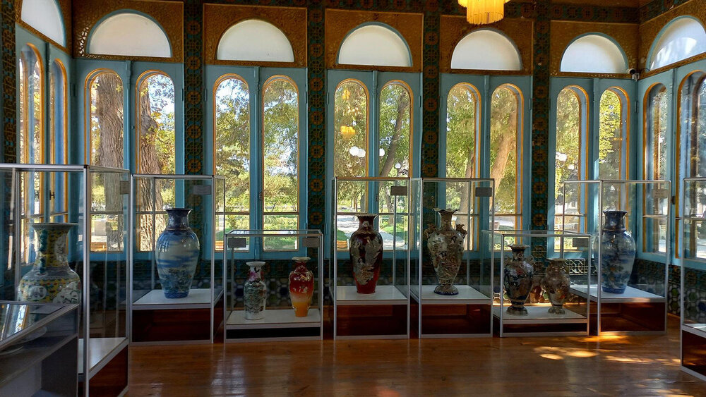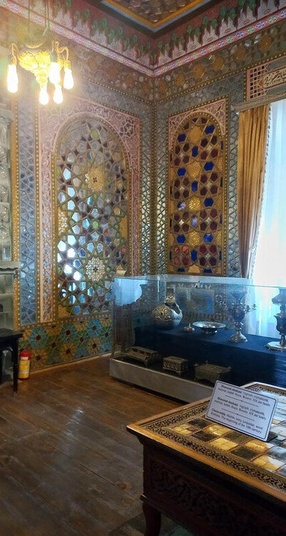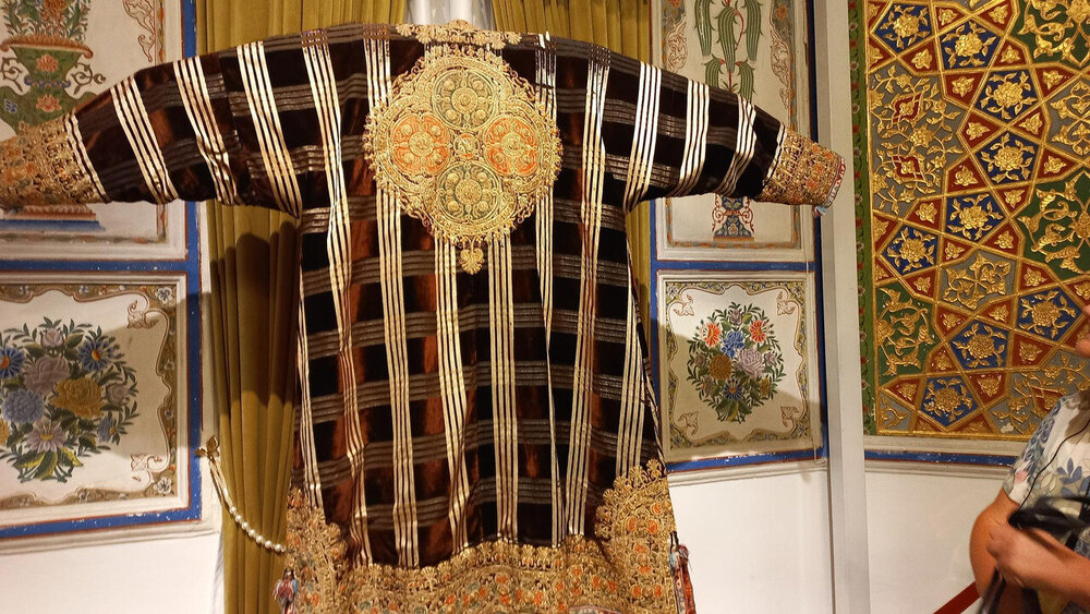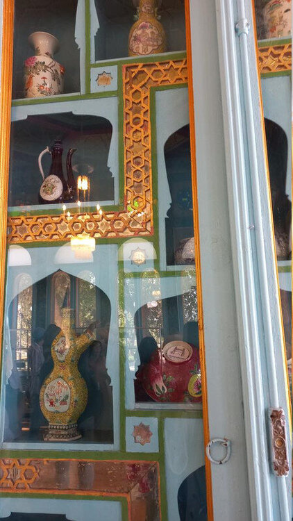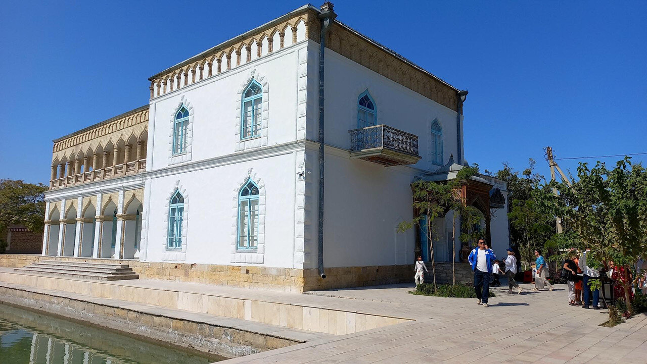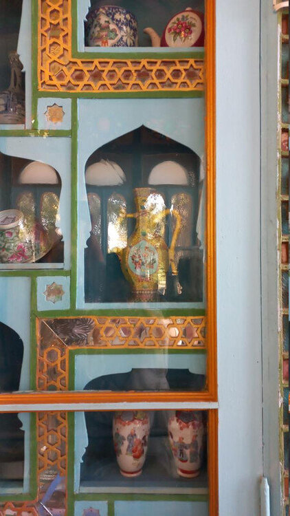 После помещения мирзы в торце крыла - веранда-чайхана. Если в обеденном зале все сидели чопорно, по-европейски за столом, то здесь гости могли расслабиться и пить чай по-восточному на полу, на дастарханах. Сейчас в доме музей и на веранде выставлена китайские и японские вазы, скорее всего, из коллекции эмира, который вазы очень любил. Когда в сентября 1920 эмир отправился в бега, вместе с ним из резиденции вышел караван из ста верблюдов, навьюченный сокровищами эмира (запасной вариант с эмиграцией эмир начал готовить еще с 1917 г). Хрупкие вазы пришлось оставить. Про несметные сокровища эмира есть разные легенды. Основная: караваном с сокровищами руководил соратник эмира полковник Каллапуш. В дороге охранники каравана решили завладеть сокровищами, но Каллапуш со своим геройским отрядом всех победили-перебили, сокровища спрятали в пещере предгорий Памира, завалив вход камнями, и вернулись к эмиру, временно остановившемуся на востоке Бухарского эмирата. Там верный эмиру Каллапуш ночью перебил уже свой отряд и пришел к эмиру с кинжалом, на котором был выгравирован путь к пещере с сокровищами. Эмир радостно приветствовал своего преданного соратника, но больше всего его интересовало, остался ли кто-то в живых из тех, кто видел, где спрятаны сокровища. На что Каллапуш отвечал: -Эту тайну на Земле знают только два человека: Вы и я. -Тогда это не тайна - ответил эмир, и той же ночью дворцовый палач убил Каллапуша. А через два дня эмир бухарский отправился в путь и пересёк границу Афганистана. Больше эти сокровища, настоящие или вымышленные, никто не видел, в т.ч. и эмир, но надежда найти их до сих пор в народе жива. Еще в чайхане несколько шкафов с фарфором: Выходим из дворца через тот выход, который охраняют химеры-львы. Неподалеку стоит восьмигранный флигель, построенный специально для приезда Николая второго (но он так и не приехал) фото из инт-та: Внутри в центре здания восьмигранный зал с двойными стенами для переговоров с Николаем, чтобы никто с улицы не мог подслушать из разговор. В зале богатые интерьеры: Сейчас здесь музей одежды, расшитой золотом: Стало интересно, а в чем же эмиры в жару и в кругу семьи ходили? Не в этих же расшитых золотом тяжелых халатах? Что под халатом-то раньше носили? Шерзод сказал, что об этом история умалчивает, а вот жены и наложницы купались в хаузе под наблюдением эмира не обнаженными, а в рубахах. Даже перед ним они обнажаться не могли. К этому хаузу и дому-опочивальне мы и проследовали по аллее с перголой, увитой виноградом: Опочивальню эту построил тот же архитектор, что оформлял зал приемов, Ширин Мурадов. Очередная легенда: как водилось у ханов, эмиров и прочих восточных правителей, если зодчий возводил нечто прекрасное, его или ослепляли, или отрубали руки или вообще убивали, чтобы он еще кому-нибудь не возвел такую красоту. Амир-хан убивать не стал, а заточил его где-то во дворце. Но биография заслуженного архитектора Узбекистана об этом умалчивает. В опочивальне на 1 этаже жили 4 жены эмира, на втором этаже мать и 40 наложниц. Еще где-то жили дети.: Рядом - двух-этажная беседка. Эмир наверху пил чай с женами и детьми. Отсюда же он наблюдал за купанием своих женщин в рубахах. Третья легенда: в руке эмира было яблоко. Он бросал его в хауз, и та женщина, которая поймает яблоко, выбиралась эмиром на сегодняшнюю ночь. Чего-то вс