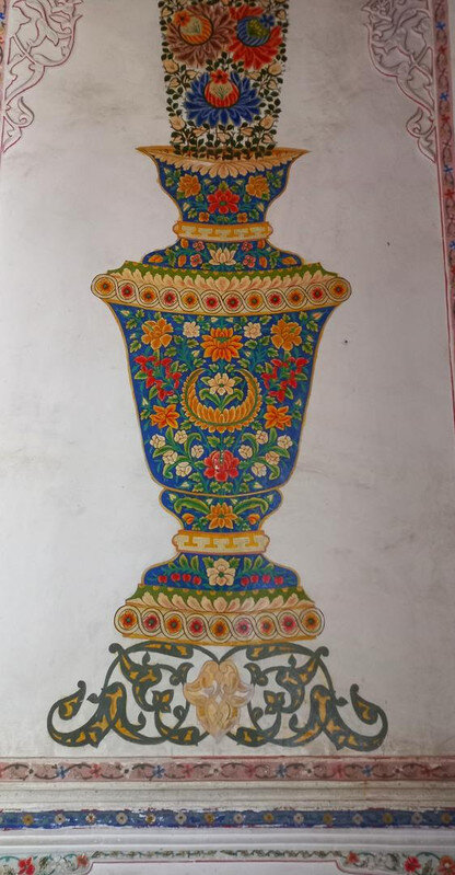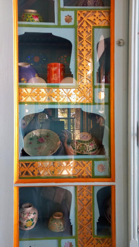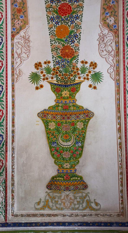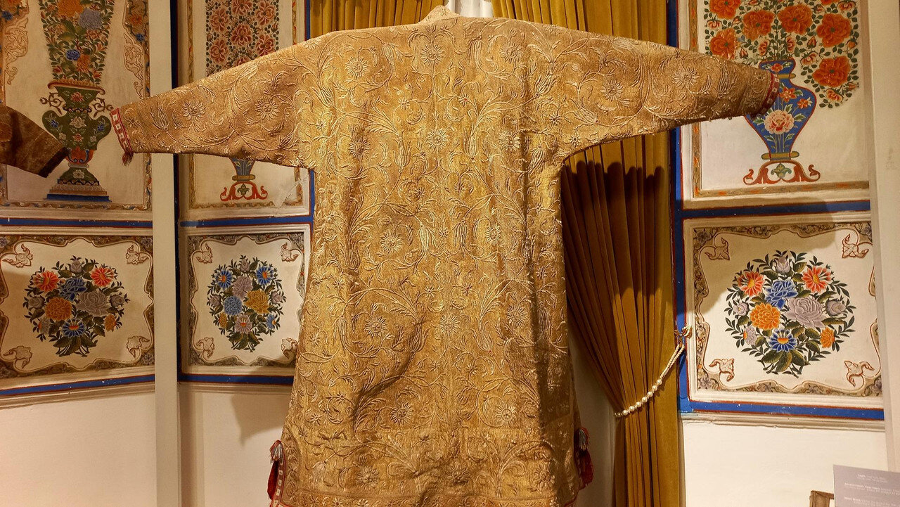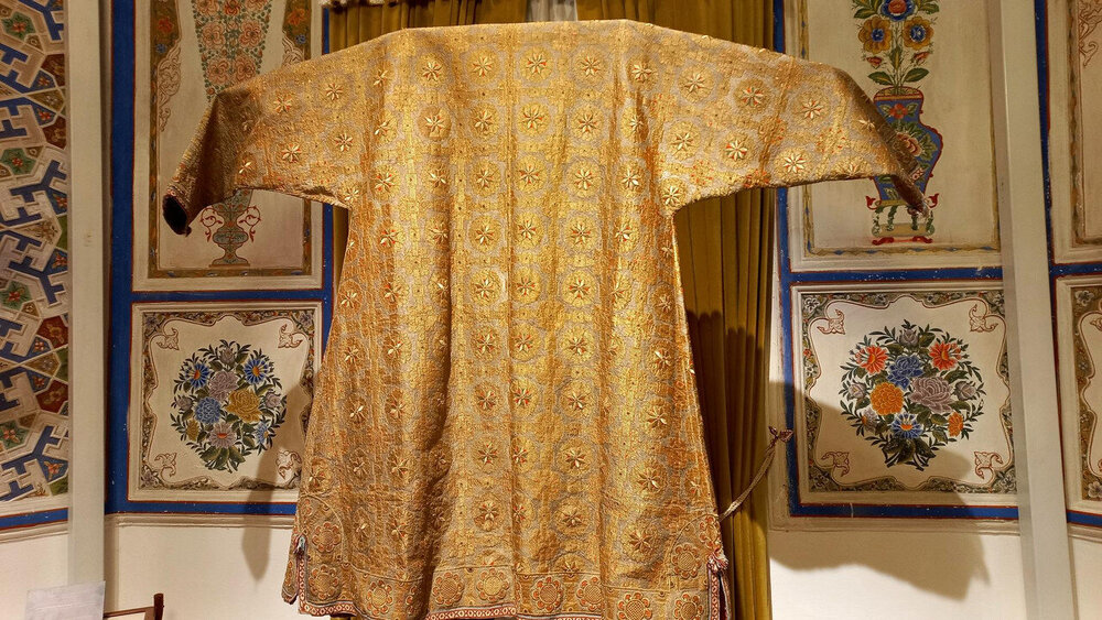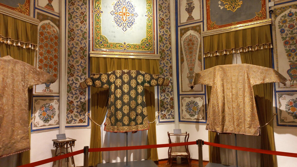 После помещения мирзы в торце крыла - веранда-чайхана. Если в обеденном зале все сидели чопорно, по-европейски за столом, то здесь гости могли расслабиться и пить чай по-восточному на полу, на дастарханах. Сейчас в доме музей и на веранде выставлена китайские и японские вазы, скорее всего, из коллекции эмира, который вазы очень любил. Когда в сентября 1920 эмир отправился в бега, вместе с ним из резиденции вышел караван из ста верблюдов, навьюченный сокровищами эмира (запасной вариант с эмиграцией эмир начал готовить еще с 1917 г). Хрупкие вазы пришлось оставить. Про несметные сокровища эмира есть разные легенды. Основная: караваном с сокровищами руководил соратник эмира полковник Каллапуш. В дороге охранники каравана решили завладеть сокровищами, но Каллапуш со своим геройским отрядом всех победили-перебили, сокровища спрятали в пещере предгорий Памира, завалив вход камнями, и вернулись к эмиру, временно остановившемуся на востоке Бухарского эмирата. Там верный эмиру Каллапуш ночью перебил уже свой отряд и пришел к эмиру с кинжалом, на котором был выгравирован путь к пещере с сокровищами. Эмир радостно приветствовал своего преданного соратника, но больше всего его интересовало, остался ли кто-то в живых из тех, кто видел, где спрятаны сокровища. На что Каллапуш отвечал: -Эту тайну на Земле знают только два человека: Вы и я. -Тогда это не тайна - ответил эмир, и той же ночью дворцовый палач убил Каллапуша. А через два дня эмир бухарский отправился в путь и пересёк границу Афганистана. Больше эти сокровища, настоящие или вымышленные, никто не видел, в т.ч. и эмир, но надежда найти их до сих пор в народе жива. Еще в чайхане несколько шкафов с фарфором: Выходим из дворца через тот выход, который охраняют химеры-львы. Неподалеку стоит восьмигранный флигель, построенный специально для приезда Николая второго (но он так и не приехал) фото из инт-та: Внутри в центре здания восьмигранный зал с двойными стенами для переговоров с Николаем, чтобы никто с улицы не мог подслушать из разговор. В зале богатые интерьеры: Сейчас здесь музей одежды, расшитой золотом: Стало интересно, а в чем же эмиры в жару и в кругу семьи ходили? Не в этих же расшитых золотом тяжелых халатах? Что под халатом-то раньше носили? Шерзод сказал, что об этом история умалчивает, а вот жены и наложницы купались в хаузе под наблюдением эмира не обнаженными, а в рубахах. Даже перед ним они обнажаться не могли. К этому хаузу и дому-опочивальне мы и проследовали по аллее с перголой, увитой виноградом: Опочивальню эту построил тот же архитектор, что оформлял зал приемов, Ширин Мурадов. Очередная легенда: как водилось у ханов, эмиров и прочих восточных правителей, если зодчий возводил нечто прекрасное, его или ослепляли, или отрубали руки или вообще убивали, чтобы он еще кому-нибудь не возвел такую красоту. Амир-хан убивать не стал, а заточил его где-то во дворце. Но биография заслуженного архитектора Узбекистана об этом умалчивает. В опочивальне на 1 этаже жили 4 жены эмира, на втором этаже мать и 40 наложниц. Еще где-то жили дети.: Рядом - двух-этажная беседка. Эмир наверху пил чай с женами и детьми. Отсюда же он наблюдал за купанием своих женщин в рубахах. Третья легенда: в руке эмира было яблоко. Он бросал его в хауз, и та женщина, которая поймает яблоко, выбиралась эмиром на сегодняшнюю ночь. Чего-то вс