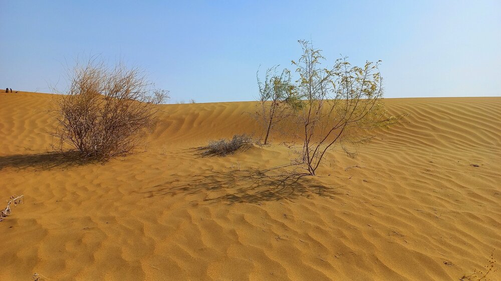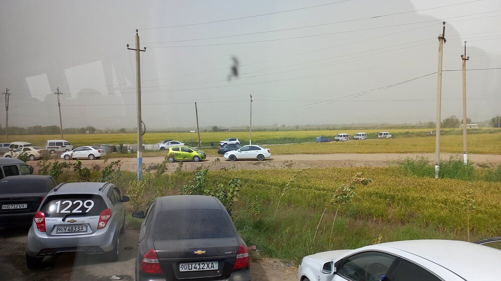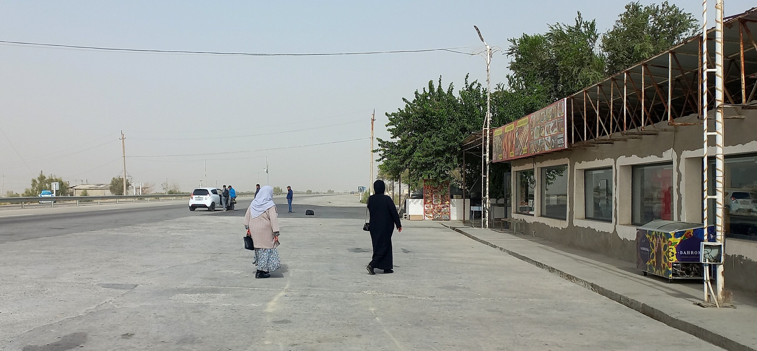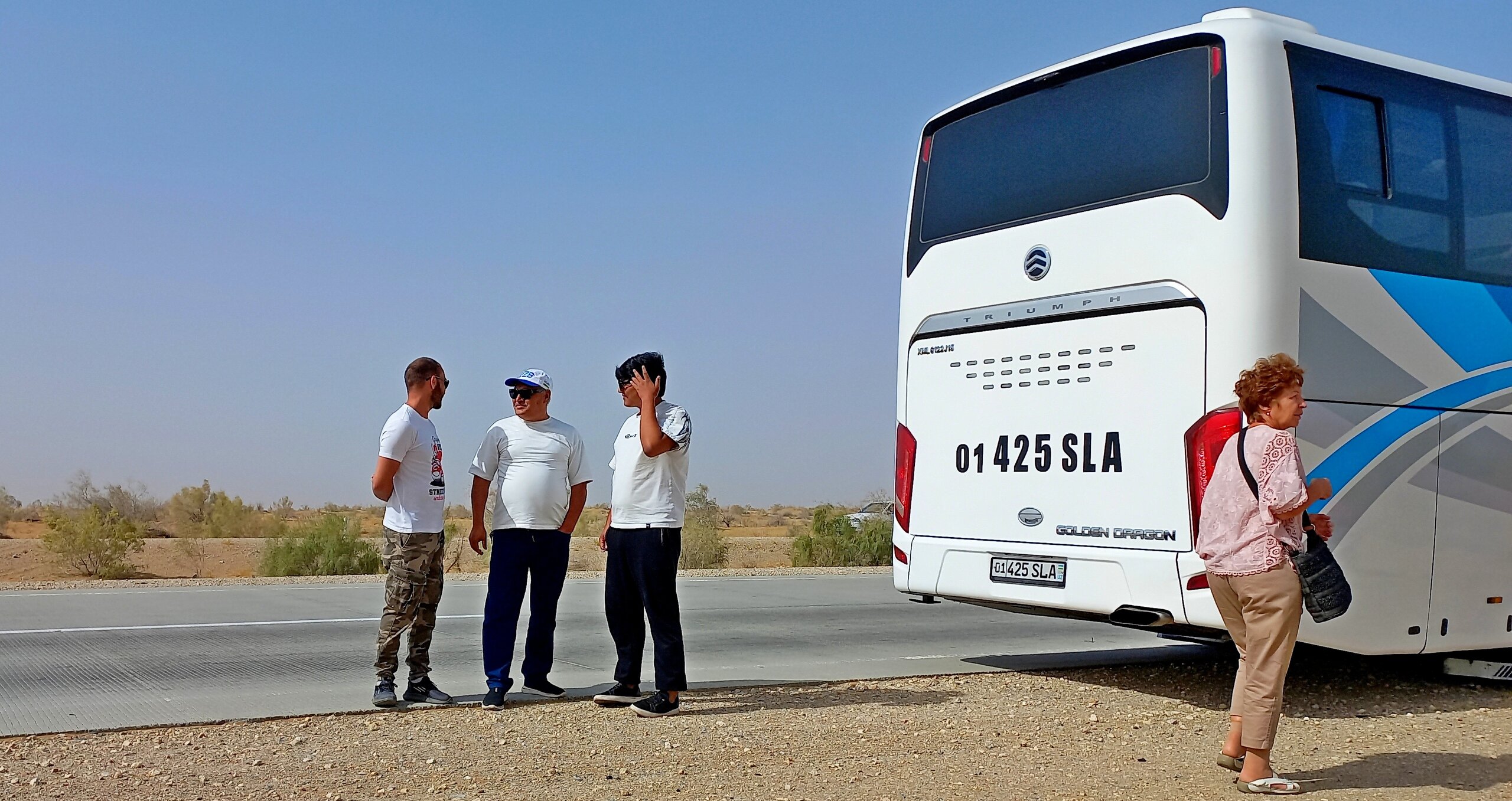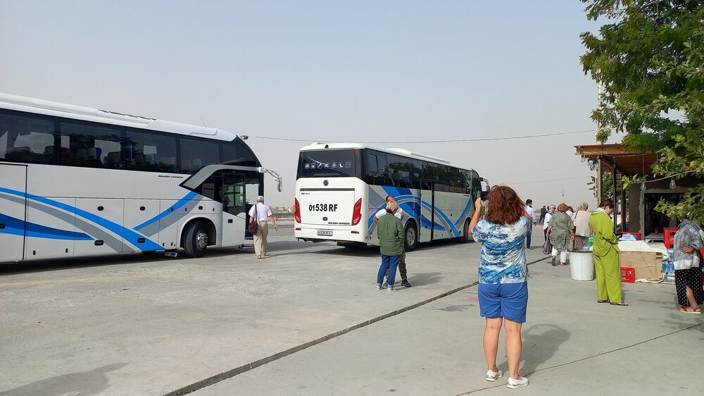 По дороге в Хиву От Бухары до Хивы 450 км. Едем по Кызылкуму. Пустыня расположена между Сыр-Дарьей и Аму-Дарьей в основном на территории Узбекистана, и площадь ее больше Великой Британии вместе со всеми ее островами. Пустыня выглядит скучно: солончаки вперемешку с каменистыми равнинами с саксаулами и песчаной акацией и сухими руслами древних рек. В пустыне могут встретиться барханы, даже высотой до 30 метров. Могут. Но нам такие не встретились. Пейзаж в основном был каменистой равниной, вот,такой: Как я уже раньше писала, при СССР был большой заказ на хлопок. Хлопкоробство вытесняло садоводство и полеводство. Хлопок требовал много воды. Была проведена масштабная ирригация. В результате Сыр-Дарья не доходит до Арала, теряется в пустыне, Аму-Дарья тоже сильно обмелела. Арал высох. Ветер разносит по округе гербициды с его высохшего дна. Местные жители болеют легочными заболеваниями. Сейчас собираются посадить на дне Арала саксауловый лес, чтобы он защитил дно от выветривания. Еще на берегу Арала в советское время была биолаборатория. После распада Союза ее забросили. Пригласили западных специалистов для организации захоронений опасных отходов. Солончаковые почвы для урожайности требуют промывания от соли - землю пашут, заливают водой на некоторое время, а потом полученный рассол сливают (куда-то ). Такую процедуру надо делать ежегодно. В 10 утра - санитарная остановка: Над остановочным комплексом под завывание сильного ветра разносится песня "Учкудук - три колодца". Городок Учкудук со своими тремя колодцами в городском парке где-то в этом районе. В пустыне жарко, но ветер не только сильный, но еще и очень холодный. Каким-то образом пустынный жар и ветреный холод умудряются существовать параллельно. А человек сначала вспотеет от жары, а потом холодный порыв ветра его охладит до простуды. Дали теряются в дымке. Это песчаная буря. Она будет сегодня целый день, даже в Хиве. Песок в лицо вроде не кидает, но мельчайшая пыль висит в воздухе. Я начала чихать. Решила, что это, как у местных, аллергия на аральские пестициды. Следующая остановка - возле бархана. У водителя и Шерзода есть свой заветный бархан, куда они высаживают туристов (с барханами в Кызылкуме - напряженка, их еще поискать надо ). Он, конечно, не 30 метров высотой, но харчами перебирать не приходится. Фотографируй, что дают: Шерзод совещается с водителем и его сыном-помощником для этого перегона. Отец водит автобус очень быстро, но мягко, без рывков. А юный сын - вообще Шумахер. 450 км промчали очень быстро. На бархане продолжила чихать еще сильнее, прямо, вот, от всей души. Едем дальше. Трасса идет вдоль правого берега Аму-дарьи. Пересекли ее рукав: В моем дорожном блокноте записано: проехали поворот на Нукус, Шерзод - о музее. Наверно, этот поворот: В Нукусе недурно было бы побывать. Это - столица Каракалпакии, в которой находится ни много ни мало, а целый "Лувр пустыни". Так называют Государственный музей искусств имени И. В. Савицкого, основавшего музей. Савицкий впервые оказался в Средней Азии во время эвакуации художественного института, в котором учился в Великую отечественную. По состоянию здоровья он был освобожден от службы, вот и эвакуировался. Здесь он участвовал в этнографических и археологических экспедициях и буквально влюбился в Каракалпакстан. Впоследствии он сюда перебрался окон