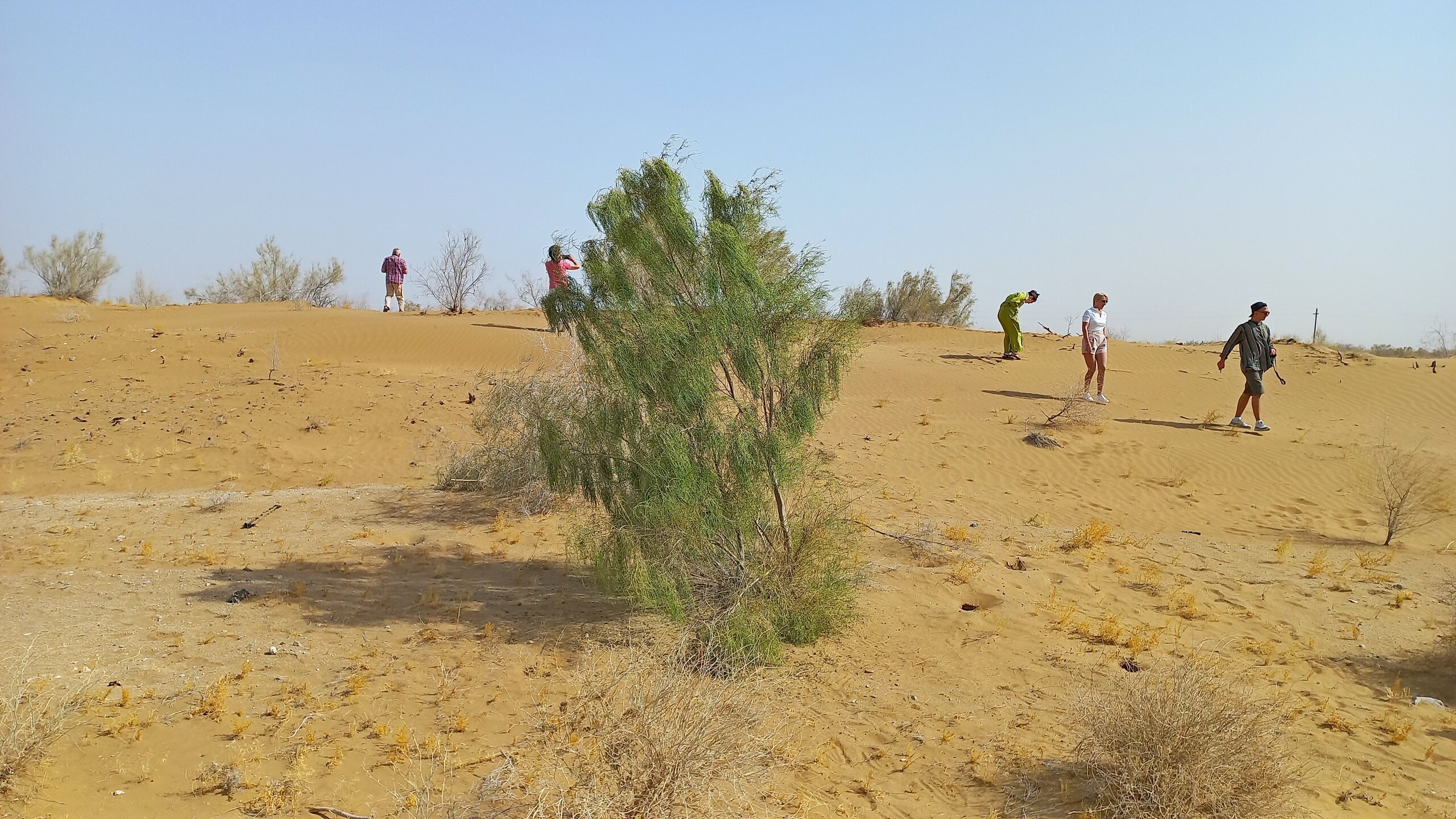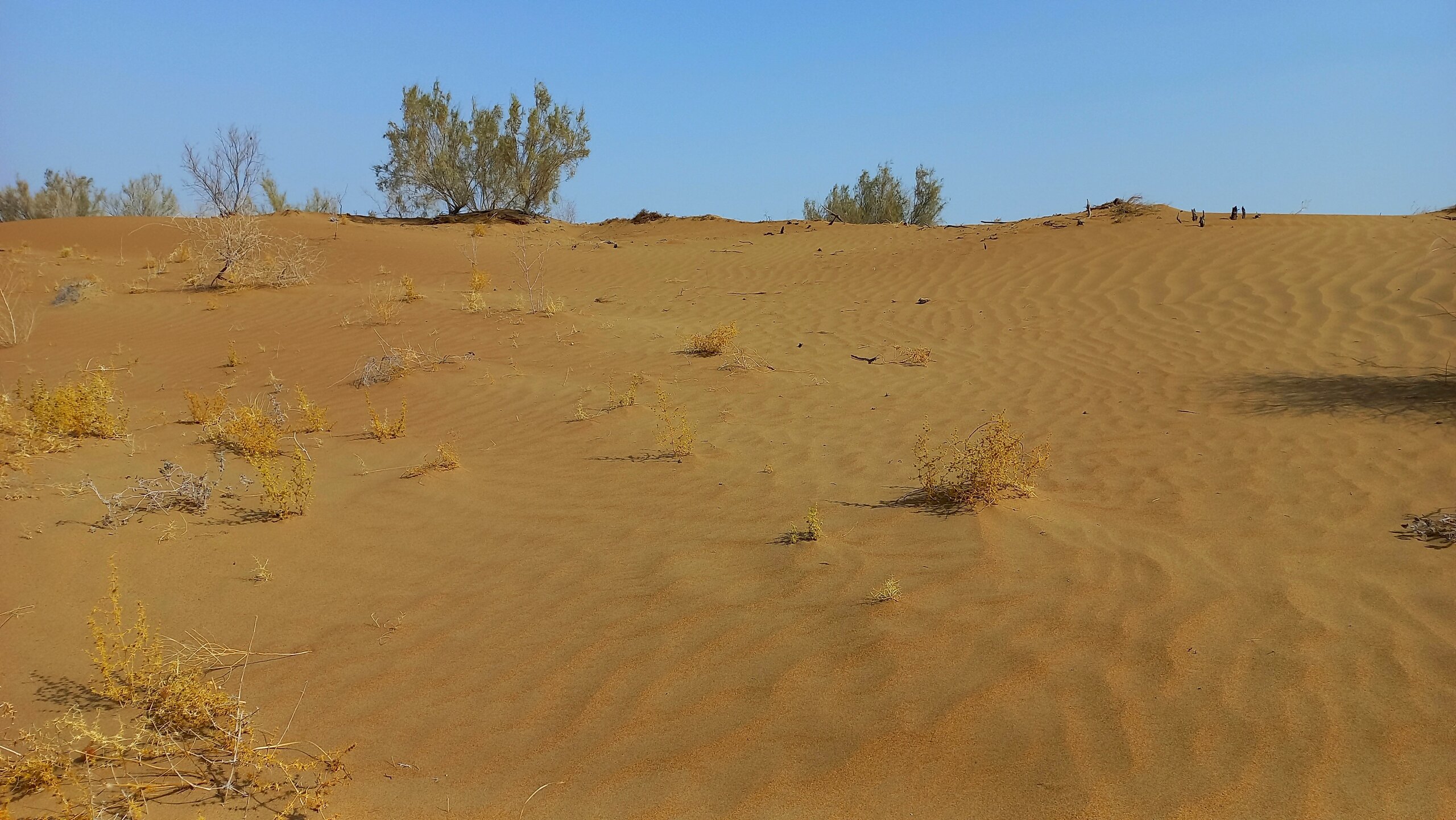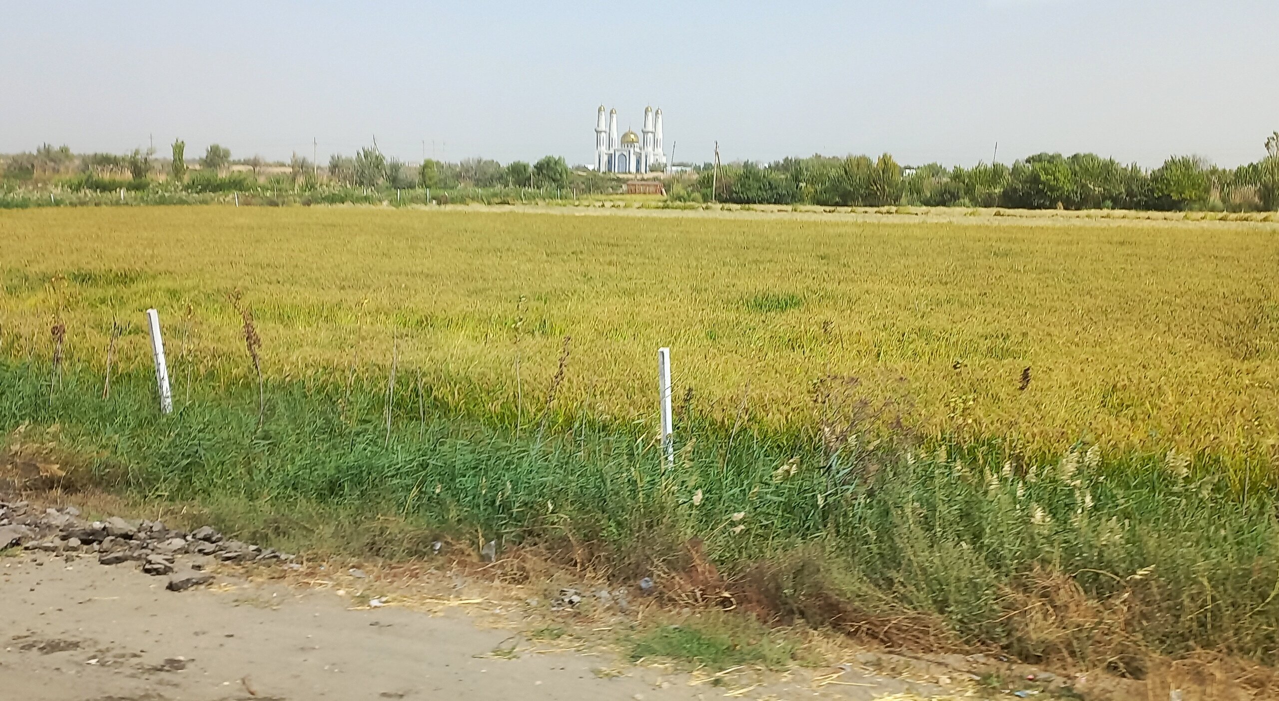 По дороге в Хиву От Бухары до Хивы 450 км. Едем по Кызылкуму. Пустыня расположена между Сыр-Дарьей и Аму-Дарьей в основном на территории Узбекистана, и площадь ее больше Великой Британии вместе со всеми ее островами. Пустыня выглядит скучно: солончаки вперемешку с каменистыми равнинами с саксаулами и песчаной акацией и сухими руслами древних рек. В пустыне могут встретиться барханы, даже высотой до 30 метров. Могут. Но нам такие не встретились. Пейзаж в основном был каменистой равниной, вот,такой: Как я уже раньше писала, при СССР был большой заказ на хлопок. Хлопкоробство вытесняло садоводство и полеводство. Хлопок требовал много воды. Была проведена масштабная ирригация. В результате Сыр-Дарья не доходит до Арала, теряется в пустыне, Аму-Дарья тоже сильно обмелела. Арал высох. Ветер разносит по округе гербициды с его высохшего дна. Местные жители болеют легочными заболеваниями. Сейчас собираются посадить на дне Арала саксауловый лес, чтобы он защитил дно от выветривания. Еще на берегу Арала в советское время была биолаборатория. После распада Союза ее забросили. Пригласили западных специалистов для организации захоронений опасных отходов. Солончаковые почвы для урожайности требуют промывания от соли - землю пашут, заливают водой на некоторое время, а потом полученный рассол сливают (куда-то ). Такую процедуру надо делать ежегодно. В 10 утра - санитарная остановка: Над остановочным комплексом под завывание сильного ветра разносится песня "Учкудук - три колодца". Городок Учкудук со своими тремя колодцами в городском парке где-то в этом районе. В пустыне жарко, но ветер не только сильный, но еще и очень холодный. Каким-то образом пустынный жар и ветреный холод умудряются существовать параллельно. А человек сначала вспотеет от жары, а потом холодный порыв ветра его охладит до простуды. Дали теряются в дымке. Это песчаная буря. Она будет сегодня целый день, даже в Хиве. Песок в лицо вроде не кидает, но мельчайшая пыль висит в воздухе. Я начала чихать. Решила, что это, как у местных, аллергия на аральские пестициды. Следующая остановка - возле бархана. У водителя и Шерзода есть свой заветный бархан, куда они высаживают туристов (с барханами в Кызылкуме - напряженка, их еще поискать надо ). Он, конечно, не 30 метров высотой, но харчами перебирать не приходится. Фотографируй, что дают: Шерзод совещается с водителем и его сыном-помощником для этого перегона. Отец водит автобус очень быстро, но мягко, без рывков. А юный сын - вообще Шумахер. 450 км промчали очень быстро. На бархане продолжила чихать еще сильнее, прямо, вот, от всей души. Едем дальше. Трасса идет вдоль правого берега Аму-дарьи. Пересекли ее рукав: В моем дорожном блокноте записано: проехали поворот на Нукус, Шерзод - о музее. Наверно, этот поворот: В Нукусе недурно было бы побывать. Это - столица Каракалпакии, в которой находится ни много ни мало, а целый "Лувр пустыни". Так называют Государственный музей искусств имени И. В. Савицкого, основавшего музей. Савицкий впервые оказался в Средней Азии во время эвакуации художественного института, в котором учился в Великую отечественную. По состоянию здоровья он был освобожден от службы, вот и эвакуировался. Здесь он участвовал в этнографических и археологических экспедициях и буквально влюбился в Каракалпакстан. Впоследствии он сюда перебрался окон