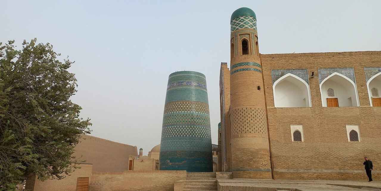 Хива. Ичан-Кала Ну, а мы гуляем по Ичан-Кала. Действие коньяка прошло, и я обчихала всю цитадель вдоль и поперек. Вдобавок к вирусу пылевая буря не закончилась и травила аральскими гербицидами . Ветер угрюмо завывал, пыль вдыхалась, а на солнце можно было смотреть без очков. Да и солнце еще поискать надо было за пылевой завесой. У нас вроде в первый день не было экскурсии. Шерзод покормил нас, сориентировал и отпустил с Богом на все четыре стороны. Или мы с Раей просто отбились от коллектива? В общем, гуляли вдвоем. От каравана зашли через западные ворота обратно в Ичан-Калу: Здесь, рядом с другой стороной медресе, мимо которого шел тот красивый караван с моими сокровищами и умным купцом с книгой в руках, взгляд притягивает красивый минарет, облицованный плиткой, но странной формы, как будто обрубленный. Слева от него, кстати, диск солнца, затуманенный пылевой бурей: Он так и называется - Кальта Минар, короткий минарет. В 19 веке местный хан замахнулся на строительство самого высокого в мире 80-метрового минарета. Строительство еще только началось, а хан уже почувствовал себя великим, заиграл мышцами и отправился померяться силами с туркменским коллегой. Из похода и хан не вернулся, и минарет не достроился. Но теперь этот недострой - один из символов Ичан-Кала. Другие минареты немного напоминают трубы котельных: Весь город и снаружи зданий и внутри - один большой рынок. У нас осталось немного сумов, и мы присматривались, на что бы их потратить. Положили глаз на узбекские халаты: Купили мы с Раей по халату из, якобы, чистой верблюжьей шерсти (в чем я теперь очень сомневаюсь, но все равно он уютный и приятный на ощупь)) по цене в переводе на руб за 1600 руб: и довольные отправились со своими халатами, конечно же, пить пиво: Услышав знакомое чихание, из другого угла кафе нам помахали рукой одногруппники, но подходить на всякий случай не стали