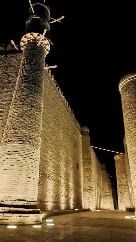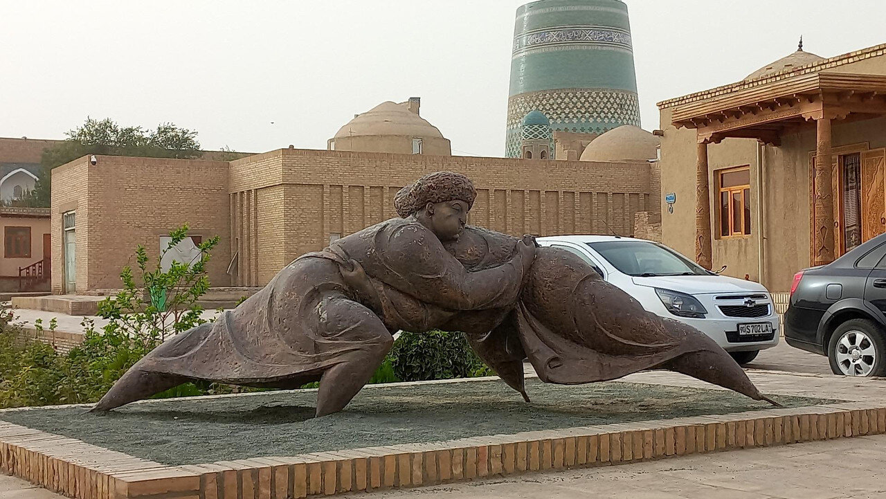 Хива Хива стала столицей Хорезма после Ургенча в 16 веке, и Хорезм стал называться Хивинским ханством. А Ичан-Кала - внутренний город Хивы, крепость с 10-метровыми зубчатыми стенами в высоту и 5-6 метровой толщиной, за которыми в лабиринте узких улиц стоят мечети, медресе, минареты, дворцы и жилые дома. Это - город-музей, но на его территории, как и в средние века, живут люди, около 2 тысяч. Ичан-Кала имеет форму прямоугольника примерно 800х400 м. С каждой стороны имеются ворота с ударными защитными башнями. Мы заходим через Восточные. Они же - Палван-Дарваза, Богатырские ворота (названы в честь знаменитого борца и поэта древности Палвана, или Пахлавана) или Невольничьи ворота (ранее справа от них располагался большой невольничий рынок). Фото только вечернее есть, когда оглянулись, уходя: При чтении про эти ворота попалась необычная легенда. Недалеко за воротами находятся бани и мечеть. История их строительства такова: один из правителей Хивы имел девять сыновей, но очень хотелось ему иметь дочь, и десятым ребенком он наконец её получи - дочь Ануш. Прошли годы, и затеял этот хивинский хан войну с бухарским ханом (такая война, действительно, была), но войну проиграл, и был пленен. Выручать незадачливого папашу отправились не сыны, которые уже делили трон меж собой, а Ануш. Она заключила с бухарским ханом пари: если сможет изумить его, он отпустит отца. И отпустил, ведь. Потому что Ануш изумила, раздевшись при нем донага. Дочь оказалась сыном, просто от хивинского хана это скрыли, чтобы не огорчать Растроганный и тоже изумленный хивинский хан молвил: -Я думал, у меня есть девять сыновей и одна дочь, а оказалось, что у меня есть только один сын, - и передал трон Ануш, а заодно построил в честь нее него бани и мечеть. По узкой улице, рассекающей Ичан-Калу посередине, доходим до западных ворот. Это главные ворота крепости, через которые сюда и заходят туристы, ибо живут в маленьких отелях старого города за стенами Ичан-Калы. У нас же - большая группа, поэтому мы жили везде в больших помпезных отелях. А наилучший вариант проживания - в отелях внутри Ичан-Калы. Из многих этих отелей есть выходы на смотровые площадки, а завтраки накрывают на крышах с видом на древности внизу. Фото ворот из инт-та: В крепости много качественных жанровых скульптур. Снаружи у западных ворот - караван: Кто книжки в дороге читает, чего терять время зря: а я проверяю, как закреплен мой сундучок с драгоценностями, хотя чтение книжек в дороге мне бы больше подошло, да на верблюда уже не вскарабкаться: Зато изумила двух аксакалов, ткнув пальцем в небо, да, и сама изумилась увиденному: Друзья трогательно-забавными получились. Один мальчик в узбекской тюбетейке, другой в туркменской меховой шапке (Туркменяи хдесь рядом). Наверно, скульптура о дружбе народов: А это уже живые персонажи: Этот важный верблюд тоже живой: