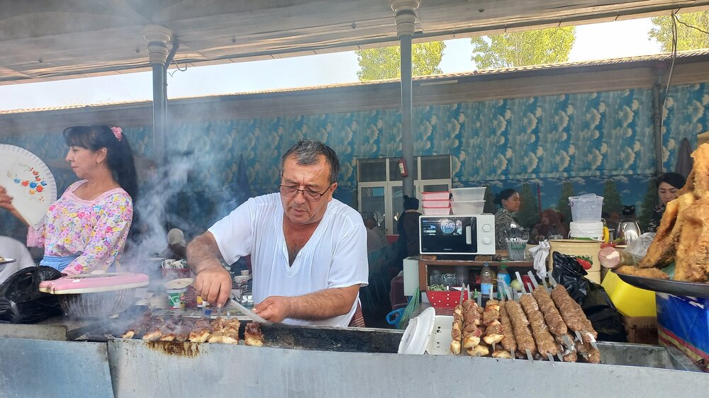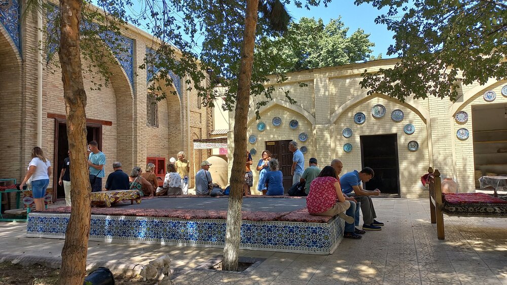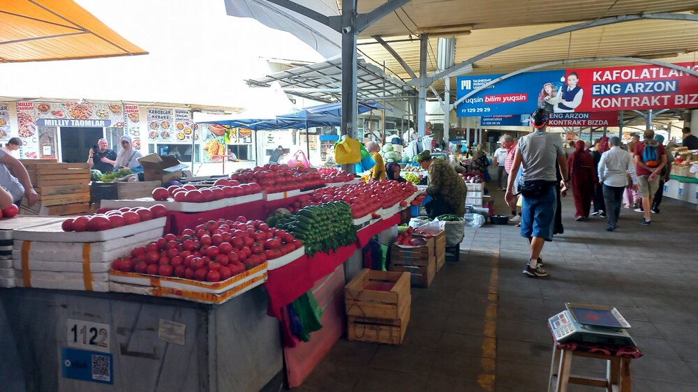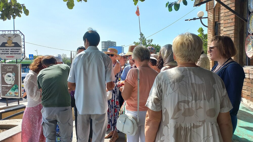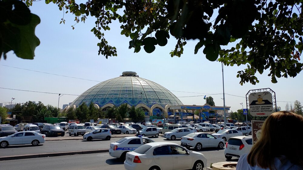 4. Ташкент. В чертикуличный отель заселились уже затемно. Сегодня отсыпаемся. А на завтраке вдруг кто-то обнимает меня сзади. Оказалось - Лена из поездки в Прованс, аж, в 2016 г., когда мы сначала познакомились с ней на форуме ТТВ, обсуждая предстоящую поездку, потом в путешествии вместе гуляли вечерами и устраивали вечерние застолья двумя номерами с прованскими специалитетами: С тех пор периодически общались на форуме ТТВ. Здесь Лена и прочла, что я лечу в тот же тур, что и она, и решила устроить сюрприз. И я, ведь, ее сразу узнала. Вот, такой он, ТурТрансВояж – знакомит и сохраняет отношения на годы. Лена – мастерица по выпечке пряников. Привезла мне пару в подарок. Через 10 дней, дома, они еще оставались мягкими. Лена, спасибо. Жду тебя здесь. Вставляй сюда свои фото и впечатления. А может, здесь есть еще кто-то из группы? Сегодня у нас автобусная экскурсия по Ташкенту с нашим гидом Шерзодом Умаровым, уроженцем Ташкента. Автобусная – потому, что Ташкент очень большой город. Проезжаем мимо посольства России. Охранник подпирает стенку в тени рядом со щитом «Красоты России»: Сначала у нас на пути мемориальный комплекс, посвященный народам, помогавшим восстанавливать Ташкент после землетрясения. Установлен в месте эпицентра толчков. Чинарам за скульптурой почти 50 лет, посажены одновременно с устройством мемориала в 1976 г. И сам памятник впечатляюще выглядит с мужественными мужчиной и женщиной, спасающими своего ребенка, со временем и датой землетрясения, плиткой, выложенной в виде трещины в земле (трещина, если что, за кубом, идет к скульптуре), но бОльшее впечатление произвели 14 панно с барельефами за скульптурой, на которых изображена помощь всеми советскими республиками «хлебному городу» Ташкенту, спасшему тысячи и тысячи жизней во время ВОВ. С обратной стороны барельефов гербы республик: В центре - российское панно: Прогулялись немного по парку. Хочу сказать, что у нас в Ярославле нет парков от слова совсем. А то, что важно именуют ими, всего лишь скверы, изуродованные реконструкциями. Вот, пример, городского парка (дальше и парков будет больше и их размеров): В Иране таких загорающих мы не видели))) Утро понедельника. Везде уборщики. Причем метут обычными вениками сорго, иногда на длинных палках. Город чистый: Едем дальше...