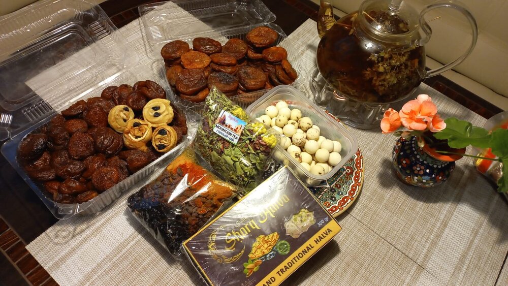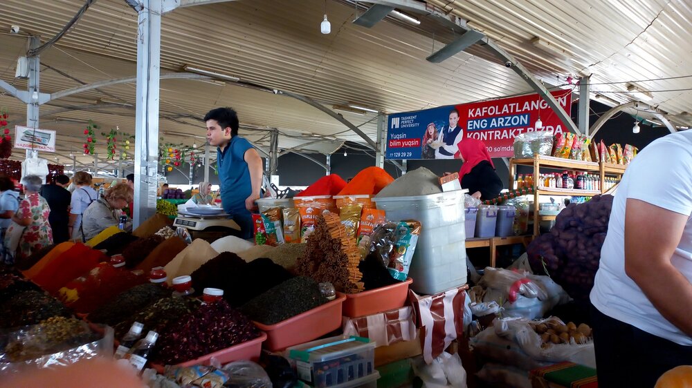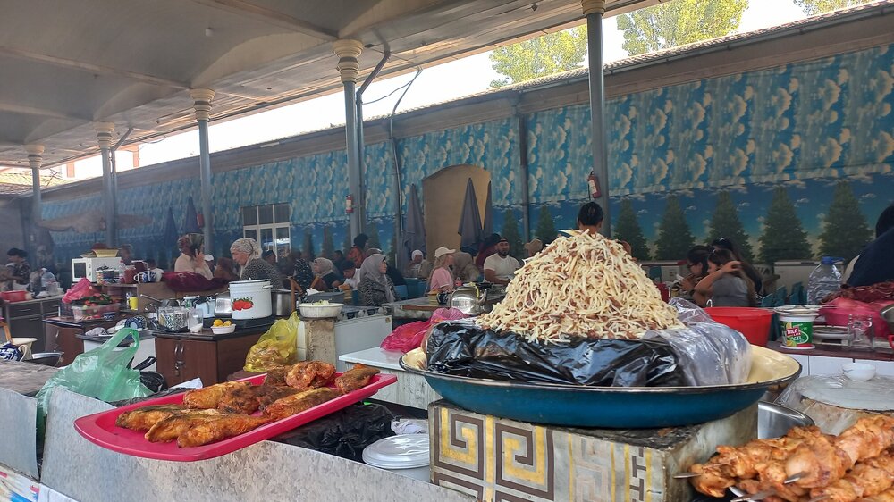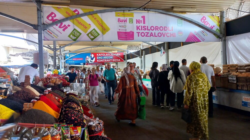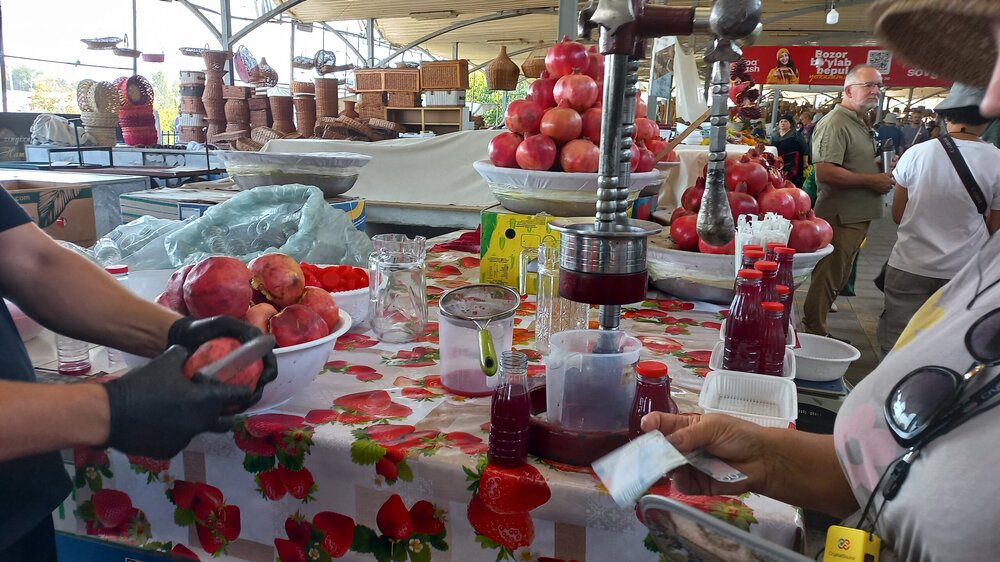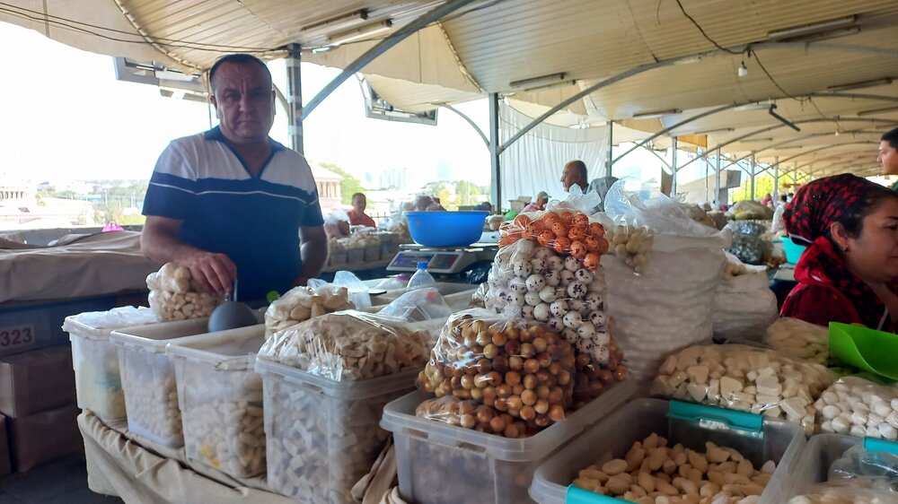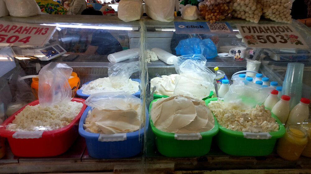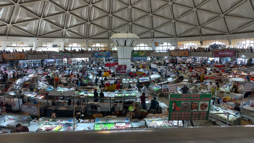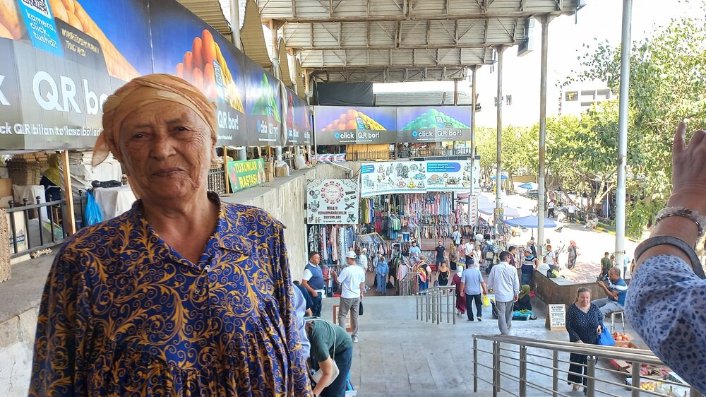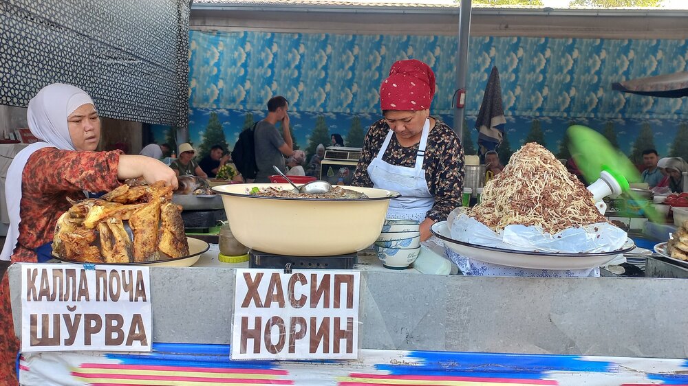 1. Ташкент. Базар Чорсу Следующая наша локация – очень яркая, очень шумная и очень пряная. Настоящая восточная, да еще со средневековой историей. Конечно же, это знаменитый базар Чорсу. Название переводится, как 4 дороги. Стоял на перепутье Великого шелкового пути. Только представить, что здесь, на этом месте столетиями (!) купцы в разных тюрбанах, шапках, колпаках, тюбетейках толклись, шумно торговались; ремесленники громко зазывали в свои лавки; обжорные ряды тонули в ароматном паре, а навьюченные верблюды горделиво, свысока поглядывали на людскую суету. Этот голубой купол главного здания базара построен в начале 90-х годов прошлого века. Вокруг него есть еще маленькие голубые купола и пристройки. Мы стоим напротив базара у гончарной лавки. Шерзод пригласил сюда менял: Потом он заводит нас на базар (перейти дорогу без светофора тот еще аттракцион), показывает расположение рядов, и мы пропадаем во времени и пространстве, аромате и шуме-гаме. -Пробуйте, приценивайтесь, но покупать лучше в Бухаре и Самарканде – там дешевле, и чемоданы с покупками меньше таскать останется. Легко сказать,торгуйтесь Вот, не умею я торговаться, да и не хочу, не приучены мы с детства к этому. Вроде, торгуясь, ощущаешь себя неплатежеспособной, давая торговцу чувство превосходства над собой Да, и пробовать, не собираясь покупать, тоже неловко. Идем, смотрим. Глаза разбегаются, с ушами и носом тоже что-то происходит Овощи отдельно: Приправы отдельно: Молочные ряды: Солености со сногсшибательным ароматом: Спускаемся из-под купола вниз: На лестнице со мной приветливо заговаривает пожилая женщина. Спросила, откуда мы, разрешила сфотографировать. -Вот, всегда сюда и приходите: Торговцы обращаются к нам "сестра" и даже "мама", только дочкой никто не назвал . В таком обращении есть что-то уважительное и дающее ощущение безопасности. Иногда еще обращались почему-то "мадам". Все улыбаются, говорят, в основном, на русском языке. А вот и обжорные ряды: Вот здесь, у парящего блюда, вспомнилась сказака о Ходже Насреддине: Однажды Ходжа Насреддин шёл по базару и услышал шум и крики из харчевни. Он заглянул внутрь и увидел, что харчевник тряс за шиворот нищего и требовал денег, а тот не хотел платить. Харчевник объяснил, что нищий держал свою лепёшку над жаровней, пока она не пропиталась насквозь запахом шашлыка и не стала вдвое вкуснее. Потом он съел лепёшку, а теперь не хочет платить. За это его надо отхлестать плетью. На что Ходжа ответил: -Раз он всего лишь держал лепешку над паром, то справедливо будет отхлестать не нищего, а его тень. Нанюхавшиеся, но не отхлестанные, ушли из обжорных рядов на 2 этаж главного купола к сухофруктам, чтобы посмотреть вниз: В общем, на этом базаре мы с Раей купили только курт или курут. Никогда его не ела и не слышала о нем. Это шарики разного размера из высушенной творожистой массы с солью и разными приправами. Шерзод посоветовал их купить. Он всегда берет курт с собой в дорогу - места занимает мало, а 2-3 штуки дают чувство сытости. На самом деле, так и есть: У гранатового сока Рая вскрикнула: -Телефон! Телефон где-то оставила! - и судорожно начала копаться в своем рюкзаке. А что рюкзак у Раи, что моя дорожная сумочка со множеством отделений - они, как черные дыры. В них периодически всё пропадало, но потом находилось. -Сестра, сестра, - говорит торговец успокоитель