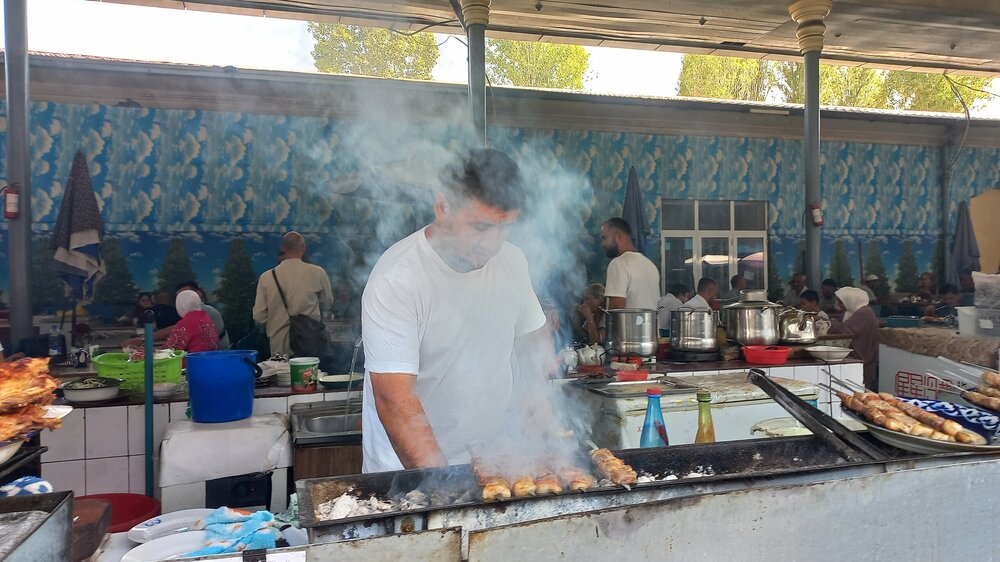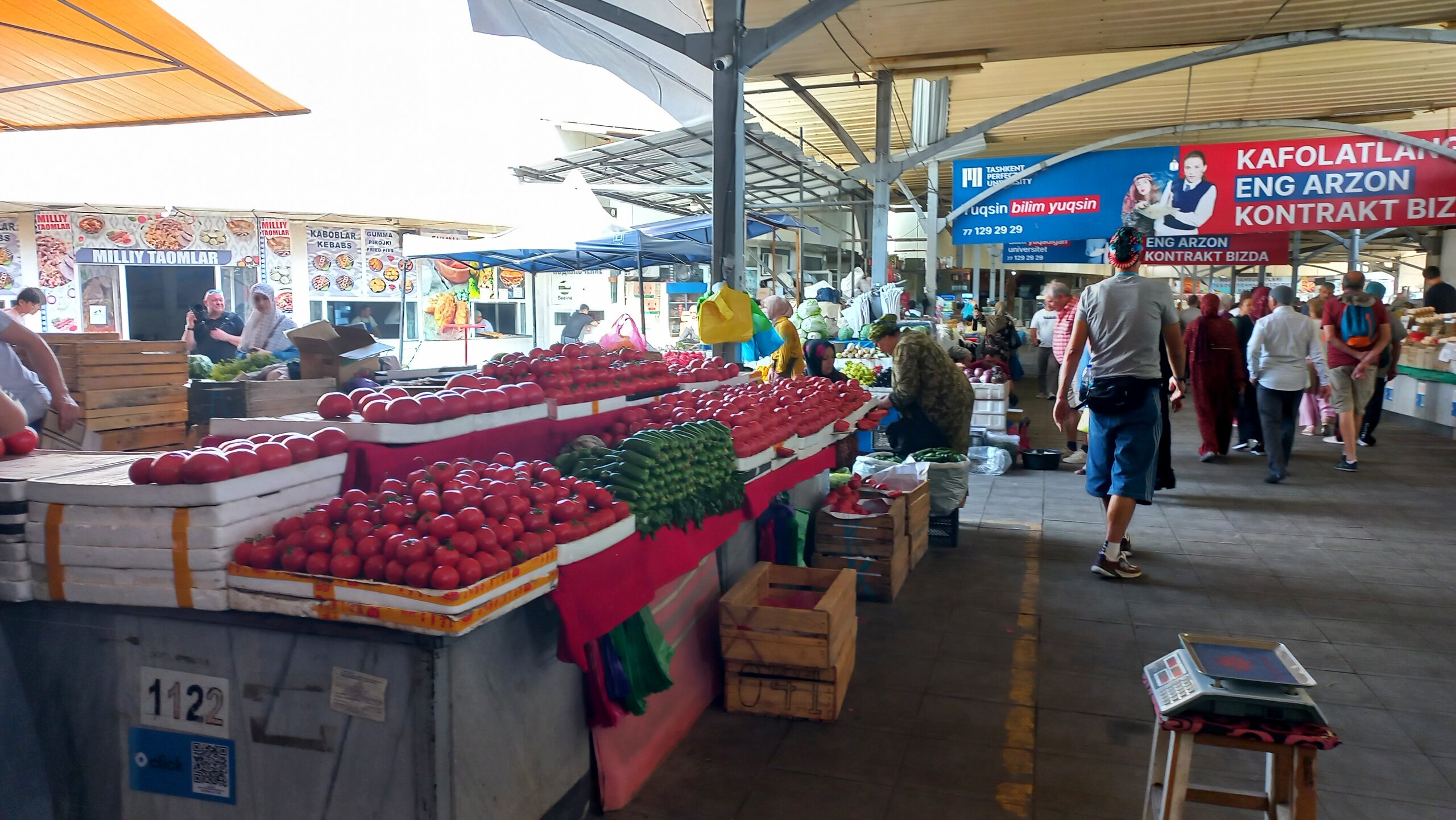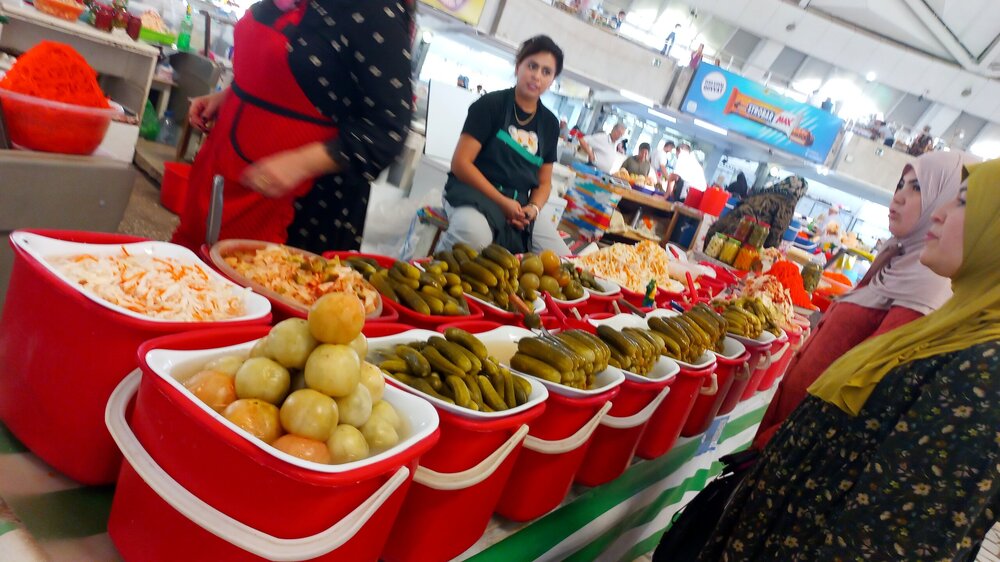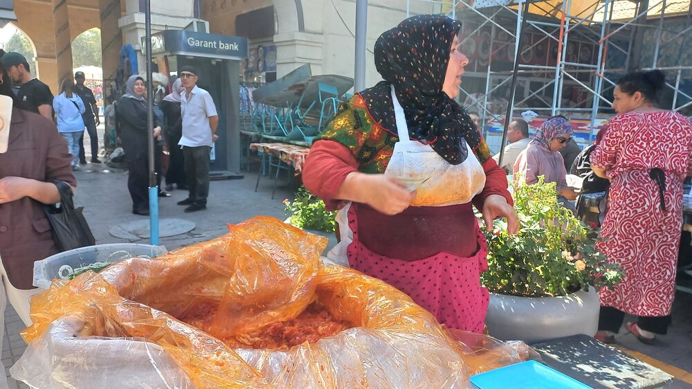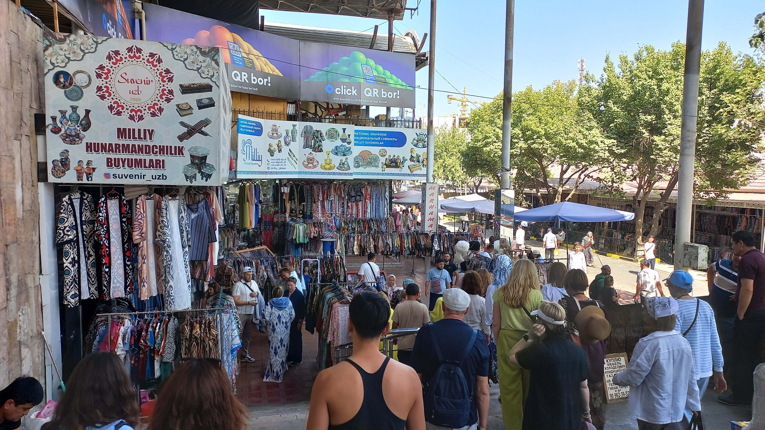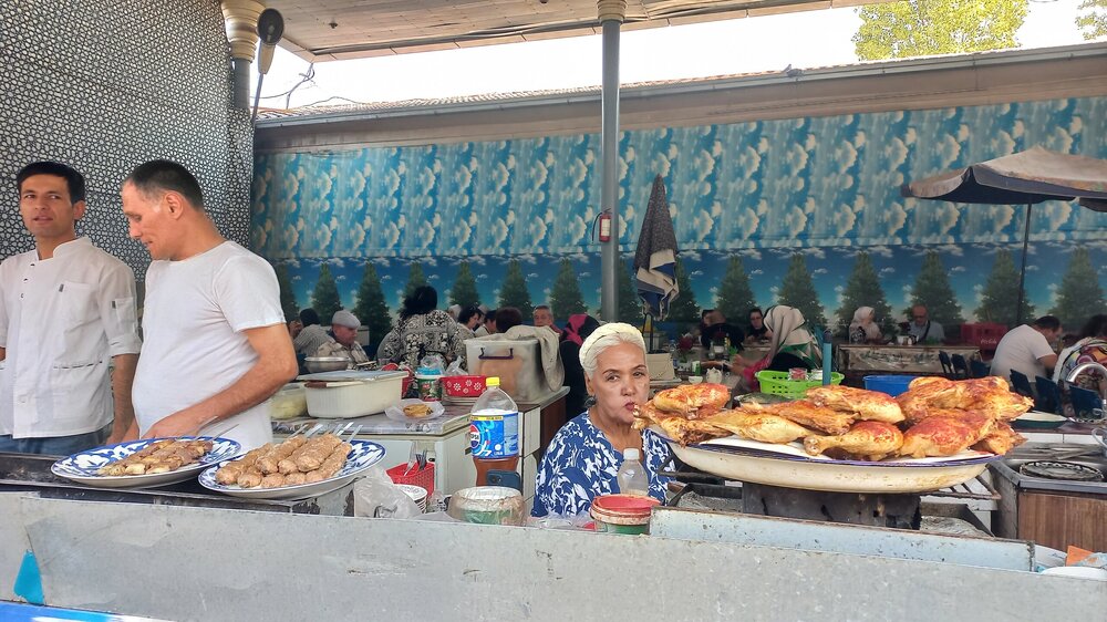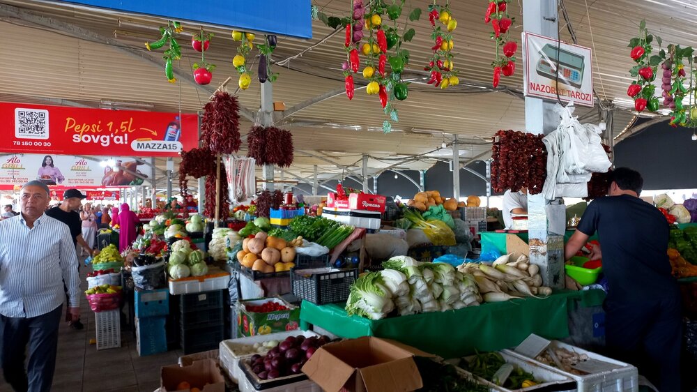 1. Ташкент. Базар Чорсу Следующая наша локация – очень яркая, очень шумная и очень пряная. Настоящая восточная, да еще со средневековой историей. Конечно же, это знаменитый базар Чорсу. Название переводится, как 4 дороги. Стоял на перепутье Великого шелкового пути. Только представить, что здесь, на этом месте столетиями (!) купцы в разных тюрбанах, шапках, колпаках, тюбетейках толклись, шумно торговались; ремесленники громко зазывали в свои лавки; обжорные ряды тонули в ароматном паре, а навьюченные верблюды горделиво, свысока поглядывали на людскую суету. Этот голубой купол главного здания базара построен в начале 90-х годов прошлого века. Вокруг него есть еще маленькие голубые купола и пристройки. Мы стоим напротив базара у гончарной лавки. Шерзод пригласил сюда менял: Потом он заводит нас на базар (перейти дорогу без светофора тот еще аттракцион), показывает расположение рядов, и мы пропадаем во времени и пространстве, аромате и шуме-гаме. -Пробуйте, приценивайтесь, но покупать лучше в Бухаре и Самарканде – там дешевле, и чемоданы с покупками меньше таскать останется. Легко сказать,торгуйтесь Вот, не умею я торговаться, да и не хочу, не приучены мы с детства к этому. Вроде, торгуясь, ощущаешь себя неплатежеспособной, давая торговцу чувство превосходства над собой Да, и пробовать, не собираясь покупать, тоже неловко. Идем, смотрим. Глаза разбегаются, с ушами и носом тоже что-то происходит Овощи отдельно: Приправы отдельно: Молочные ряды: Солености со сногсшибательным ароматом: Спускаемся из-под купола вниз: На лестнице со мной приветливо заговаривает пожилая женщина. Спросила, откуда мы, разрешила сфотографировать. -Вот, всегда сюда и приходите: Торговцы обращаются к нам "сестра" и даже "мама", только дочкой никто не назвал . В таком обращении есть что-то уважительное и дающее ощущение безопасности. Иногда еще обращались почему-то "мадам". Все улыбаются, говорят, в основном, на русском языке. А вот и обжорные ряды: Вот здесь, у парящего блюда, вспомнилась сказака о Ходже Насреддине: Однажды Ходжа Насреддин шёл по базару и услышал шум и крики из харчевни. Он заглянул внутрь и увидел, что харчевник тряс за шиворот нищего и требовал денег, а тот не хотел платить. Харчевник объяснил, что нищий держал свою лепёшку над жаровней, пока она не пропиталась насквозь запахом шашлыка и не стала вдвое вкуснее. Потом он съел лепёшку, а теперь не хочет платить. За это его надо отхлестать плетью. На что Ходжа ответил: -Раз он всего лишь держал лепешку над паром, то справедливо будет отхлестать не нищего, а его тень. Нанюхавшиеся, но не отхлестанные, ушли из обжорных рядов на 2 этаж главного купола к сухофруктам, чтобы посмотреть вниз: В общем, на этом базаре мы с Раей купили только курт или курут. Никогда его не ела и не слышала о нем. Это шарики разного размера из высушенной творожистой массы с солью и разными приправами. Шерзод посоветовал их купить. Он всегда берет курт с собой в дорогу - места занимает мало, а 2-3 штуки дают чувство сытости. На самом деле, так и есть: У гранатового сока Рая вскрикнула: -Телефон! Телефон где-то оставила! - и судорожно начала копаться в своем рюкзаке. А что рюкзак у Раи, что моя дорожная сумочка со множеством отделений - они, как черные дыры. В них периодически всё пропадало, но потом находилось. -Сестра, сестра, - говорит торговец успокоитель