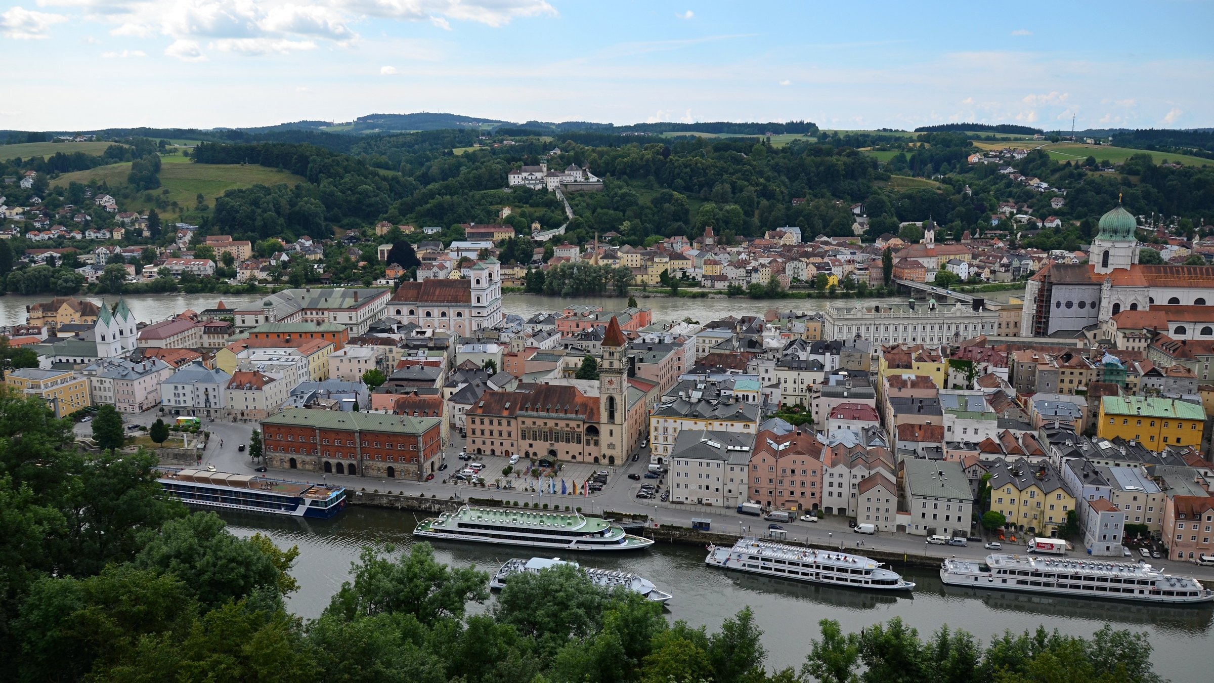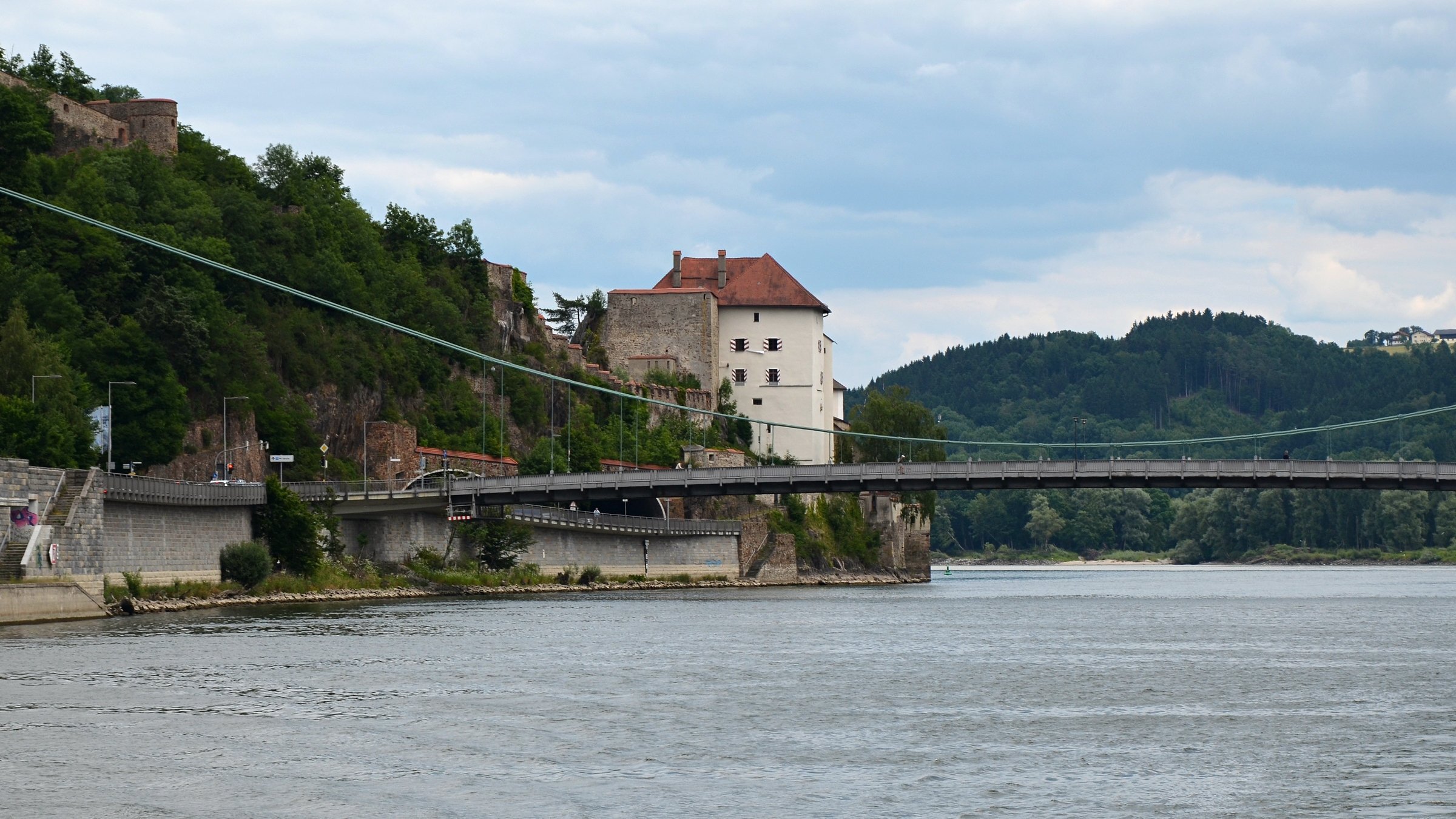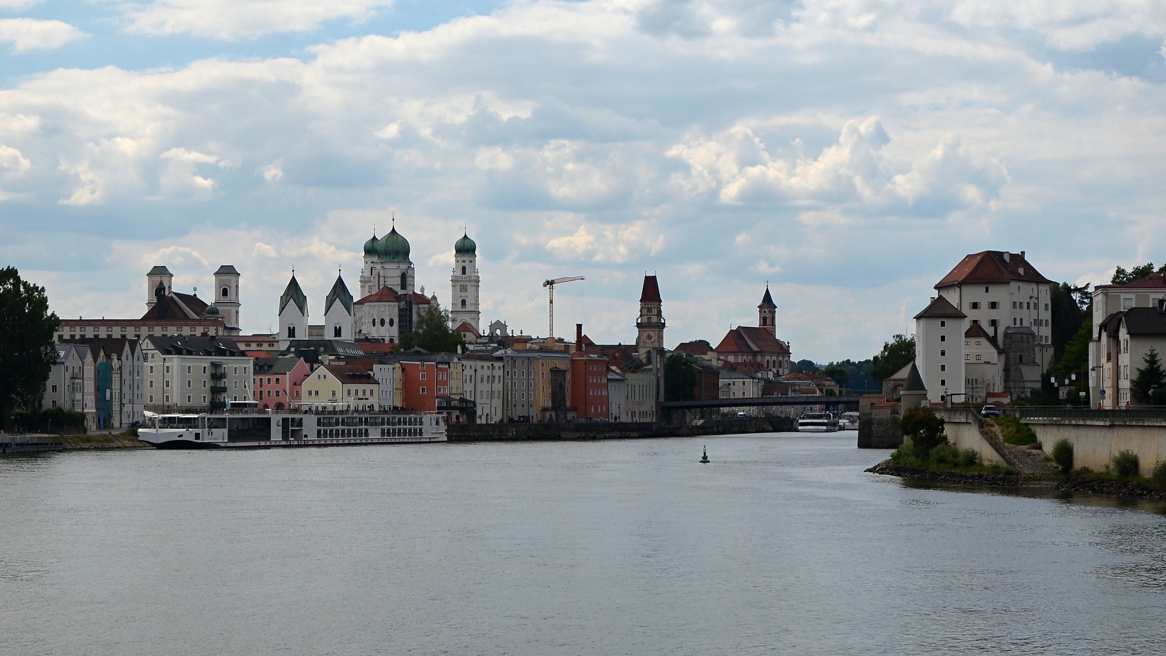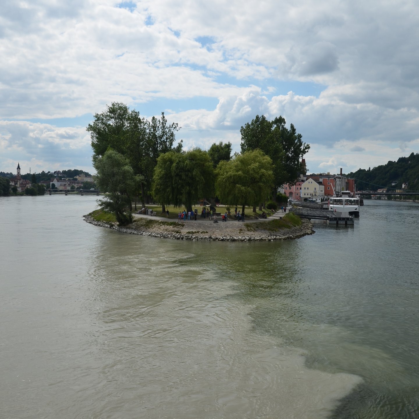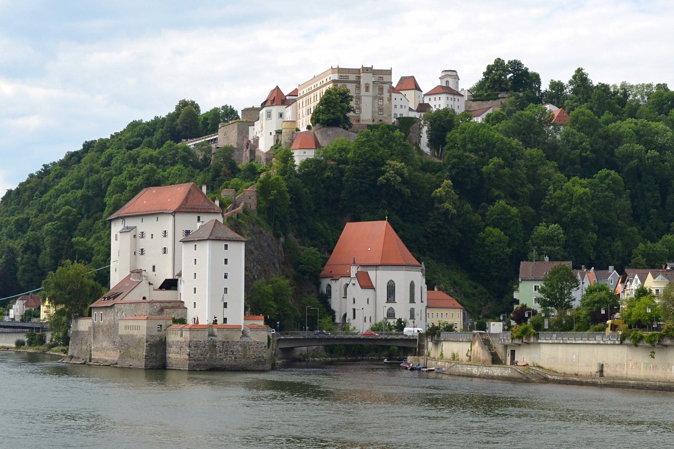 Если можно, я исправлю эту несправедливость? 😉 Тем более, что Пассау - в безумно далёком уже 2014 году - и мне в душу запал. Это был первый мой немецкий город вообще, и до сих пор остаётся, кажется, единственным городом западной Германии, мной когда-либо посещённым. Первая моя встреча с Германией, как сейчас помню, началась забавно. Едва выскочив из автобуса и прохаживась по парковке, дабы размяться, я буквально наткнулся на аборигена местного жителя, громко ругавшегося с парковочным автоматом (!) за то, что тот не хотел принимать пятиевровую купюру. Заметив мой недоумённый взгляд, немец обратился ко мне за помощью - разменять бумагу на монеты, которые по счастью у меня были. Не помню как, но общий язык мы нашли, хотя мои познания в немецком языке ограничивались в основном стандартным набором из кино про немцев 😁. Дабы не повторяться за Таней, покажу немного другие места. Мои любимые виды сверху книзу (нас на Оберхаус тогда всё-таки сводили). Городской мыс. Инн Слияние двух лун рек здесь бликует, но не беда. Позже я его всё-таки поймал в объектив. Монастырь Нидернбург с двумя похожими на пару карандашей башенками - кажется, тот самый что был описан ещё в легендарной Песне о Нибелунгах. Держала путь Кримхильда через баварский край На Пассау, где с Инном сливается Дунай И монастырь старинный стоит, поныне цел. Епископ Пильгрим, муж святой, тем городом владел. Когда о том, кто едет, известно стало там, Помчался князь-епископ навстречу пришлецам - Кримхильде приходился он дядею родным. Весь Пассау последовал немедленно за ним. Не зря рвались баварцы встречать гостей своих: Девицы королевы пленили взоры их. Свести знакомство с ними был каждый витязь рад. Сумел удобно разместить всех прибывших прелат. Дом, рядом с которым в возрасте четырёх лет едва не утонул Адольф Гитлер. Другой мальчишка его спас - и потом всю жизнь корил себя за это. Хотя стоило ли? При тогдашних общественных настроениях какая-нибудь экзальтированная до шизофрении личность, считающая себя всегда правой и готовая причинять и наносить чего-нибудь всем, кто не успел спрятаться, обязательно бы нашлась. Святой Стефан и перед нами предстал в лесах Но на органный концерт мы сходили. Записей увы не осталось - но зато вволю побаловался внутри купленным незадолго до тура объективом-фишаем ("рыбий глаз") 😁. А на десерт у нас была ещё и водная прогулка по Дунаю и Инну. На прекрасной Брунгильде Гизели под баварским флажком. Устье Ильца. И правда, выглядит черноватым. Примерно как многочисленные Чёрные речки что в уральских, что в припитерских лесах. Фото Ильца из автобуса и навскидку, не обессудьте за качество. Слияние Дуная и Инна. Разноцветье налицо. Прям хоть делай фото в стиле "одна нога здесь, другая там" 😁. Дунай. Инн. На башне - следы случившегося годом ранее (в 2013-м) большого наводнения в Пассау, когда "Баварская Венеция" на несколько дней стала "Баварской Атлантидой" - вода поднялась на несколько метров. Судя по линейке-футштоку на ратуше - это второе место за всю историю наблюдений... Чудесный город, куда действительно хочется вернуться.