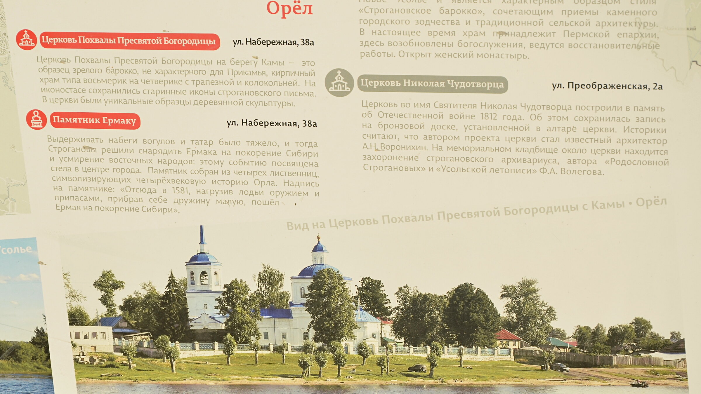 О - ОРЁЛ Но не тот, который областной центр российского Черноземья, а другой. Орёл-городок на берегу Камы, откуда четыре с половиной века назад казак Ермак Тимофеевич со товарищи отправились в свой знаменитый сибирский поход. Снарядившись с помощью Строгановых в Орле, поднявшись по рекам Каме, Чусовой и Серебряной, перетащив струги волоком через Уральский хребет в районе современных Кедровки и Кушвы, казаки "оседлали" реки по ту сторону Урала: Баранчу, Тагил, Туру, Тобол, и уже к концу октября разбили Кучума в знаменитой, увековеченной на картине Сурикова, битве. И, несмотря на гибель Ермака тремя годами спустя, победа эта стала решающей. В 1586 году была основана Тюмень, ещё через год - Тобольск. Москва и русские пришли в Сибирь навсегда. А Орлу-городку было суждено остаться в истории "стартовой площадкой" для её покорения. Сам Орёл-городок сегодня - довольно обширное село (вот такой оксюморон, да), несмотря на население в полторы тысячи человек. Казалось бы, всё его можно с относительным комфортом разместить в несколько типовых многоэтажек. Можно, но зачем? 😁 А все присутственные места нашего Орла умещаются в одном невеликом здании. Помимо памятника Ермаку, главные достопримечательности Орла-городка - это конечно Кама-река... Даже теплоходы по ней заходят в Орёл в сезон! Прелюбопытный туристический маршрут "Соляные столицы Прикамья". Но конечно самая главная здешняя драгоценность - церковь Похвалы Пресвятой Богородицы. Нынче ей 291 год! Памятник в ограде напоминает, что здесь, в Орле-городке, сто лет спустя после похода Ермака, местный священник, протопоп Потап (в миру Потап Прокопьевич Игольнишников) создал удивительный шедевр словесности - рукописный свод своих проповедей (числом 156) под названием "Статир". Так в Древней Греции звалась золотая монета. И называя так свой труд, автор, возможно, намекал, что золотом бывает не только молчание, но и хорошо сказанное слово. Церковь редкостная, двухстолпная, и очень красивая внутри! Находится наш Орёл-городок всего в 10 километрах от посещаемых в турах ТТВ Березников и Усолья. И вполне достоин дополнительного заезда сюда.