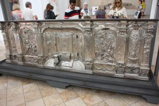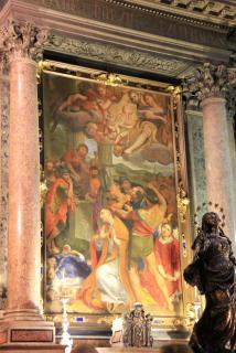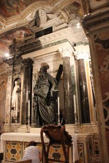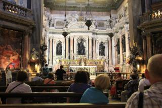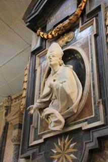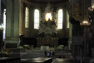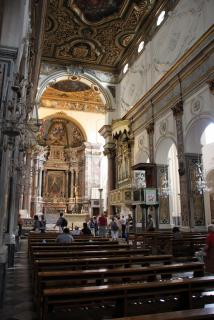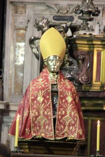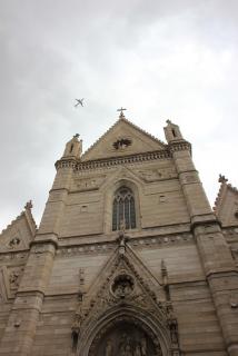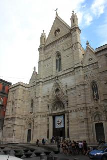Конечная цель нашего пешеходного маршрута - Кафедральный собор, посвящённый Святому Януарию. Епископ Януарий в 3 веке навещал диаконов, брошенных в тюрьму, где совершал с ними богослужения. Был арестован за христианские богослужения, брошен сначала в печь и не сгорел, затем - к диким зверям и не был ими съеден. Наконец, был обезглавлен, но его кровь, по преданию, была сохранена доброй христианкой и дошла до наших дней в виде двух ампул, хранящихся в соборе. Кровь "оживает" три раза в год: в первую субботу мая, 19.09 и 16.12. Материалисты, исследовав ампулу, нашли в ней сухую кровь, но считают, что причиной чуда может быть тексотропный бурый гель оксида железа. Не обращая на это внимания, неополитанцы беспрекословно верят покровителю города и он неоднократно отвечал им взаимностью, спасая от бед. Как раз об этом многим известная итальянская криминальная кинокомедия "Операция "Святой Януарий". :)