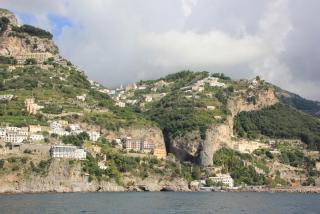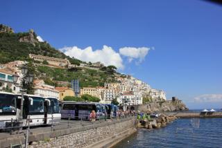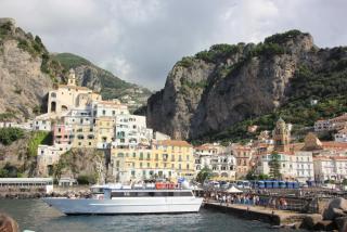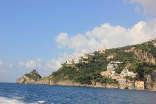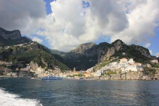 В дальнейшее путешествие по Амальфитанскому побережью мы отправляемся на рейсовом кораблике.Следующий посещаемый нами город Амальфи основан римским императором Константином I,Великим,сделавшим христианство государственной религией и перестроившим за 6 лет Византию в Константинополь. Город был первой морской республикой из четырёх (Пиза,Генуя,Венеция), организовавшей торговлю между Европой и Азией, имевшей торговые и перевалочные базы в Константинополе,Сирии,Египте. Считается, что амальфитанский бедный ювелир Флавио Джойя посадил стрелку компаса на шпильку и разбил круг компаса на 16 румбов.Первые в Европе амальфитанцы стали делать бумагу по арабо-китайскому рецепту на преобразованных макаронных фабриках, первыми создали Кодекс морской торговли. Ну а мы после получасовой поездки прибываем в порт города.