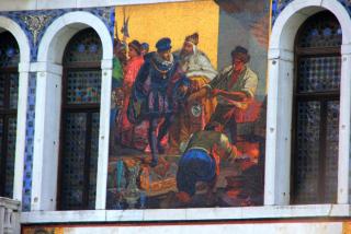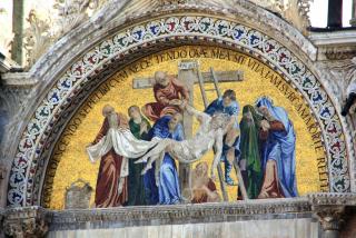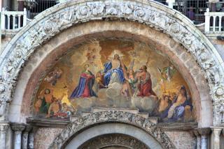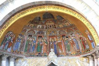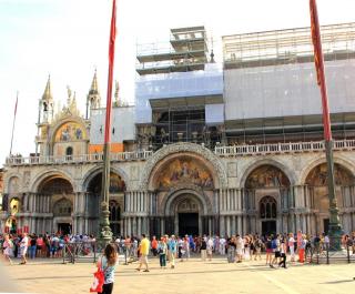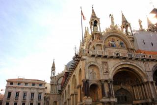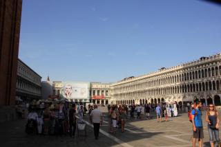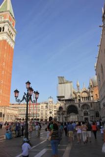 Вот мы и дошли до центральной площади Венеции - площади Святого Марка.Эта площадь - центр религиозной, политической ,судебной и культурной жизни города.Религиозной потому, что на площади находится базилика Св.Марка, построенная для хранения его мощей, похищенных из Александрии, захваченной мусульманами. Перевозили их под слоем свинины и потому избежали "таможенного" контроля. С тех пор Святой Марк - новый покровитель города.