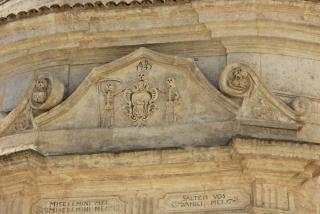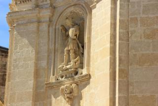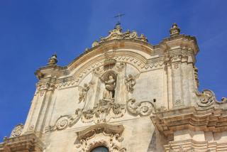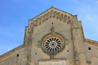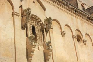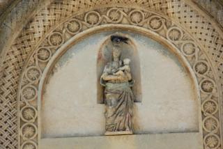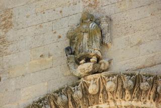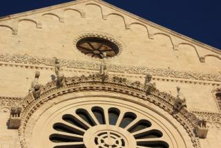 3. Вот мы и подходим к главному собору города - кафедральному, носящему имя Санта Мария делла Бруна. Построен он в 13 веке в знакомом нам апулийско-романском стиле на самой высокой точке города. На фасаде - Санта Мария, являющаяся покровительнецей города. Вверху - роза- колесо фартуны, которое всё расставляет по своим местам: фортуна зависит не от ремесленника или богача, а от знатного вельможи - чиновника ( он внизу всё держит). Так вот откуда всё это идёт.... :) Наверху архангел Михаил, опять убивающий змия ( по - видимому, голубь старается поддержать силы крылатого товарища, попавшего в беду). На южном фасаде находится оконце - гробница сарацинского судьи. Он как бы и сейчас не доступен для простых смертных и помогает решать кого миловать, а кого нет, но уж больно жутко, если нет...