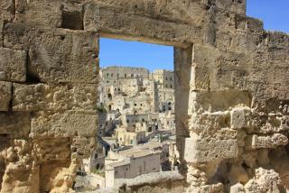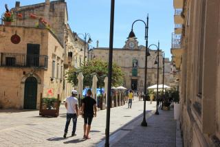 2. Проходя по мощёной дороге, заглядываем в окошко. Вдруг в воображении безлюдные улочки города оживают. Среди бежевых туфовых переулков появляются, громко блея и гремя колокольчиками, маленькие отары овец и коз, погоняемые босоногими подростками. По улочке за одетым в чёрную накидку и такой же черный головной убор крестьянином молчаливо вышагивает, отбивая дробный такт по уложенной камнем дороге, покорный мул.Он знает, что обратно его путь не будет столь лёгким. Кроме вязанки дров и снопов травы придётся везти и уставшего хозяина. Их цель сегодня - обработка опалённой солнцем сероватой земли после уборки урожая пшеницы. В городе слышна смесь языков, но более всего народная латынь - оскский язык и быстрый апулийский говор. На торговой площади громко покрикивают, расхваливая свой товар, бродячие торговцы. Хозяйки в белых вуалях пока только присматриваются к всевозможной кухонной утвари, сладким лепёшкам,оливковому маслу, сушёным фигам и различным фруктам. Большинство же женщин, отправив мужа на целый день в поле, нянчатся с детьми, стирают бельё в верхнем течении речки Брадано, растапливают общие на двор печи для приготовления незамысловатого обеда из белой фасоли и макарон. Многие из них переносят на голове в бочонках замешанное тесто для выпечки местному пекарю или готовят томатные консервы на солнце. Одетая в едва подштопанные лохмотья, бежит по улицам детвора, дразня коз и разгоняя зазевавшихся кур. И только резкий крик спокойного раньше мула выбивается из общего шума городской жизни...