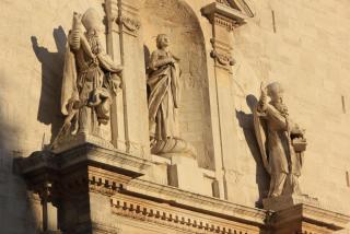 4. На площади Дворца собраний находится одноимённый дворец. По сторонамм большой арки в нишах размещаются добродетели хорошего правительства: Справедливость,Мужество,Благоразумие,Умеренность. За их соблюдением сверху следит Богородица, а вот покровитель Св. Евстафий от этого дела, судя по всему, самоустранился... По бокам дворца башенки с солнечными и обычными часами.